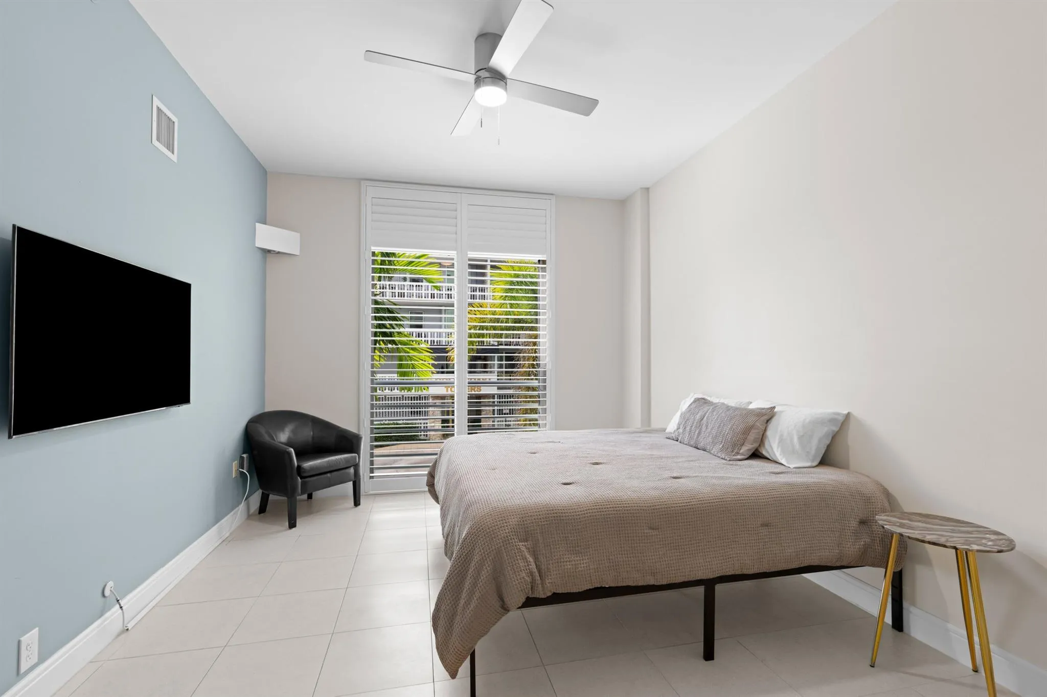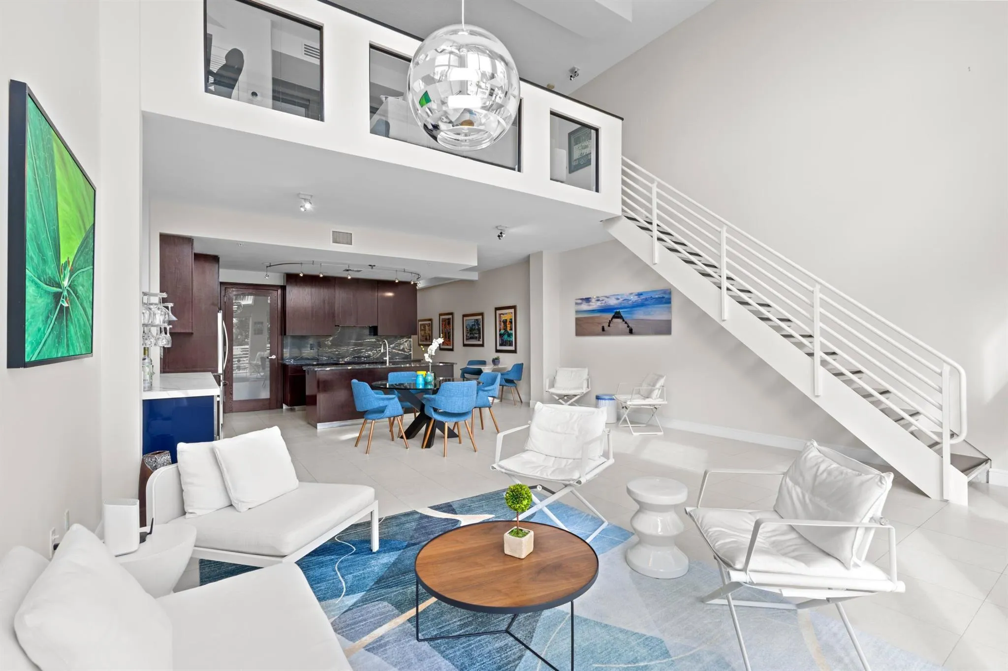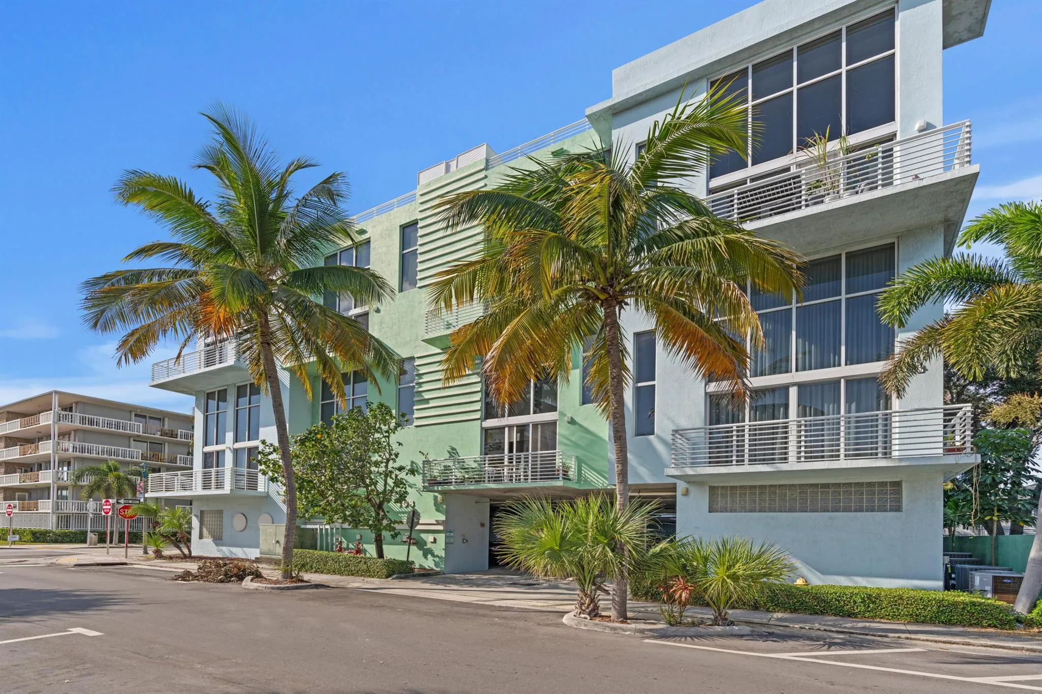 This southeast-facing corner residence at Lake Ave Lofts features over 2,000 square feet of open, light-filled living space, elevated by 20-foot floor-to-ceiling windows and Italian porcelain tile throughout.The main level offers a custom kitchen with marble countertops, high-end appliances, and an island with seating, along with an open dining area, living room, a spacious guest bedroom, and a full bath/powder room.Upstairs, the primary suite has been updated with expanded storage and a reconfigured walk-in closet. An open loft/den adds a versatile secondary living area–ideal for an office or lounge–with views overlooking Lake Avenue toward the Intracoastal.Building amenities include a rooftop pool, private storage, and two covered parking spaces. The location provides easy