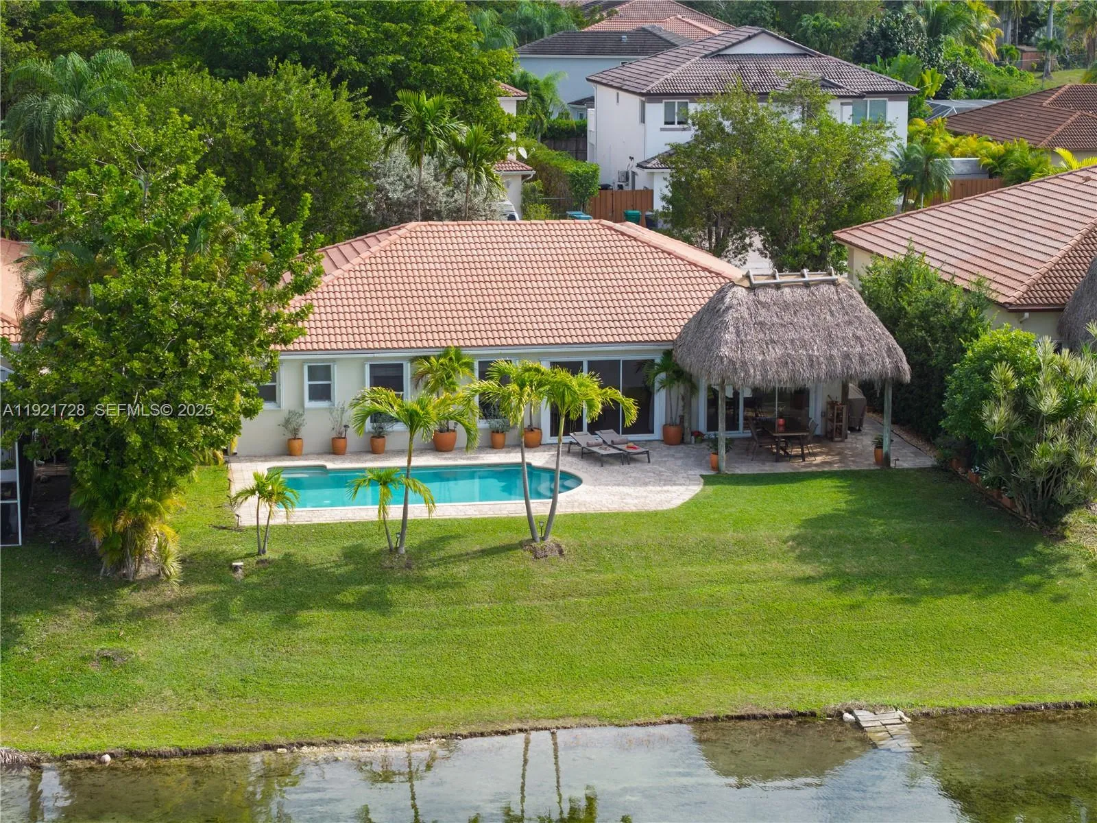 Experience true Florida lakefront living with year-round sunsets!rnLakefront pool home offering a calm, open layout and unobstructed water views from the main living areas and primary suite. Bright interiors, natural tones, and wood accents create a warm atmosphere. The backyard features a covered tiki area with fan, perfect for gatherings, plus a portable grill and a Cuisinart griddle on wheels.rnHouse features 3 bedrooms + office/flex room, 2 bathrooms, impact protection (accordion and/or impact windows), salt-system pool, sprinkler with well, smart alarm, remote lock, auto-on lights, camera system. Pets OK.rnHome is sold FULLY FURNISHED with a warm, natural aesthetic and custom wood furniture, including artisan pieces and quality décor. Some art pieces are not included, but all electronics and fixtures are, making this property truly move-in ready and ideal for relocations. Please tour the house through the ATTACHED PHOTOS.rnHOA is paid quarterly and averages $94/month. It covers lake maintenance and community aesthetics management. Prime location east of Old Cutler Road, close to top schools, parks, and Black Point Marina. Cutler Bay is a booming city in Miami-Dade, with plenty of attractions. The home is located at “Lakes by the Bay” community, close to Turnpike, taking just a 35-minute drive—outside rush hour—to reach Miami International Airport. Built in 1996 under the significantly improved 1994 Building Code. Great opportunity to own this unique home! Easy to show!
