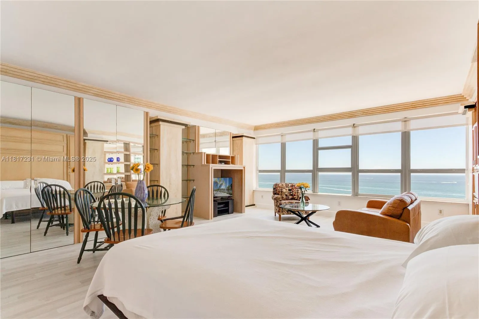 Available for seasonal or long-term rental – Spectacular oceanfront studio unit in the unique Mimo-syle boutique building, the Executive Condo. This fully furnished unit offers direct beach & ocean views, w/ large impact windows to let the bright sunshine in. Unit was just updated with new flooring, WASHER & DRYER in-unit & freshly painted walls. It includes tons of storage space including built-out closet space & cabinets, as well as a brand-new Queen-sized bed, dining room set & comfortable sleeper sofa. If you have dreamed of living with views of the beach & ocean, this is one of the best deals out there! Plus you get to live in one of the city’s most unique, desirable and delightful buildings! 1 assigned parking space not included with rent but available for add’tl $70/m.