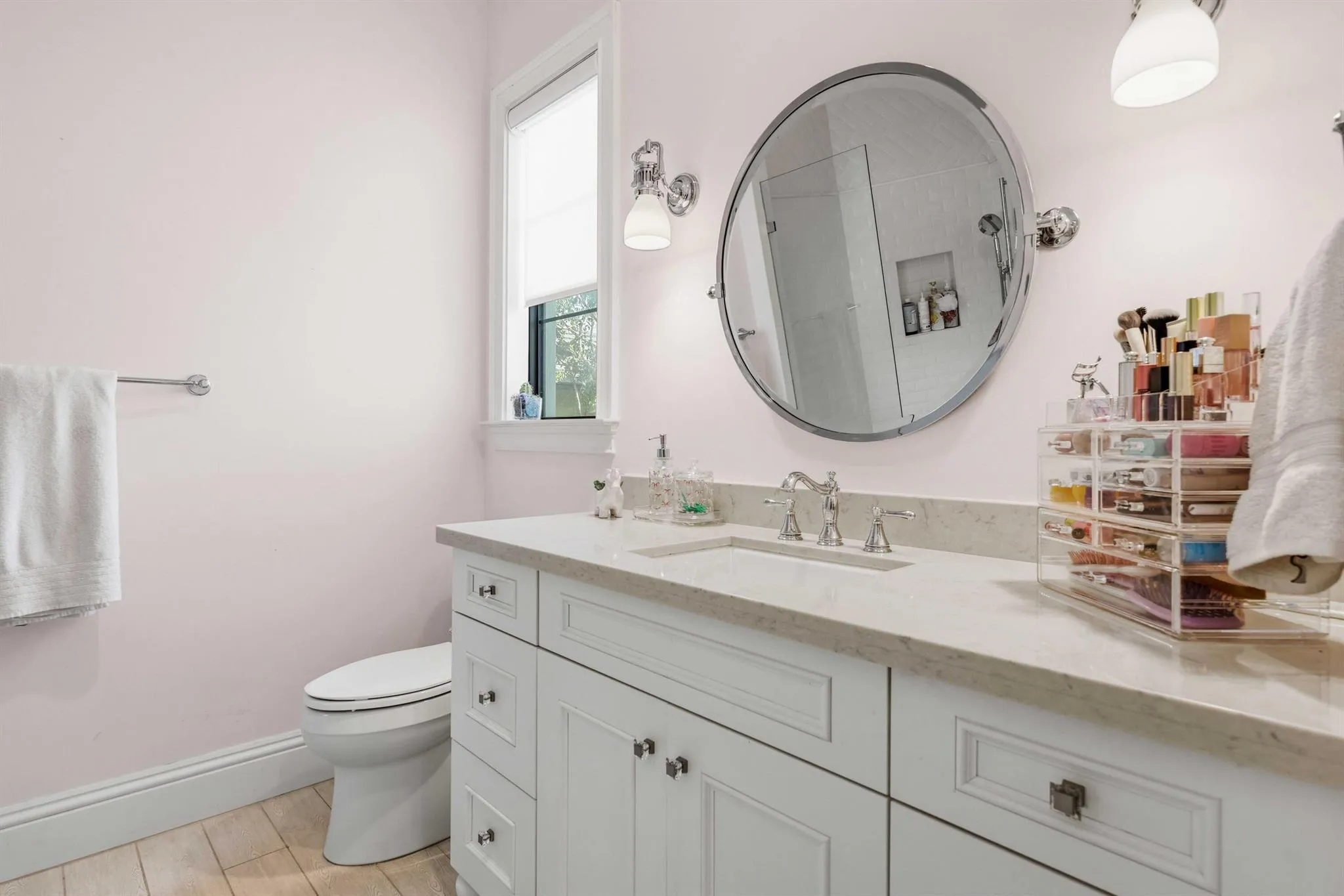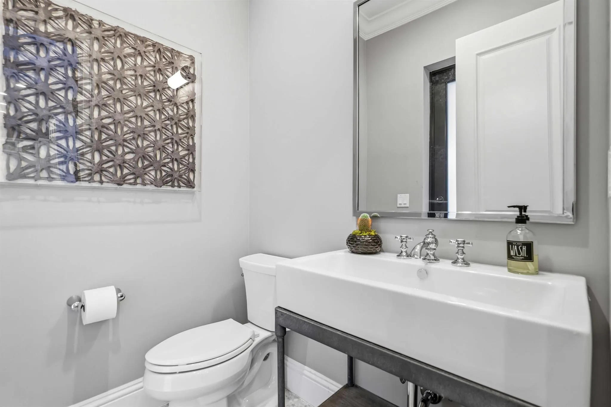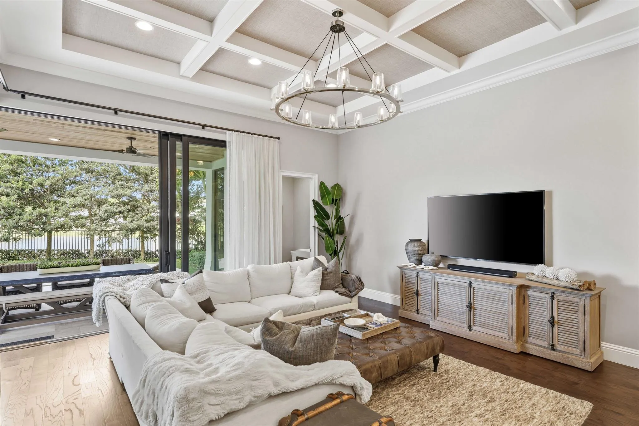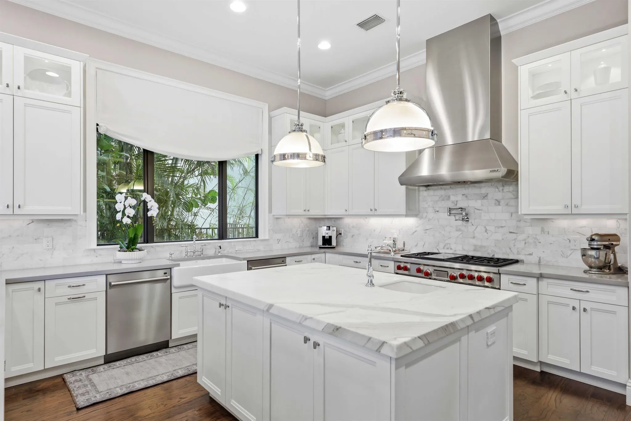 As you enter the home, you are immediately struck by the light streaming in from the stunning backyard, the soaring ceilings, and the thoughtful, high-end finishes. The home boasts a formal living room with tray ceilings and fireplace that flows into an expansive club room/office with beam ceiling detail, a full bathroom, and built-ins. The formal dining room has been outfitted with wainscoting and designer wallpaper and