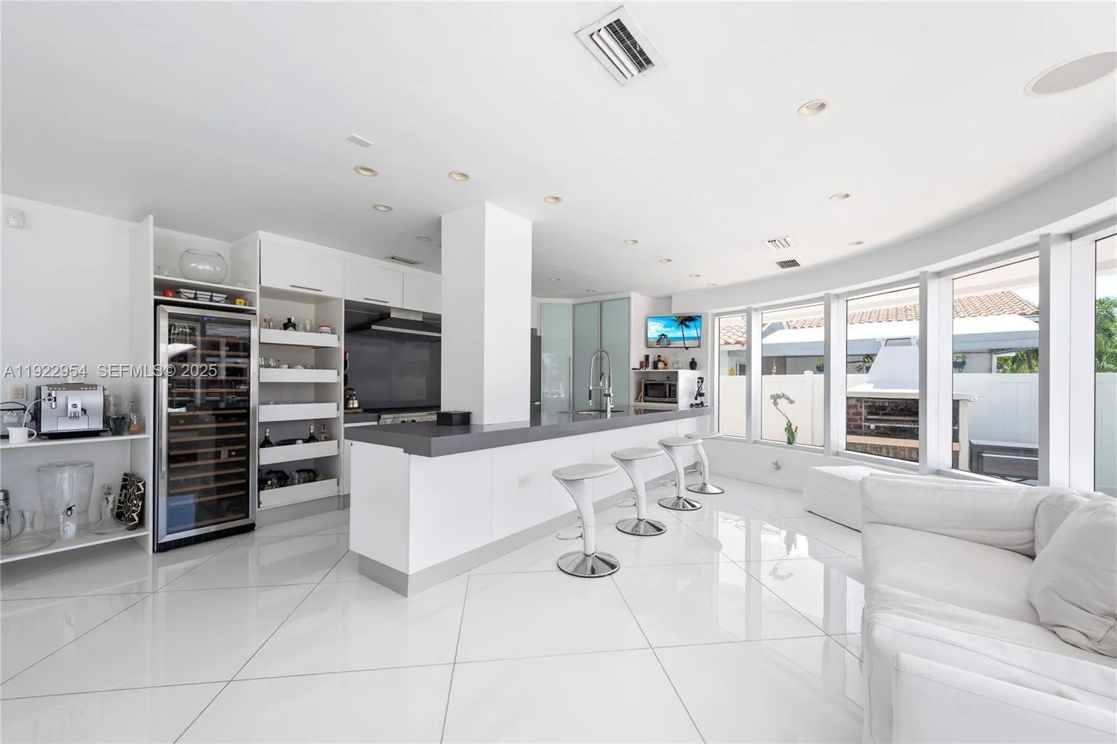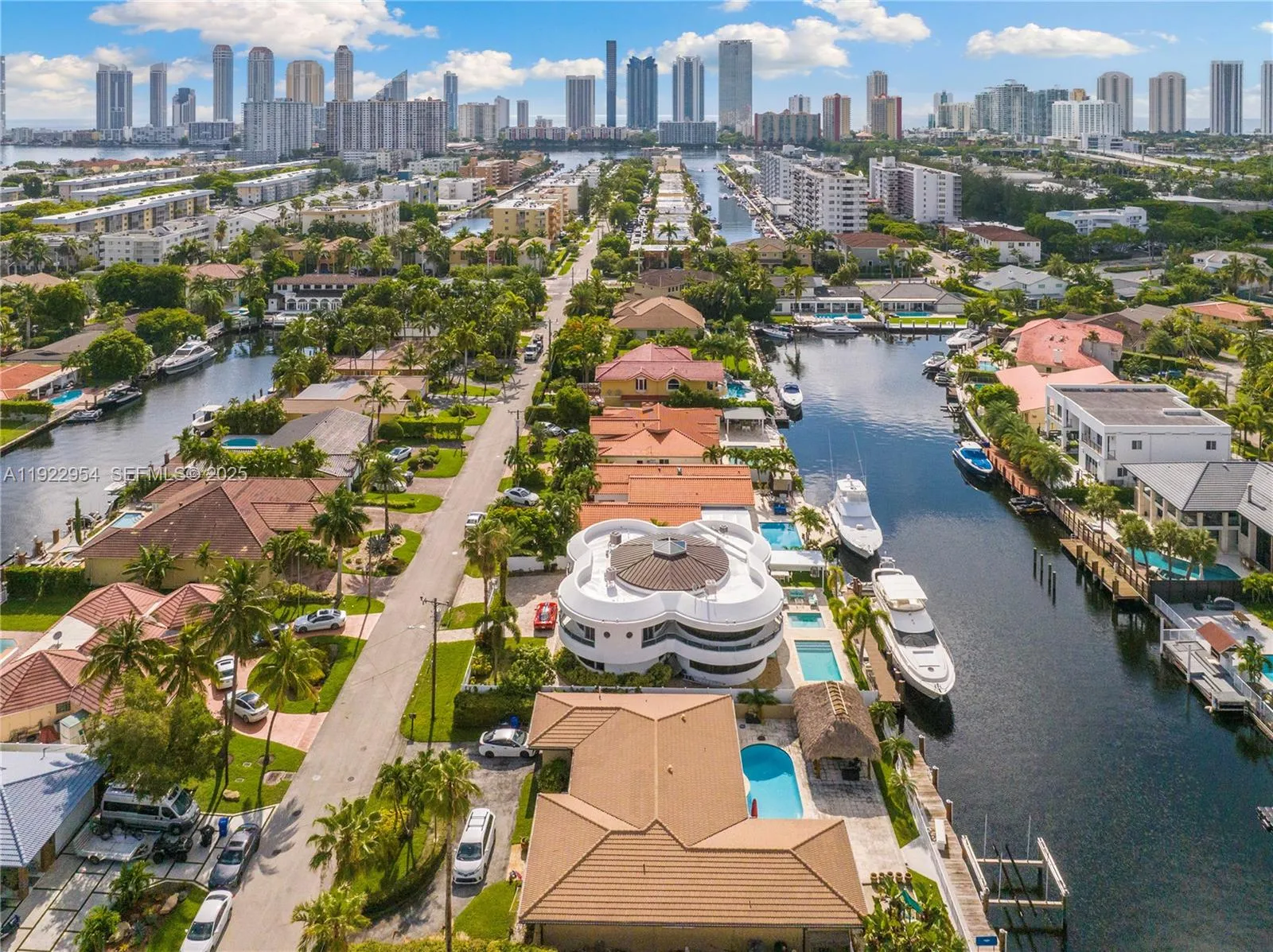 Best-Priced Modern Waterfront Residence in All of Miami Beach. A striking all-white concrete masterpiece with bold Iron Man / Tony Stark–inspired architecture, offering 80 feet of premier water frontage just a short walk to the beach. Located in the exclusive, guard-gated Eastern Shores community of Sunny Isles. This ultra-modern waterfront estate features a rare full concrete perimeter wall, private electric gate, dramatic 20-ft ceilings, and a stunning vaulted skylight that floods the home with natural light. Elegant design details include curved architectural staircases, wraparound terraces, and 36×36 white porcelain flooring throughout.The residence offers 6 bedrooms and 6.5 ensuite baths, including a luxurious primary suite with its own private terrace, jet spa tub, and dual walk-in closets. A fully integrated $180k Crestron Smart Home system, controlled by 3 iPads and smartphone-enabled, seamlessly manages intelligent color-changing lighting, 28 built-in speakers, climate, security, and more.rnOutdoor living is elevated with a waterfront pool and hot tub, outdoor brick oven, covered entertainment patio with ceiling fan, and a 2-car supercar garage. Perfectly situated minutes from the beach, shopping, dining, Aventura, Bal Harbour, Miami International Airport, and South Beach. A modern fortress of design and technology—unmatched at this price point