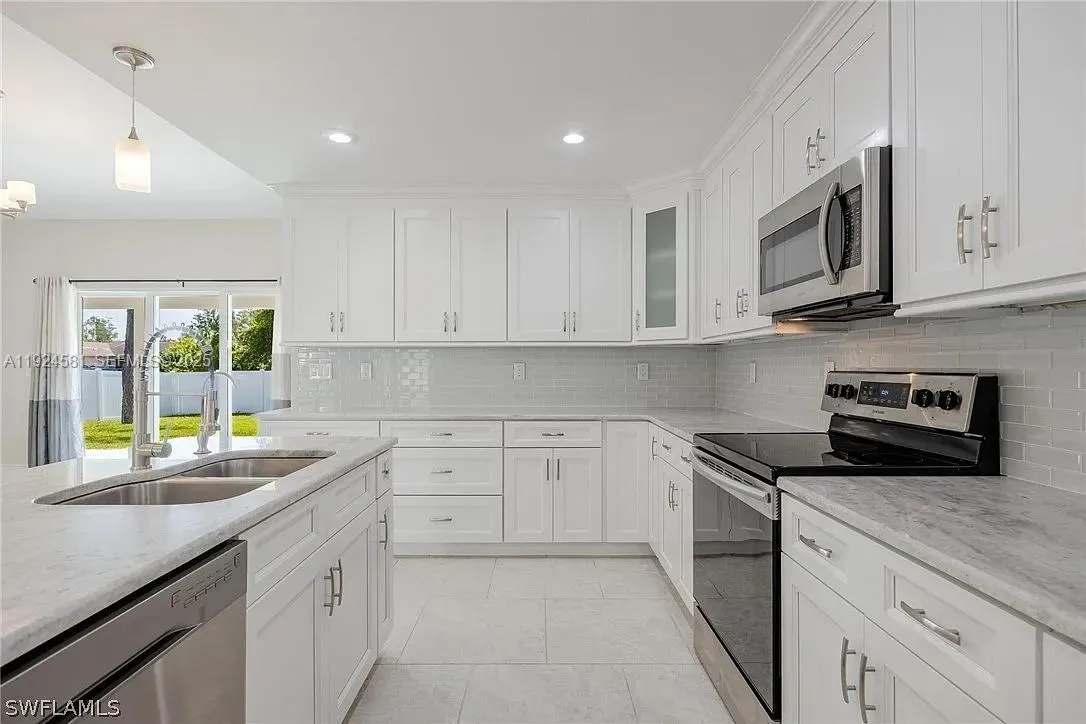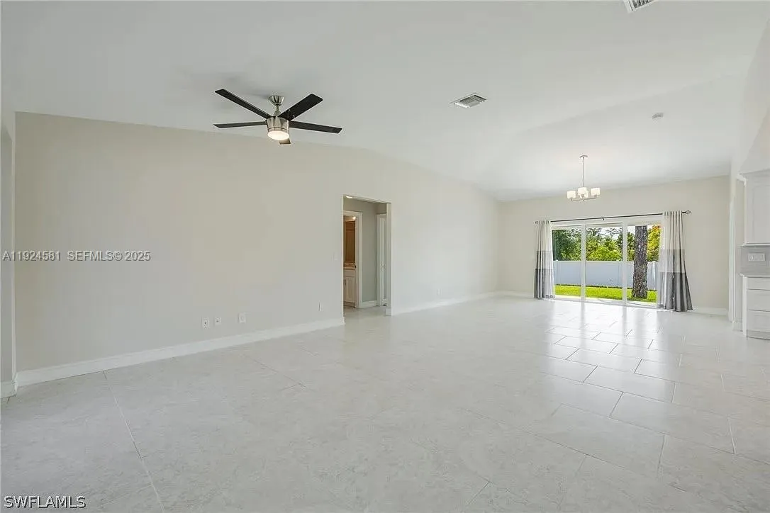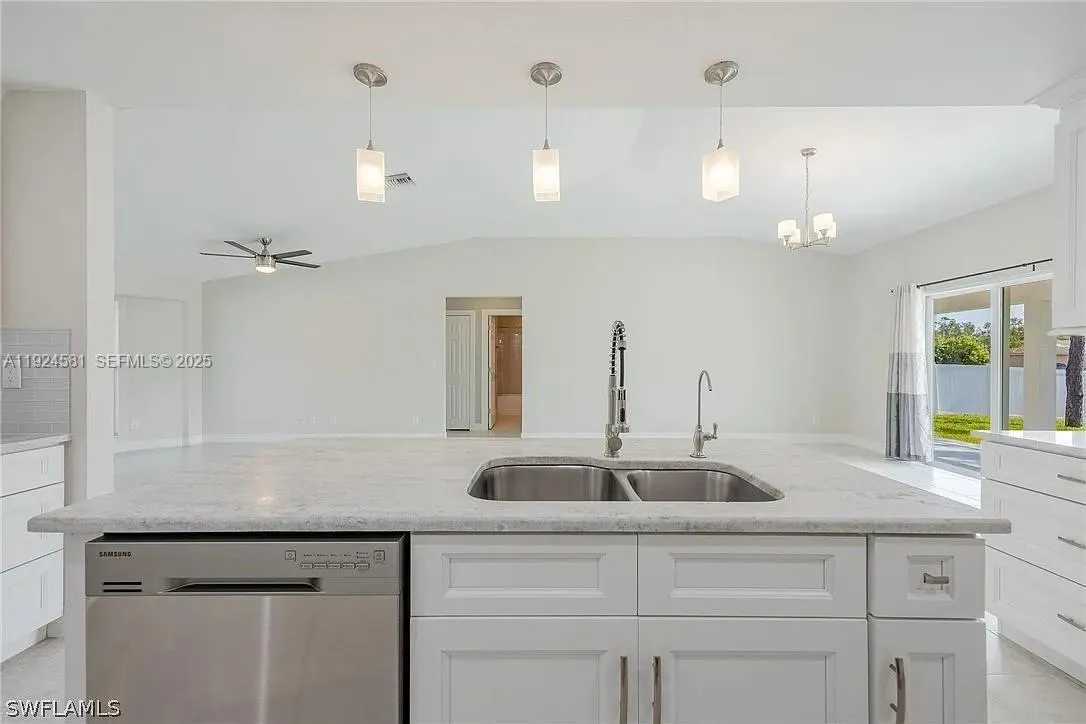 Welcome to your dream home! This charming 3 bedroom, 2 bathroom home is perfectly situated on a serene canal lot, built with modern concrete block construction, boasts enhanced curb appeal with a pavered driveway, entry walk, and front porch.rnStep inside to discover a freshly painted interior with volume ceilings and tile flooring throughout the living areas. The bright and beautiful kitchen is a chef’s delight, showcasing stunning granite countertops, an eye-catching backsplash, and stainless steel appliances, including a dishwasher, microwave, range, refrigerator, and disposal. Adjacent to the kitchen, the washer and dryer offer added convenience, making laundry tasks a breeze.rnThe master suite is a true retreat, offering slider access to an open lanai where you can enjoy the SWFL evenings. The suite includes a generous walk-in closet and the most spacious ensuite bathroom, complete with a luxurious walk-through shower and double vanities, perfect for unwinding after a long day. The guest bedrooms are with cozy carpet, ensuring comfort and warmth. They share a guest bathroom situated between them. The backyard is a peaceful oasis, with a privacy fence and offering ample room for a pool. The attached 2-car garage features a side door entrance, laundry tub, and an epoxy floor, providing both functionality and style.rnNo flood insurance is required. Professionally cleaned and move-in ready, this gem is just waiting for your personal touch to make it your own.