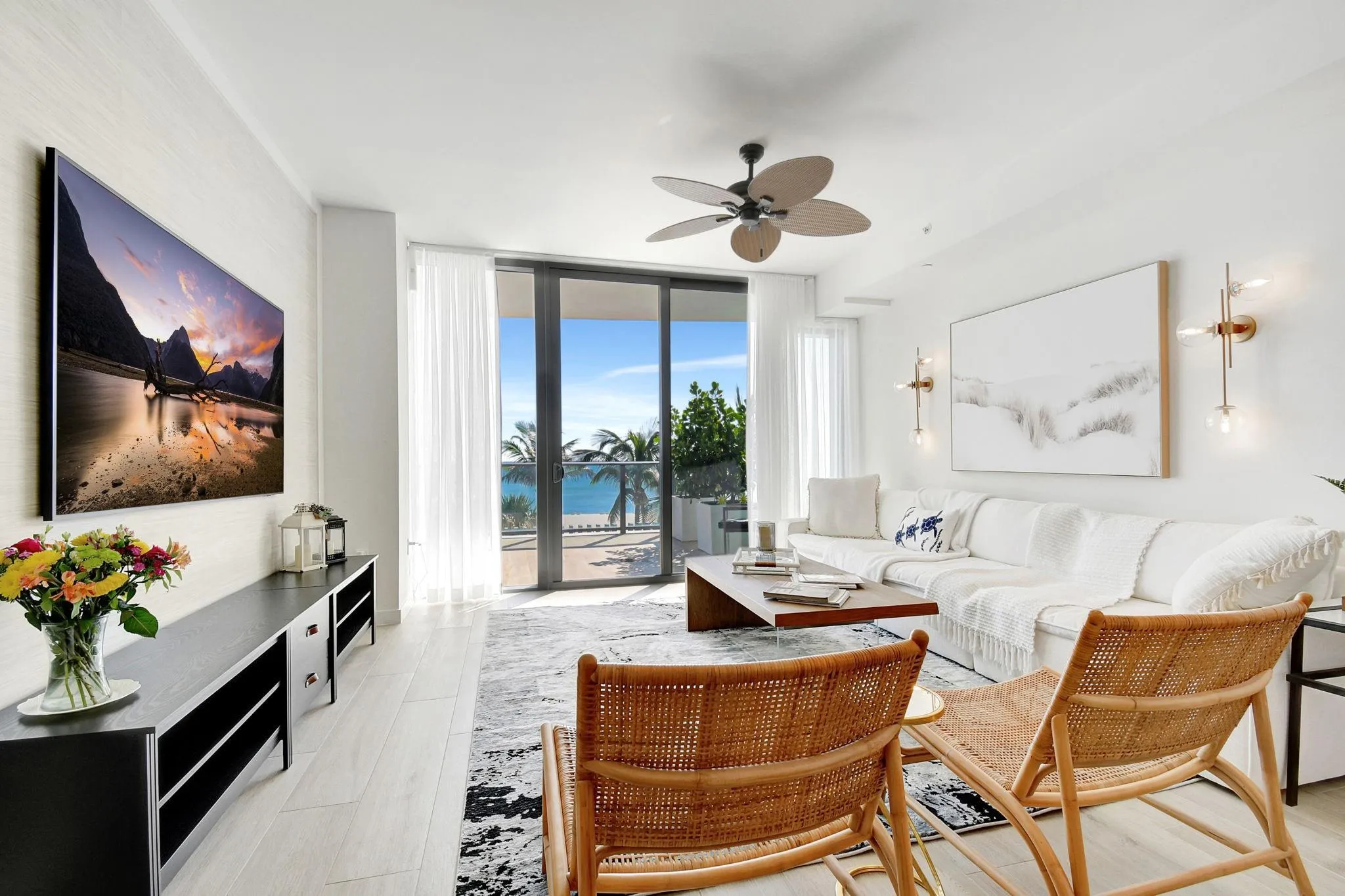 Fully Furnished Beachfront condo that lives live a villa. Spacious 2/2.5+den overlooking the beach and ocean, with one of the largest balconies on the beach. Tastefully furnished throughout with modern coastal finishes. Guest bedroom features oversized patio with private access to sunset pool deck and gardens. Italian kitchen cabinetry, Wolf + Sub-Zero appliances, gas range, wine fridge and Espresso Machine. Resort amenities: 2 pools, spa treatment rooms and services, wine tasting room, state of the art gym, screening room, club room with catering kitchen, bbq areas, fire pits, pavilions, cabanas, breakfast cafe with coffee and light bites, concierge, 24/7 valet. Pet friendly. Close to beachfront and waterfront dining, boat club, Hillsboro Inlet and more. Available short & long term