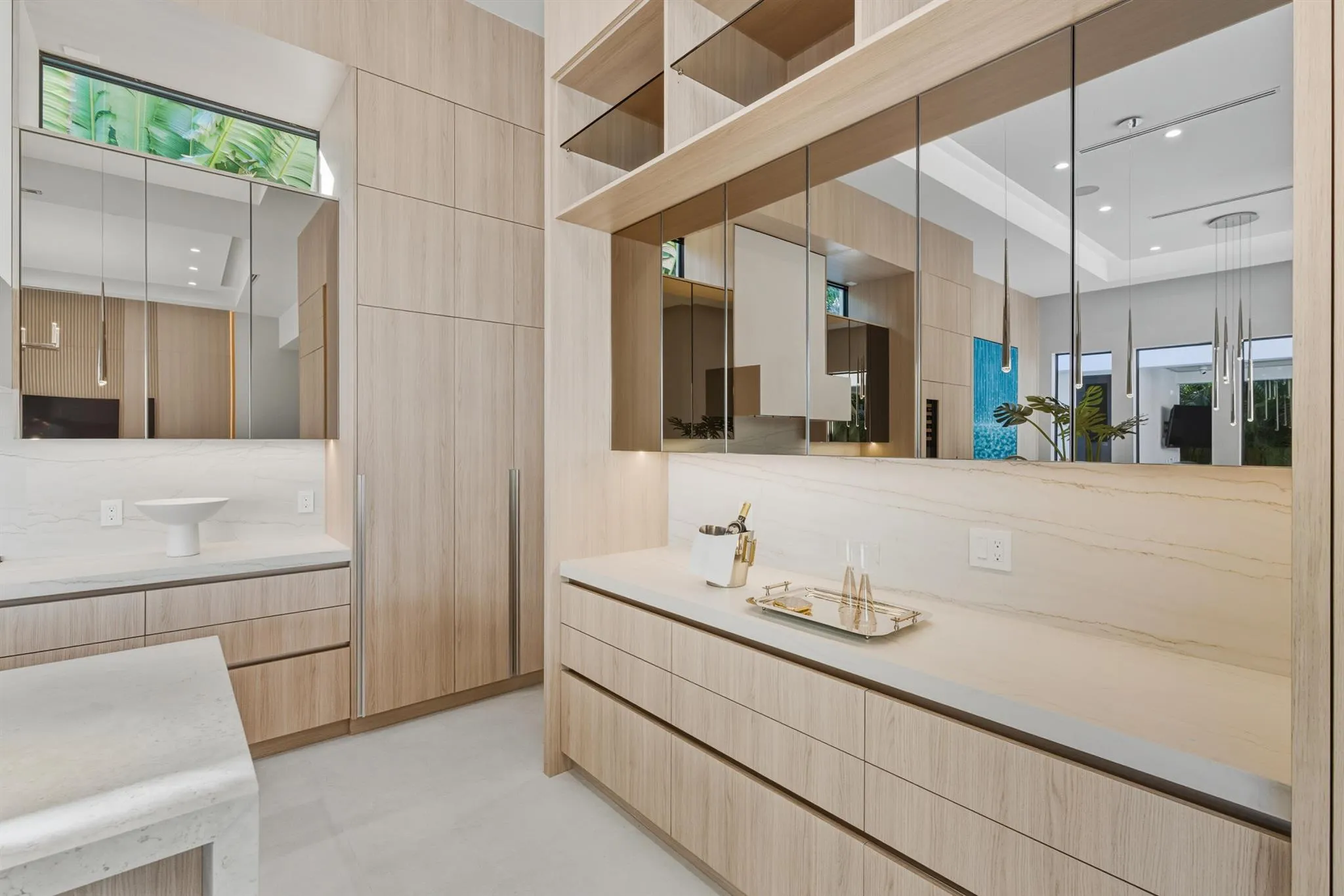 From the moment you step inside, it’s clear this is no ordinary Mizner Park residence. A grand foyer, an impressive executive office, and a true first-floor primary suite set the tone for a home that feels equally extraordinary whether you’re enjoying a quiet evening in or hosting an unforgettable night with friends. Sunlit interiors blur the line between indoors and out, yet retain an inviting warmth–perfect for a cozy movie night with candles glowing and slippers on. Thoughtfully designed for both everyday living and elevated entertaining, the home offers five ensuite bedrooms, including a sumptuous first-floor primary. Upstairs, four grand suites surround a spacious secondary living area, ideal for guests, family, or a private retreat. The open-concept great room flows —