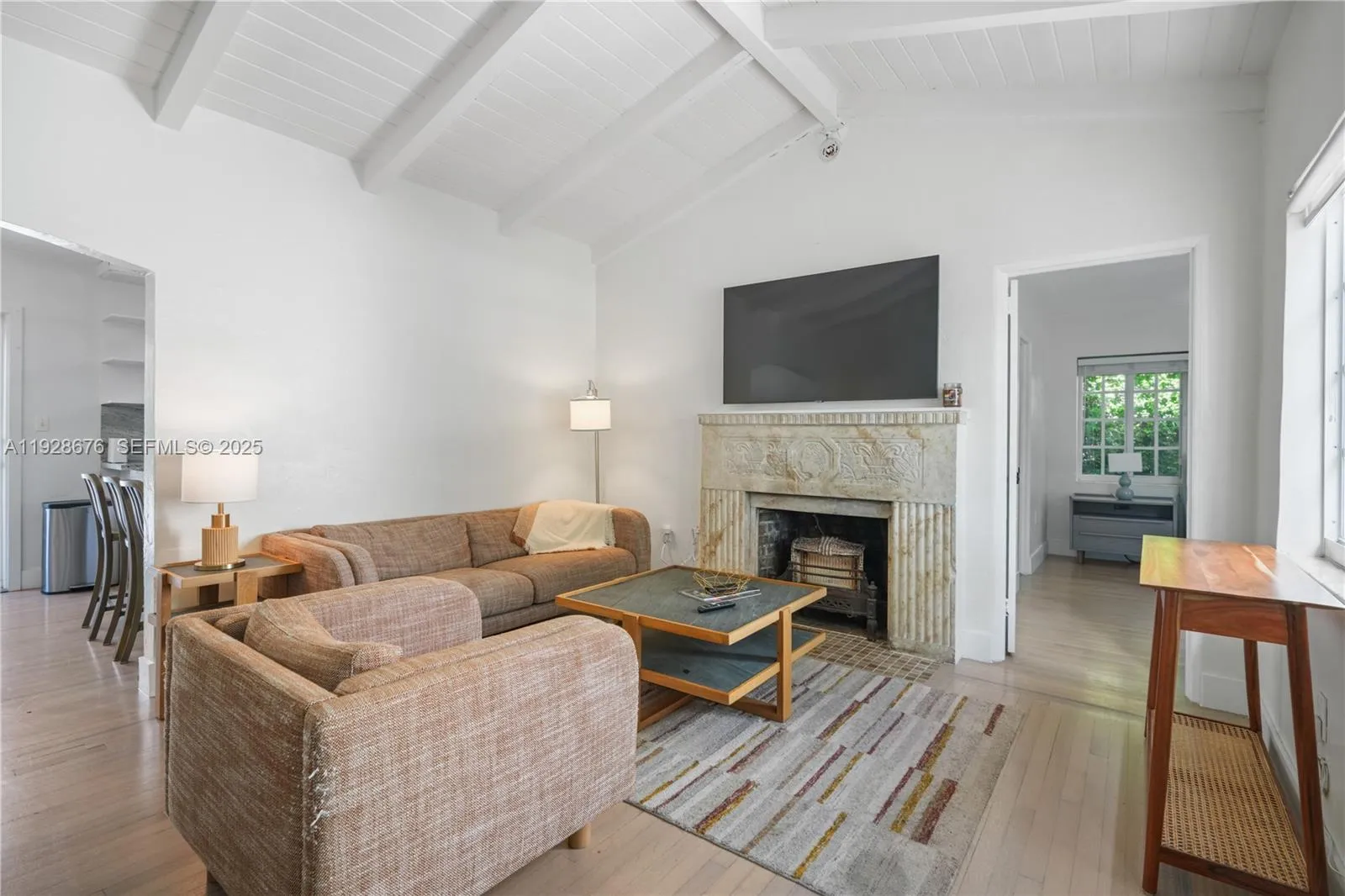 This Mediterranean-style corner home features full hurricane-impact windows and doors, including a new impact sliding glass door off the kitchen. Totaling approximately 1,875 sq. ft. including the garage, the property offers a newly built 20×40 heated pool with a digitally controlled Wi-Fi hot spa and a freshly painted exterior. Inside, the home showcases cathedral ceilings, abundant natural light, updated finishes, stainless steel appliances, and turnkey furnishings that may remain. The layout includes three spacious bedrooms—two with queen beds and one with a king—along with two modern full bathrooms with jet showers. Additional features include a dining area with seating for eight, an alcove currently used as an office and daybed space, and a decorative mantel-style fireplace. A two-car garage, an enclosed backyard, and a front yard complete this well-maintained property.