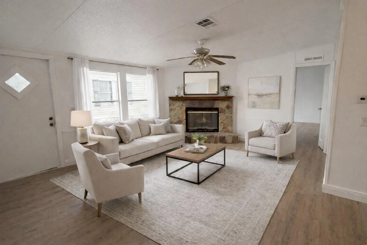Tucked away at the end of a quiet cul-de-sac, this recently upgraded 4 bedroom manufactured home offers privacy on an oversized lot surrounded by natural foliage truly giving the feeling of living in your own peaceful woodland retreat. The spacious great room welcomes you with a charming rustic fireplace, creating the perfect setting for relaxing evenings or gatherings. The home’s thoughtful updates enhance both comfort and functionality, making it move-in ready. Step outside to a huge, fully fenced backyard, ideal for entertaining, play, pets, or simply enjoying the serenity of nature. With no rear/side neighbors, a level of tranquility and space that’s hard to find. A unique opportunity to enjoy privacy, space, and a warm, inviting home in a truly special setting