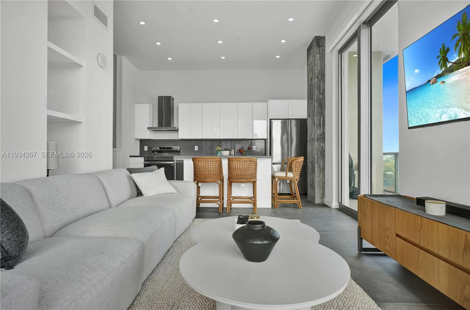 Unique Midtown Loft. Fully renovated 1,100 sq ft duplex corner loft. Industrial style, with exposed concrete features, stone tile floors, floor-to-ceiling windows, Lutron blinds, and over 600 sq ft of wraparound terraces on two floors. The unit has a modern kitchen with large island and brand new appliances, new bathrooms, a laundry room, same floor parking space, and space for storage, a home office or a dressing room. This unique residence blends contemporary design with functionality, perfect for buyers seeking a turnkey urban lifestyle. Situated in a full-service building, residents enjoy premium amenities and a prime location with unmatched walkability to shops, restaurants, cafés, and just minutes from the Design District and Wynwood, as well the I95, so the beach is only 10 minutes away. Available April 15