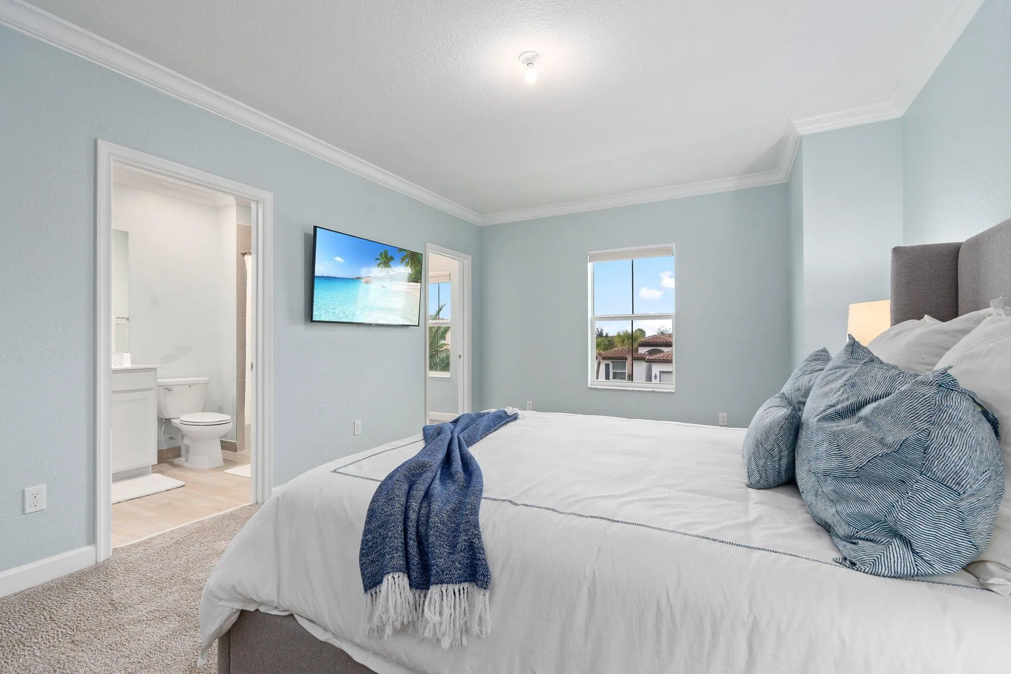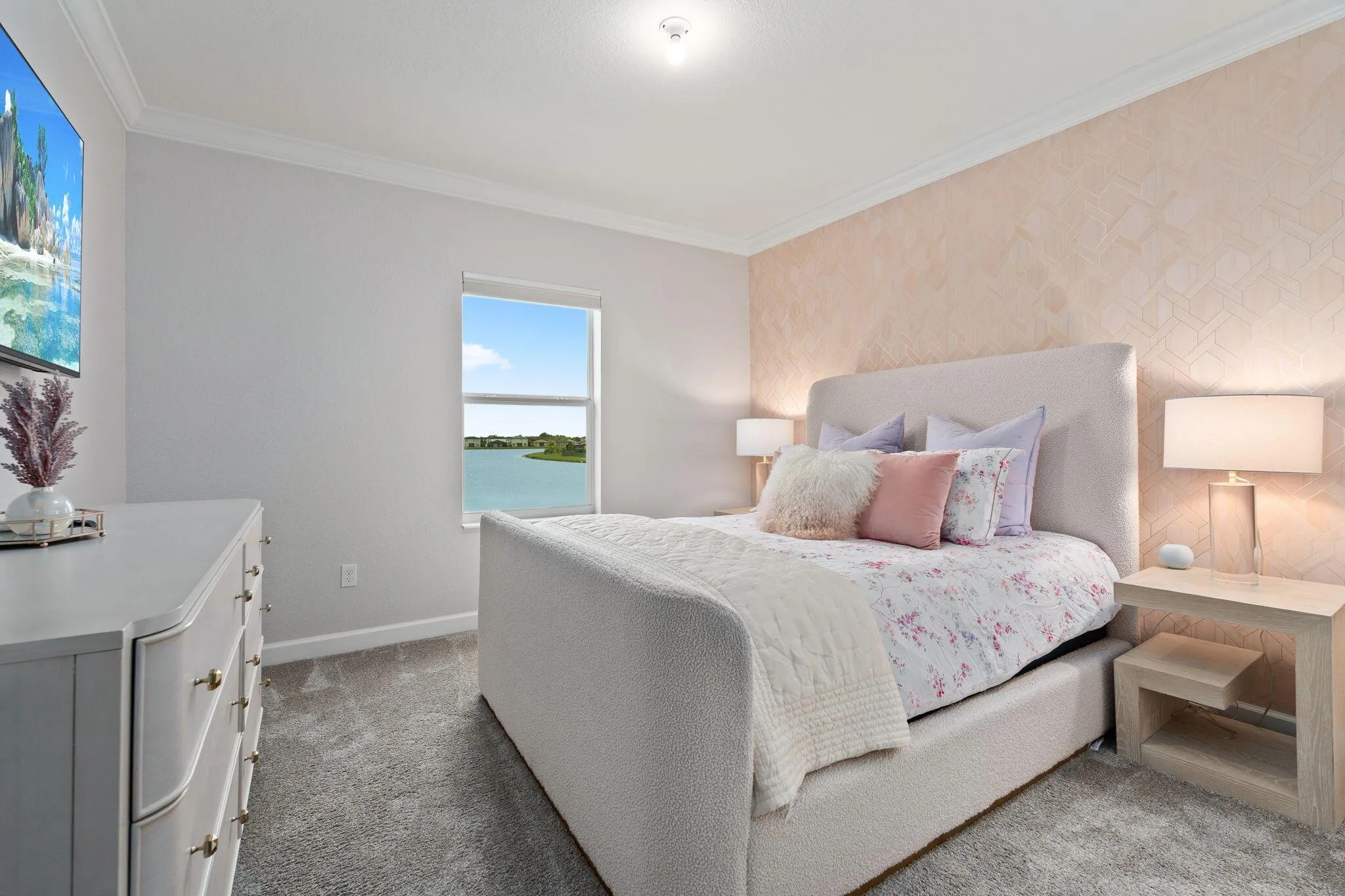 Step into refined luxury in one of the community’s largest and most sought-after models, positioned on an oversized lakefront lot with breathtaking sunset views. Built in 2021 and offering over 3,300 square feet of thoughtfully designed living space, this stunning 5-bedroom, 4-bath residence delivers elegance, comfort, and modern sophistication. The layout is both grand and functional, featuring a full bedroom and bath on the main level, ideal for guests or multigenerational living, a sprawling loft upstairs that creates the perfect flex space for media, work, or relaxation. A 3-car garage and 12,000+ sq ft lot w/ plenty room for a pool. Inside, no detail has been overlooked. Top-tier, designer upgrades include elegant crown molding throughout, brand-new tile floors and plush carpeting