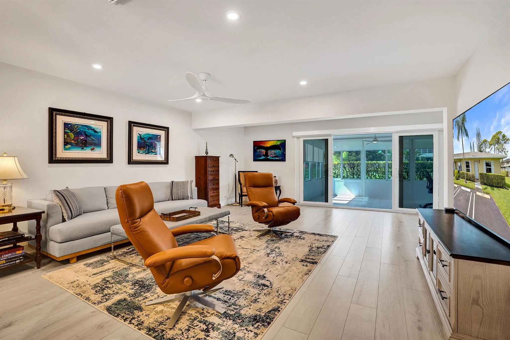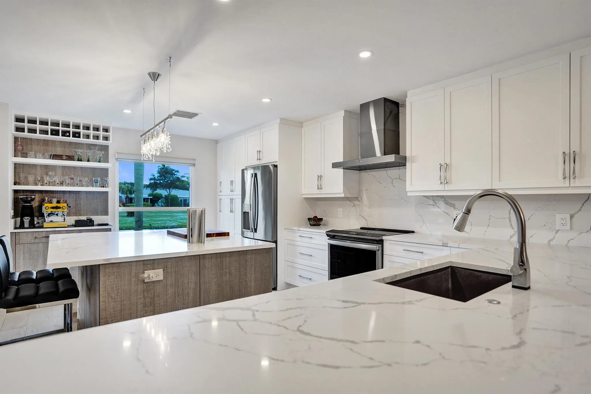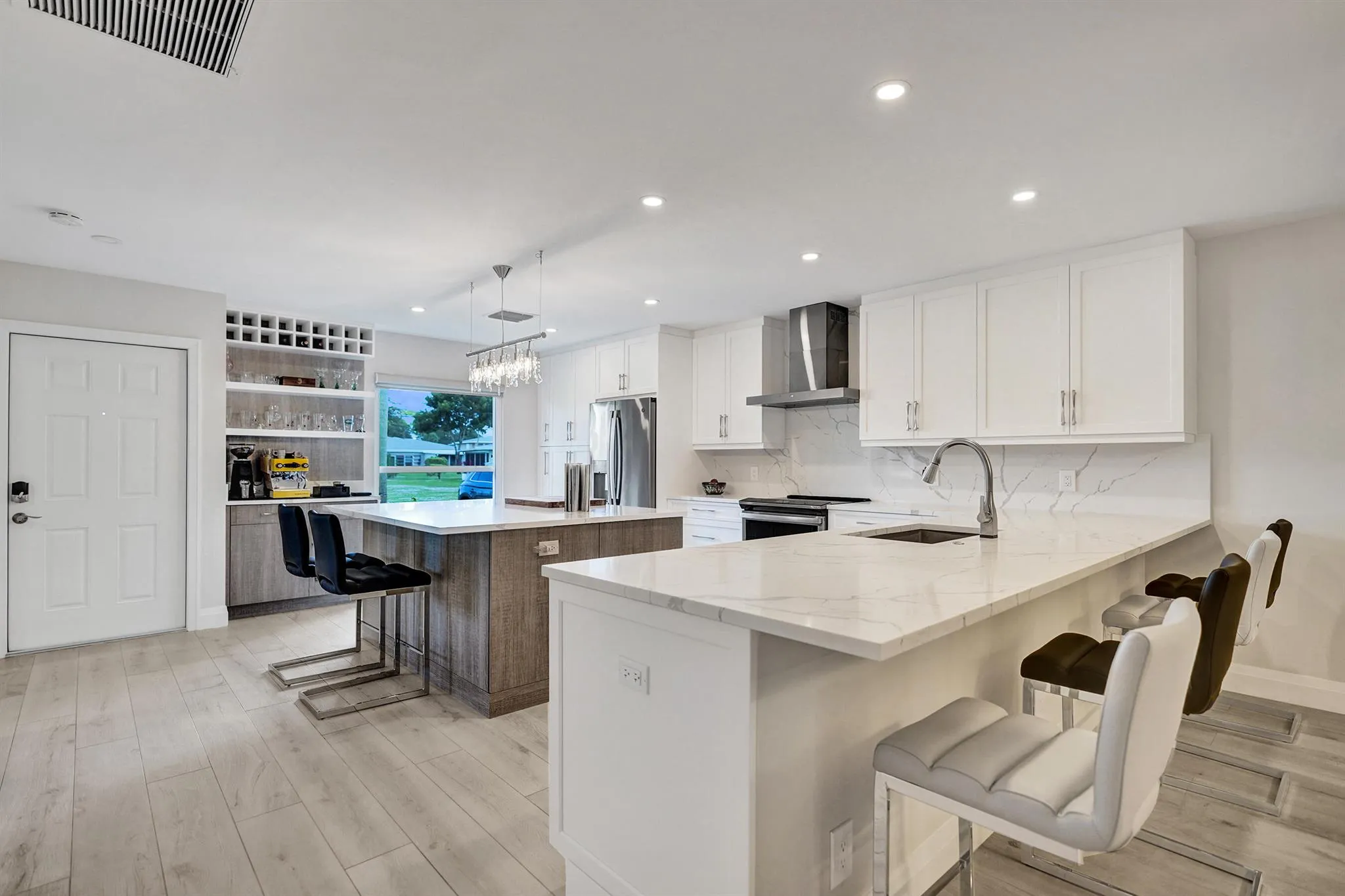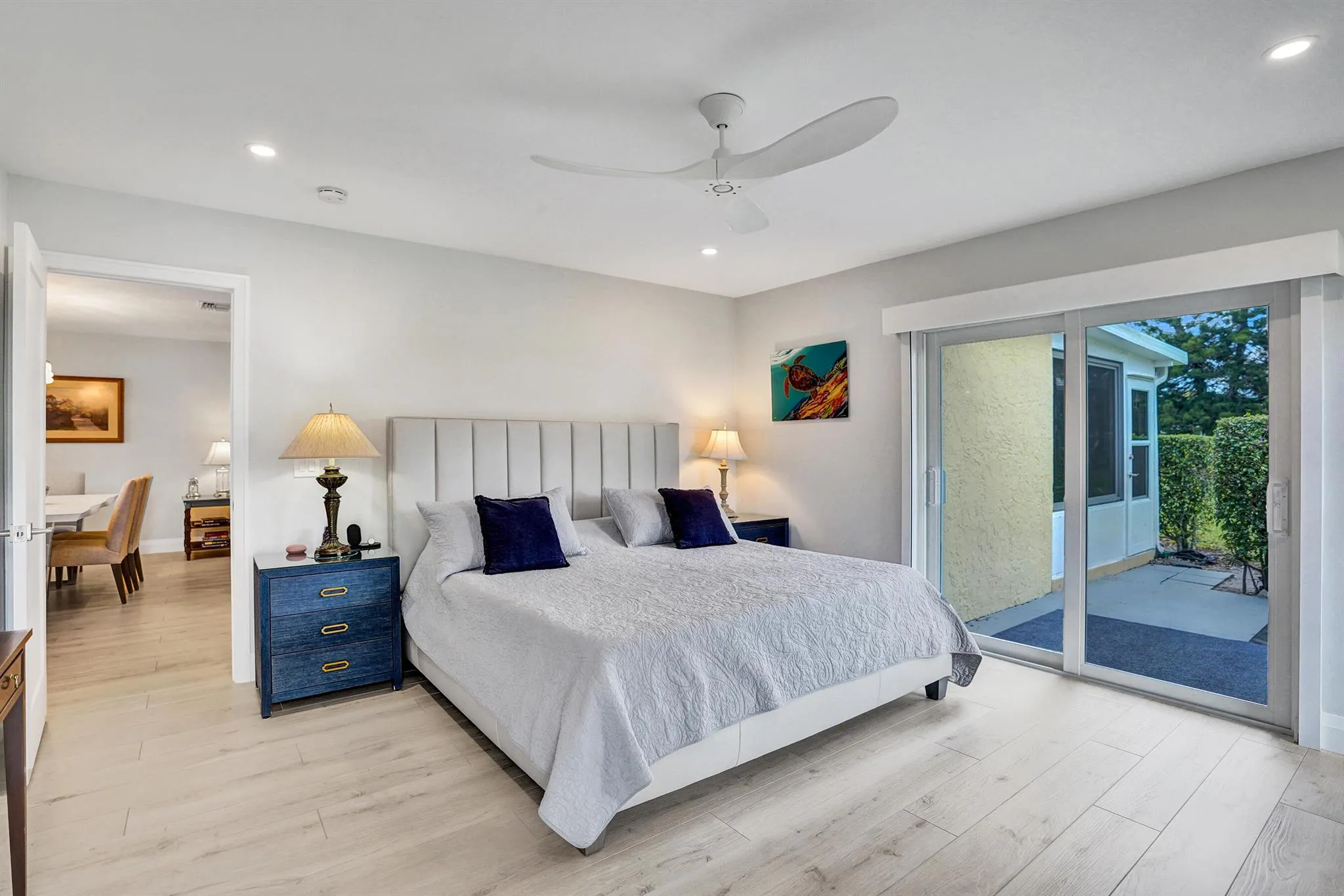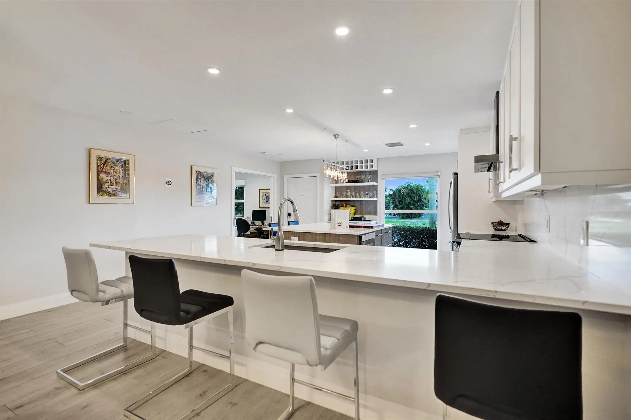 Ultra-rare oversized luxury corner villa, meticulously updated and spanning an impressive 1,466 square feet of living space. The seamless indoor-outdoor flow is accentuated by sliding impact glass doors leading from the living room to a 160-sqft patio, complete with tall horizontal sliding windows. The master bedroom also features direct access to a private hedged patio, enhancing your personal retreat. The gourmet kitchen is a chef’s dream, showcasing Calacatta Laza White Quartz countertops and high-end Eurocraft cabinetry. Luxurious bathrooms offer premium fixtures including a frameless walk-in shower and an Aria Fluerco soaking tub. With PGT impact windows and doors throughout, this home ensures safety and tranquility while exuding elegance at every turn.