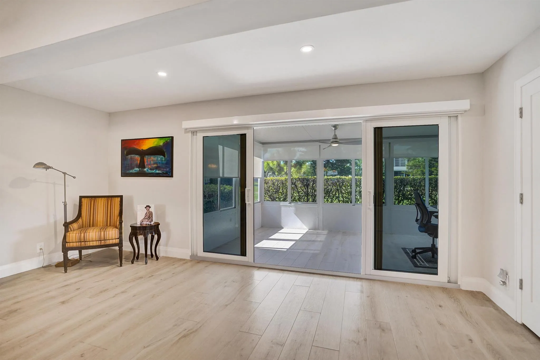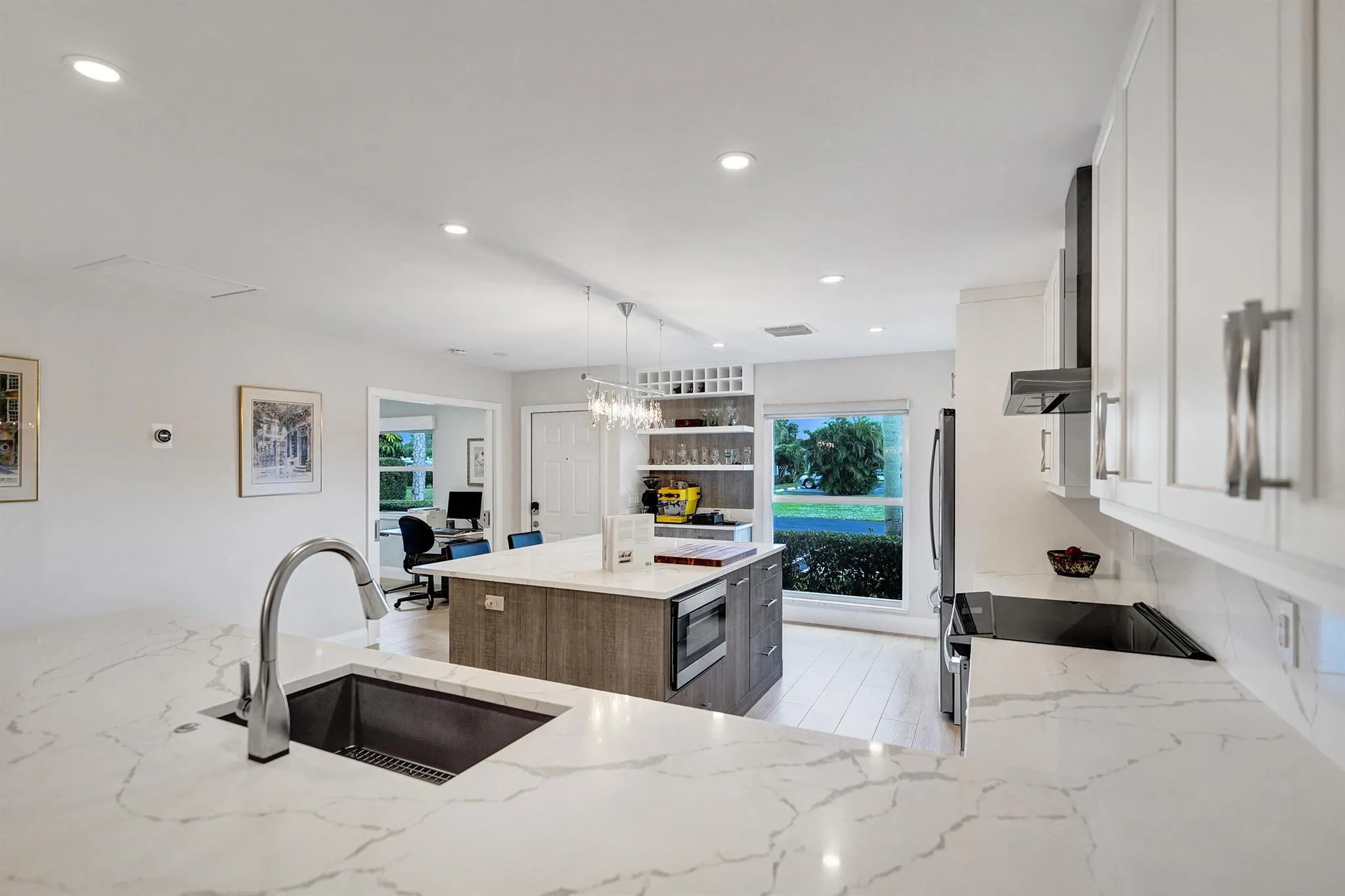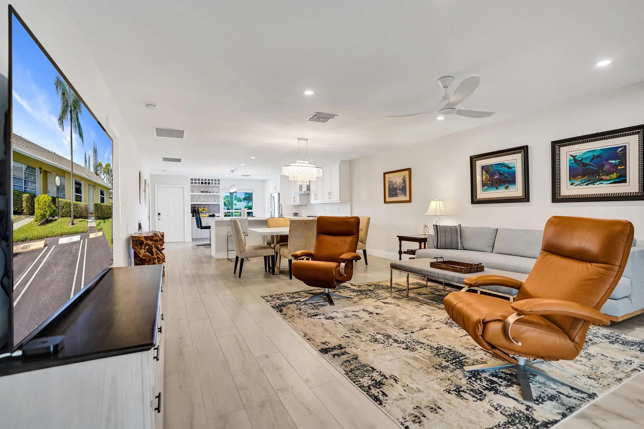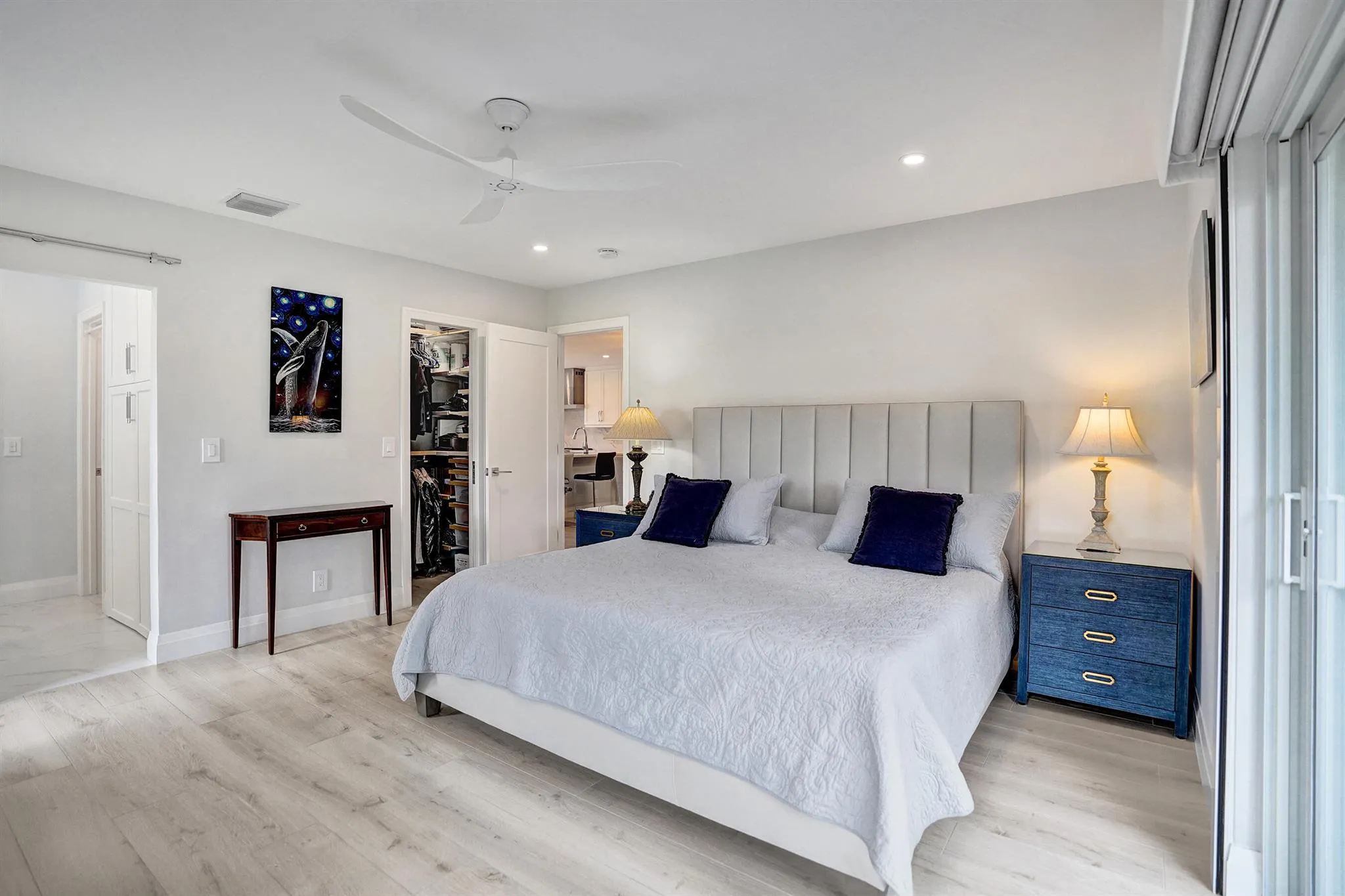 Ultra-rare oversized luxury corner villa, meticulously updated and spanning an impressive 1,466 square feet of living space. The seamless indoor-outdoor flow is accentuated by sliding impact glass doors leading from the living room to a 160-sqft patio, complete with tall horizontal sliding windows. The master bedroom also features direct access to a private hedged patio, enhancing your personal retreat. The gourmet kitchen is a chef’s dream, showcasing Calacatta Laza White Quartz countertops and high-end Eurocraft cabinetry. Luxurious bathrooms offer premium fixtures including a frameless walk-in shower and an Aria Fluerco soaking tub. With PGT impact windows and doors throughout, this home ensures safety and tranquility while exuding elegance at every turn.