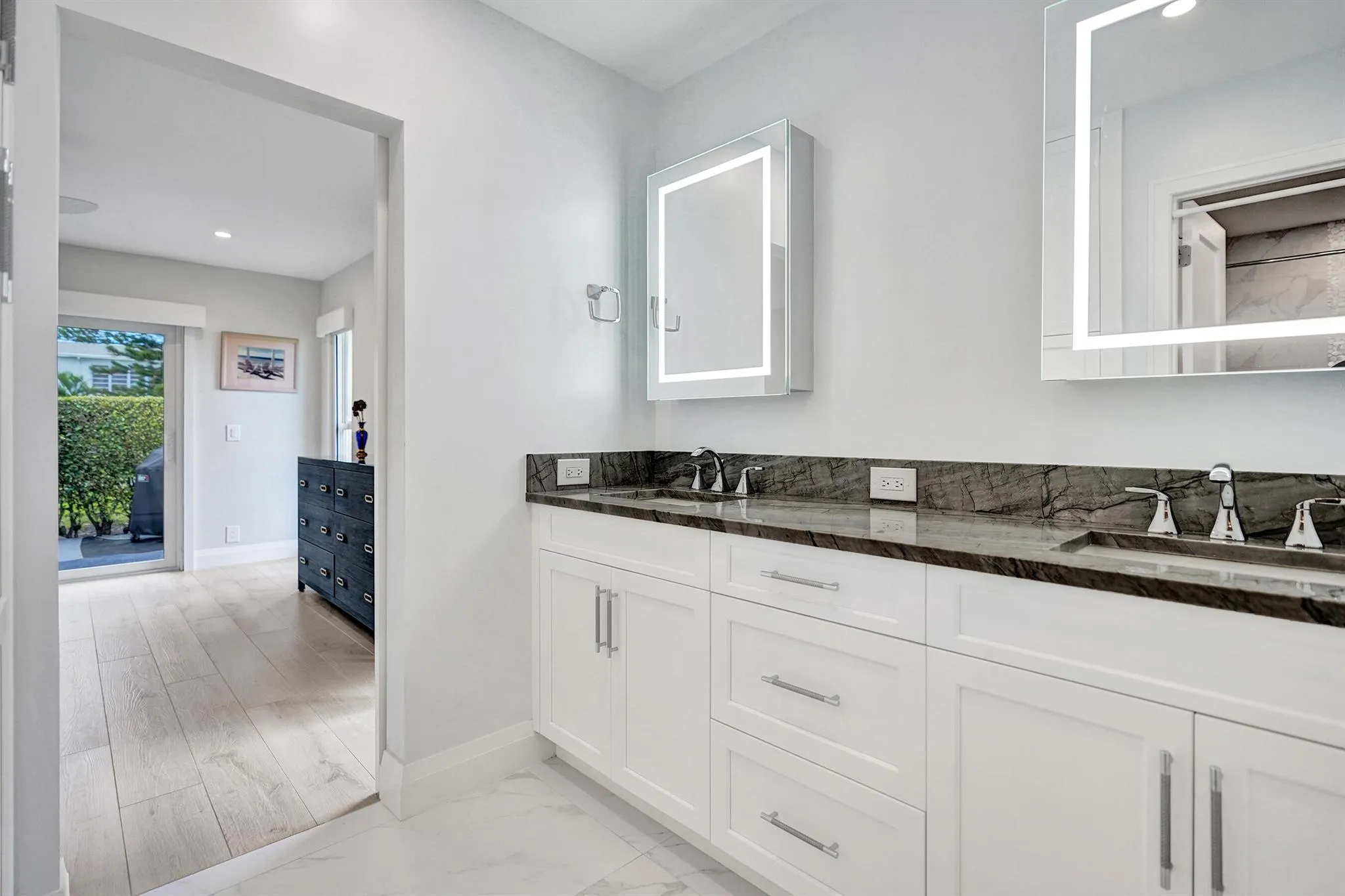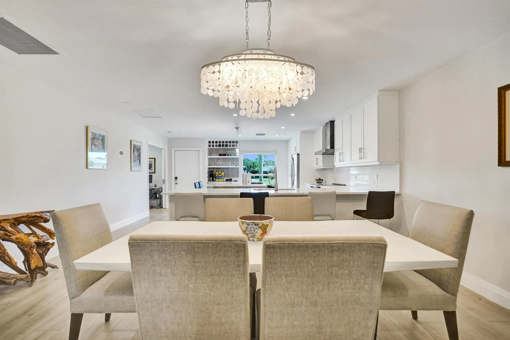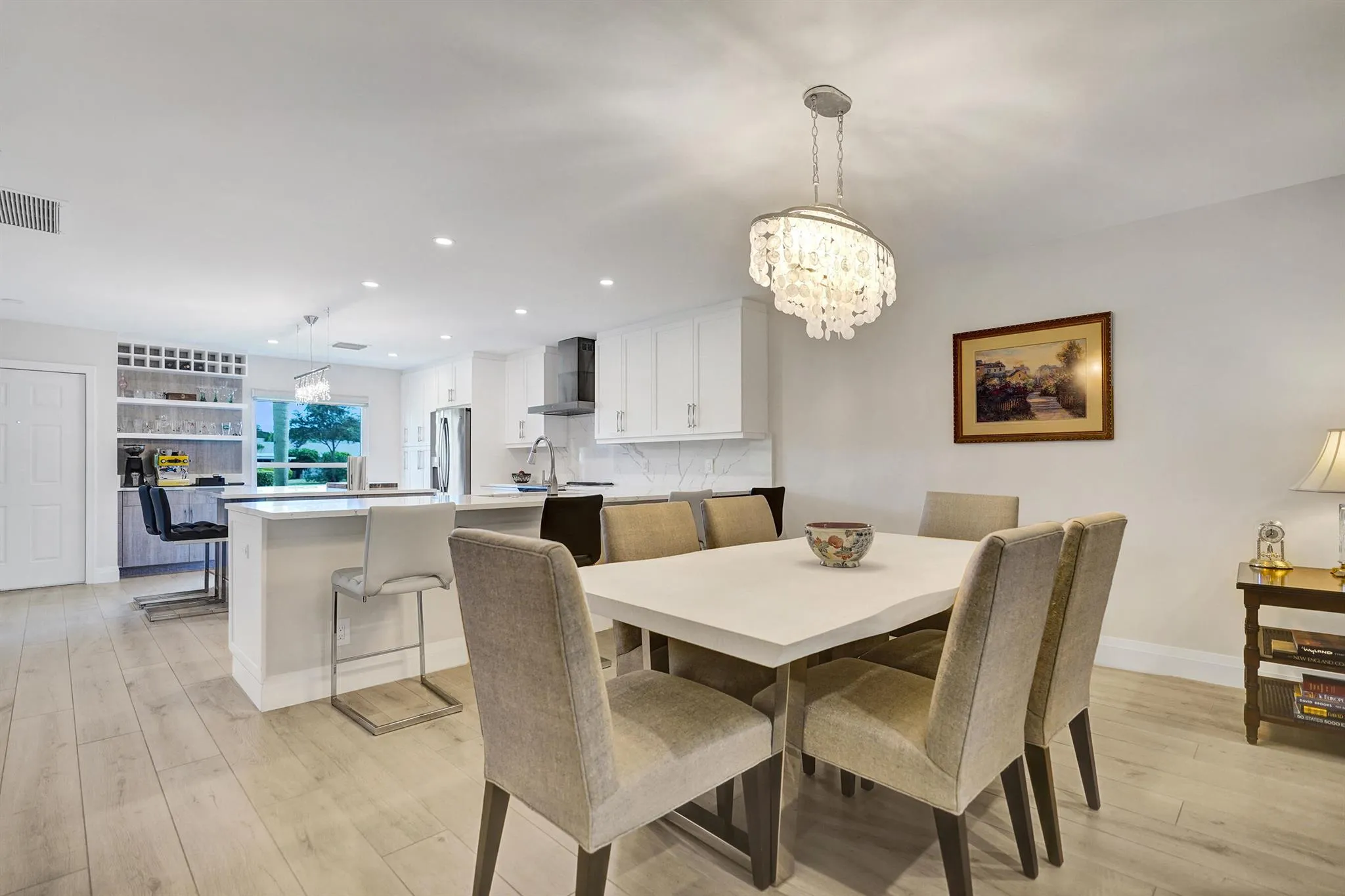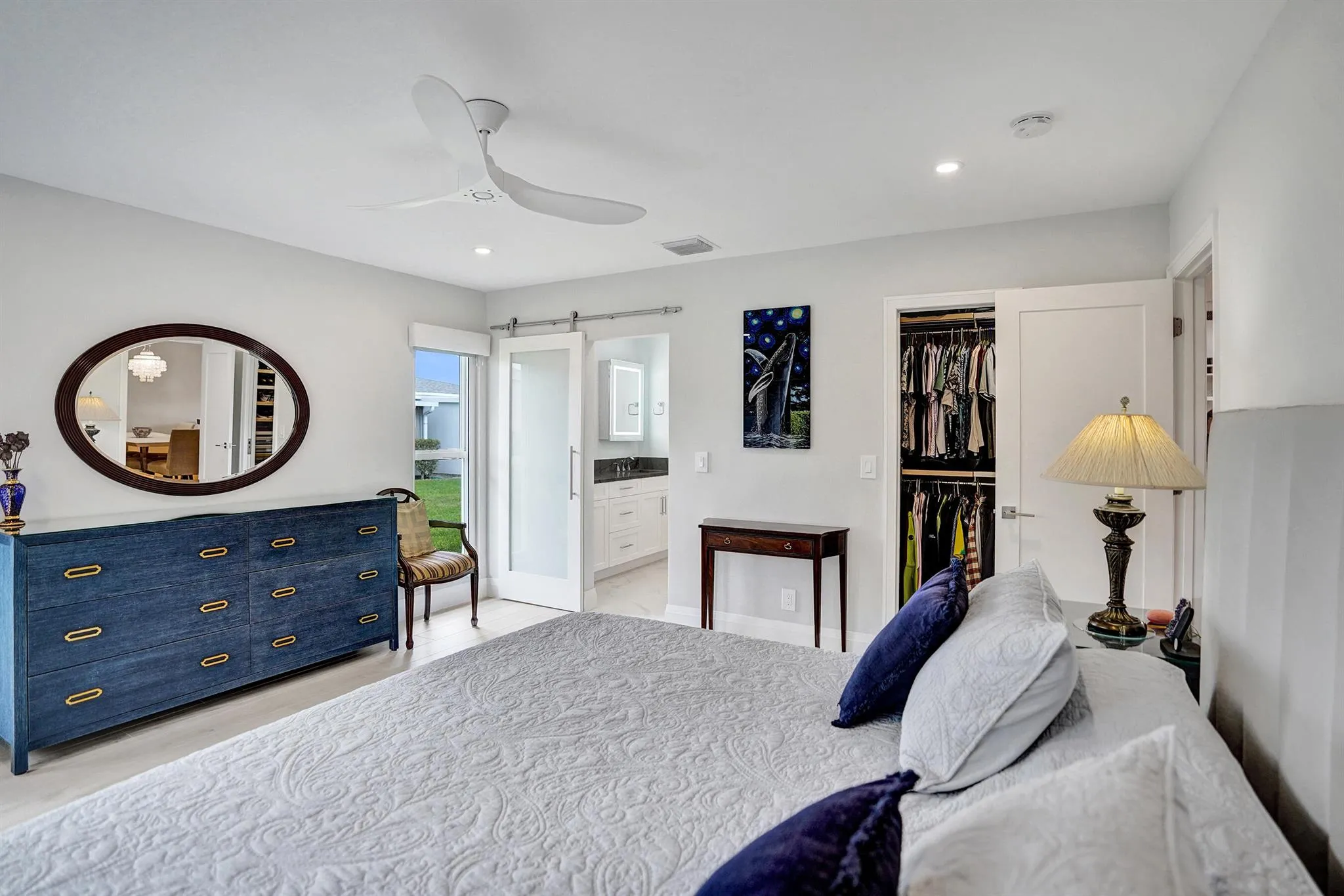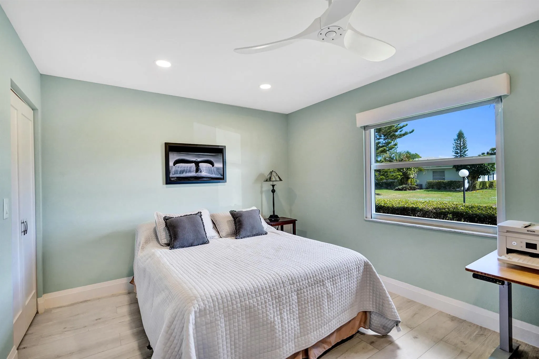 Ultra-rare oversized luxury corner villa, meticulously updated and spanning an impressive 1,466 square feet of living space. The seamless indoor-outdoor flow is accentuated by sliding impact glass doors leading from the living room to a 160-sqft patio, complete with tall horizontal sliding windows. The master bedroom also features direct access to a private hedged patio, enhancing your personal retreat. The gourmet kitchen is a chef’s dream, showcasing Calacatta Laza White Quartz countertops and high-end Eurocraft cabinetry. Luxurious bathrooms offer premium fixtures including a frameless walk-in shower and an Aria Fluerco soaking tub. With PGT impact windows and doors throughout, this home ensures safety and tranquility while exuding elegance at every turn.