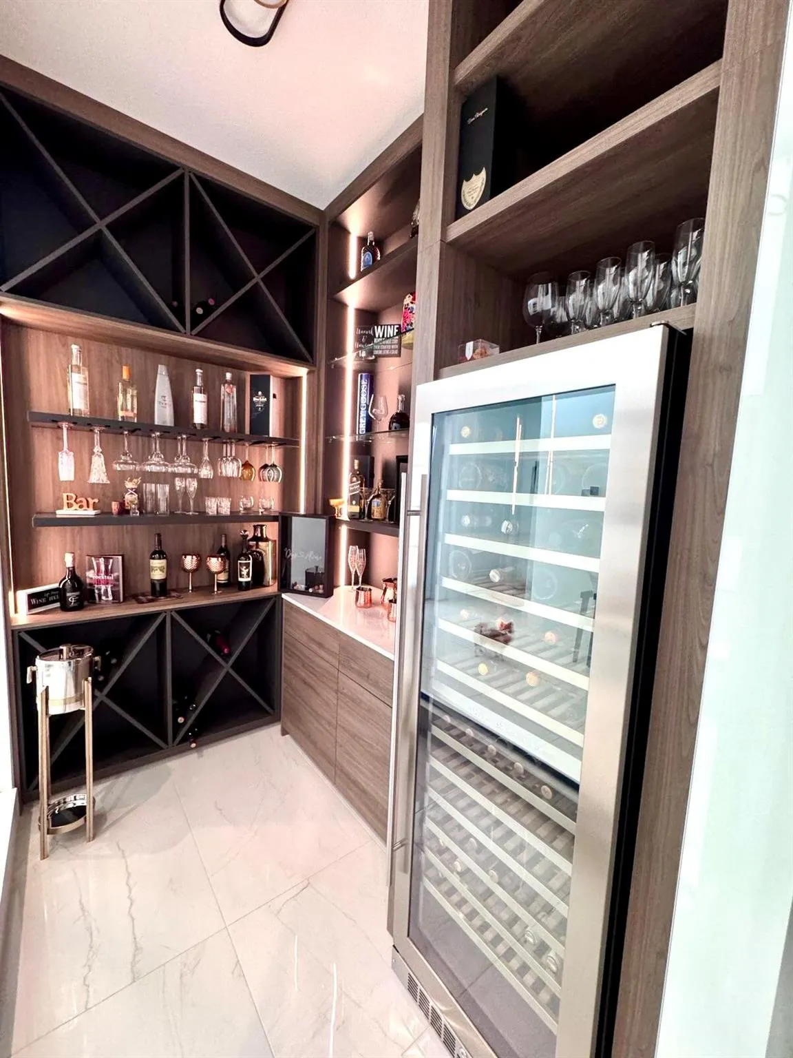 This elegant new single-story residence offers 4 bedrooms and 4.5 bathrooms, designed for comfortable and sophisticated living.The foyer features impressive 14- to 15-foot ceilings, creating a welcoming sense of openness. A custom walk-in wine room, elegantly displayed upon entry, adds a distinctive touch. Expansive windows allow abundant natural light to fill the home, enhancing the bright atmosphere. The great room, kitchen, and primary bedroom boast 12- to 13-foot ceilings. The kitchen includes stacked cabinetry, upgraded Sub-Zero and Wolf appliances, quartz countertops, and an apron-edge island. Upgraded 24×24 porcelain tile flows through main areas, with electric roll-down blinds and custom curtains. Custom closets, a 3-car garage and extended screened lanai with pavers.