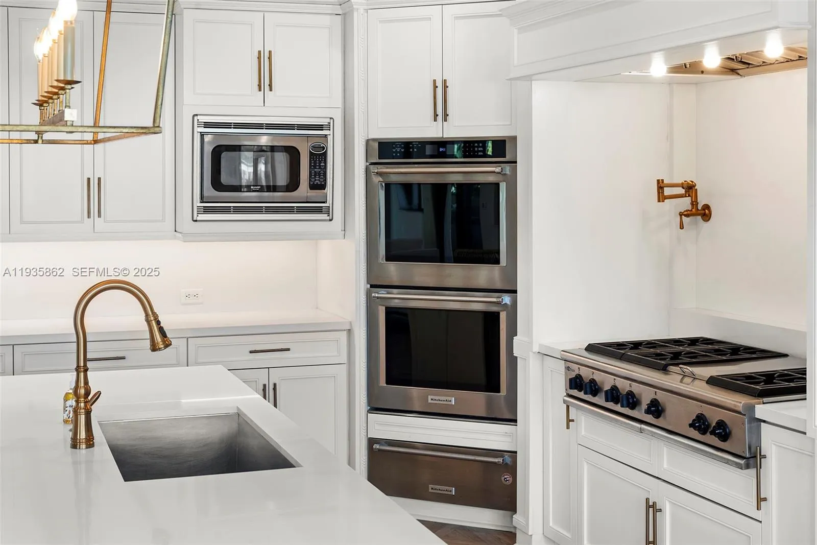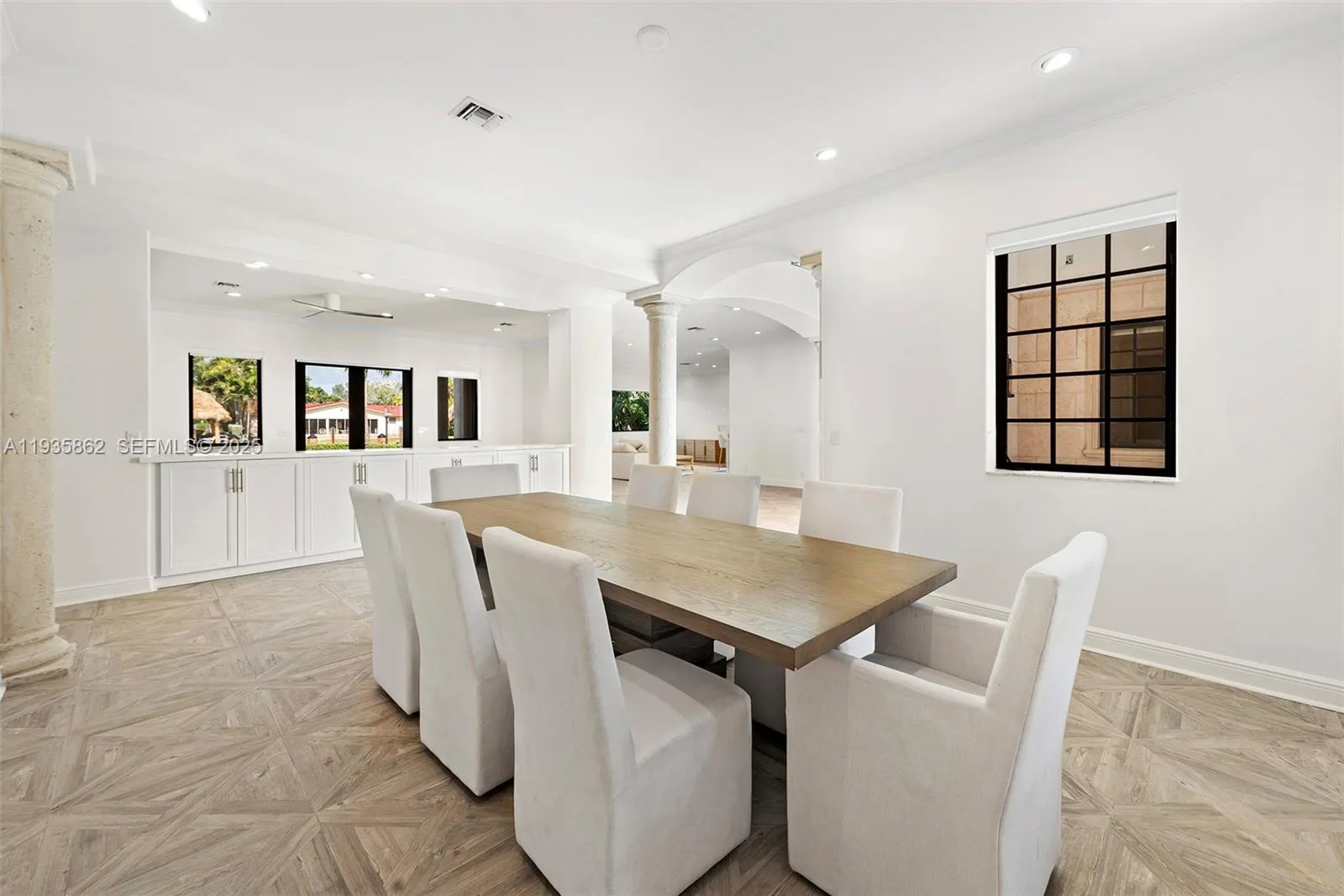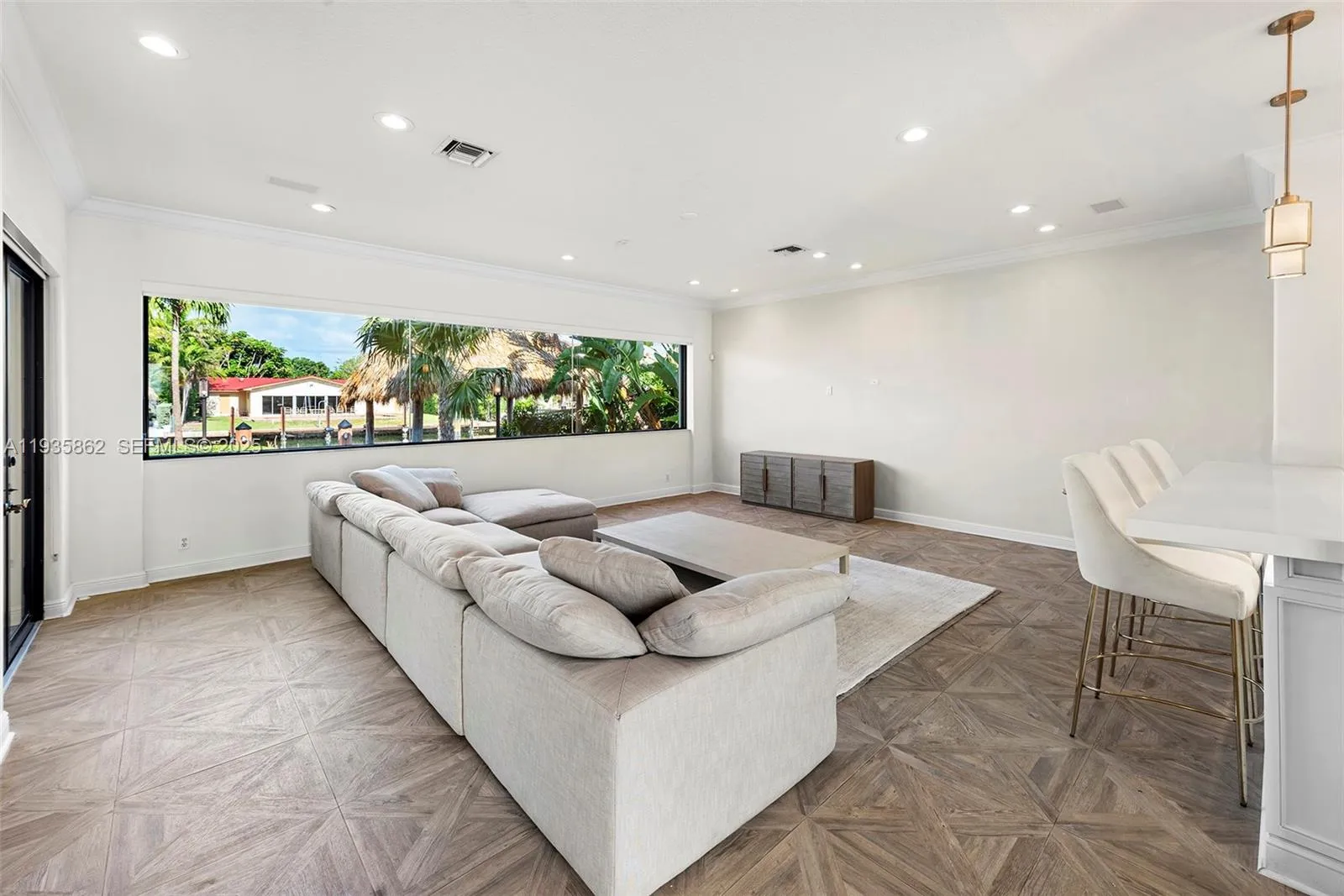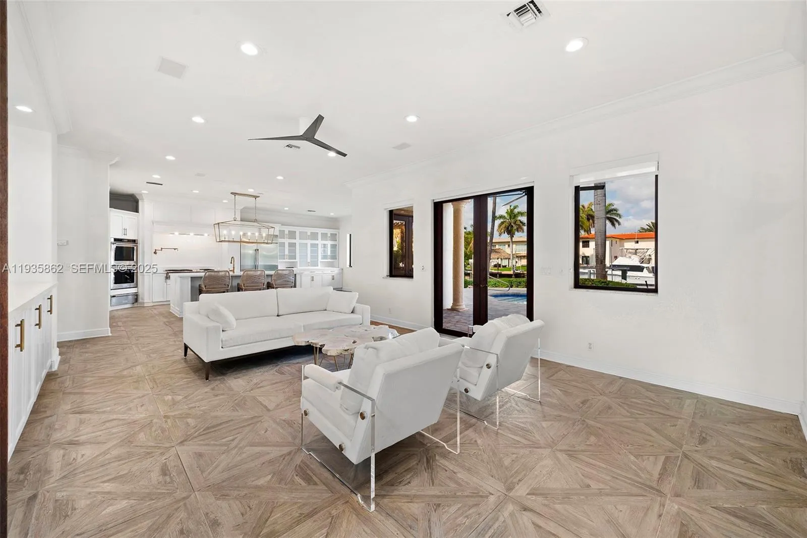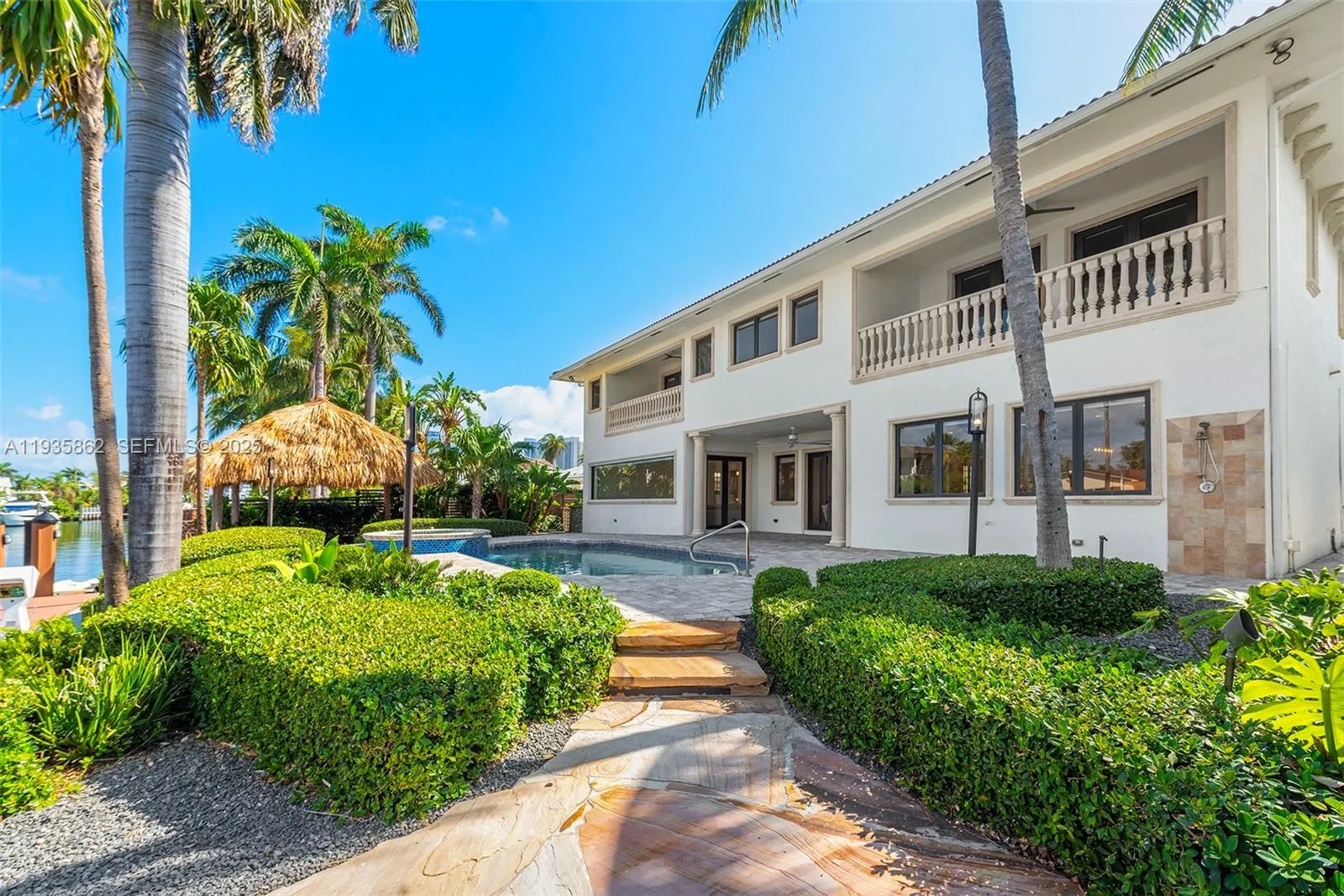Golden Isles two-story waterfront estate, 7 bedrooms, all ensuite with private bathrooms, a powder room and on 85’ of waterfront, wide canal, deep water with no fixed bridge and ocean access. Main floor features 2 bedroom suites, large living room, family room, formal dining room and a well-appointed gas chef’s kitchen with large island & breakfast area, all overlooking the water. Perfect family estate for hosting large gatherings with family and friends. Upstairs, a spacious family/tv room and 5 large bedroom suites including a sizable master suite, complete with a private balcony. Outside, a covered terrace, heated pool and jacuzzi, seek shade in the gazebo or sun on the pool deck, all surrounded by lush landscaping for privacy and tranquility.