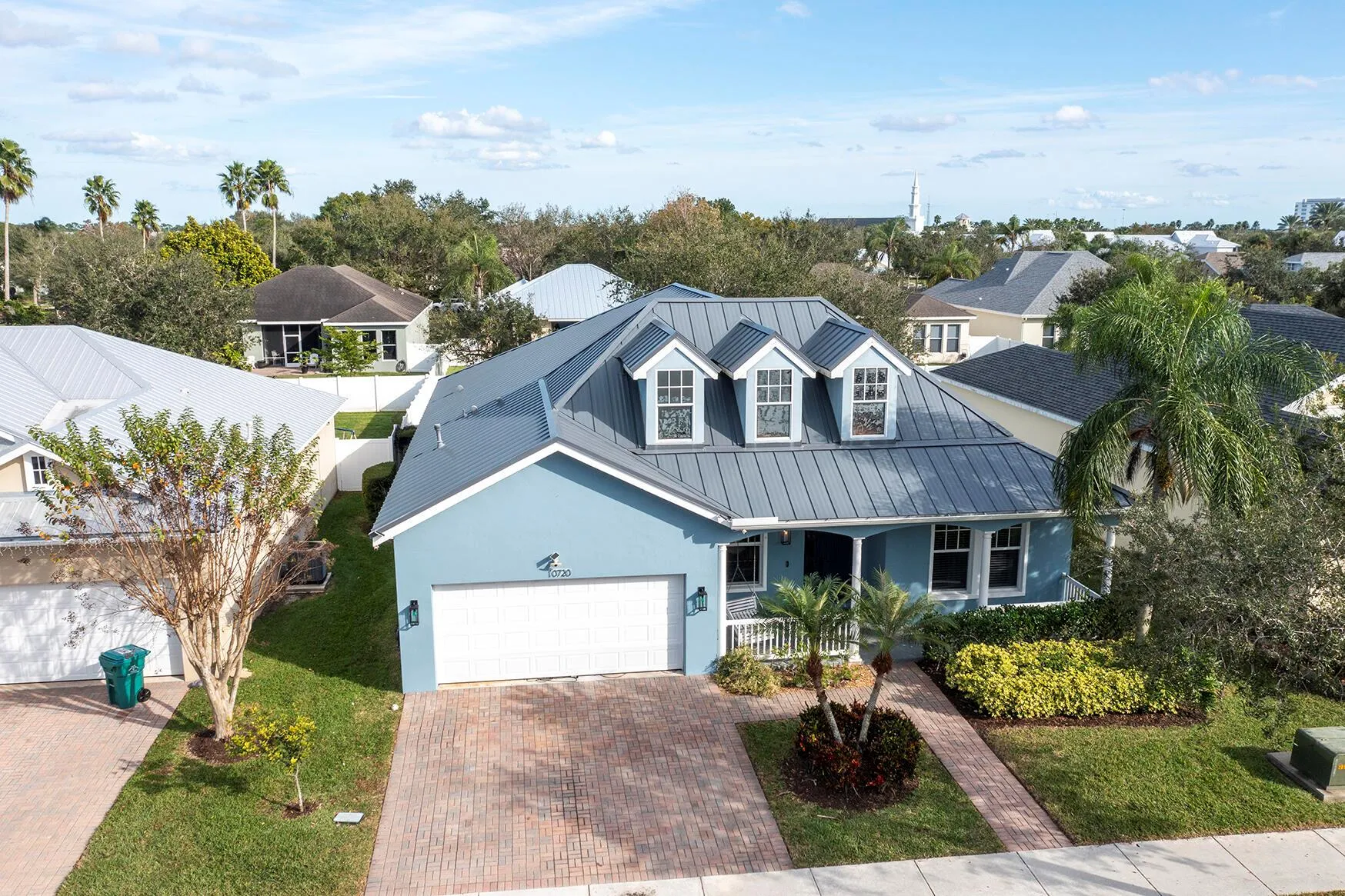 Charming and full of potential, this beautiful home is located in the heart of Bedford Park at Tradition, just a short walk to Tradition Square with restaurants, cafes, shopping, and community events. This 3-bedroom, 2-bath home with a den/office features tile flooring throughout, a bright open layout, and a durable seamless metal roof. A welcoming front porch with swing adds classic charm. The vinyl-fenced backyard is a standout with a HUGE playground and plenty of space for entertaining, pets, or future outdoor living. Opportunity to add a full second story (buyer to verify). Set in a family-friendly, park-filled community.