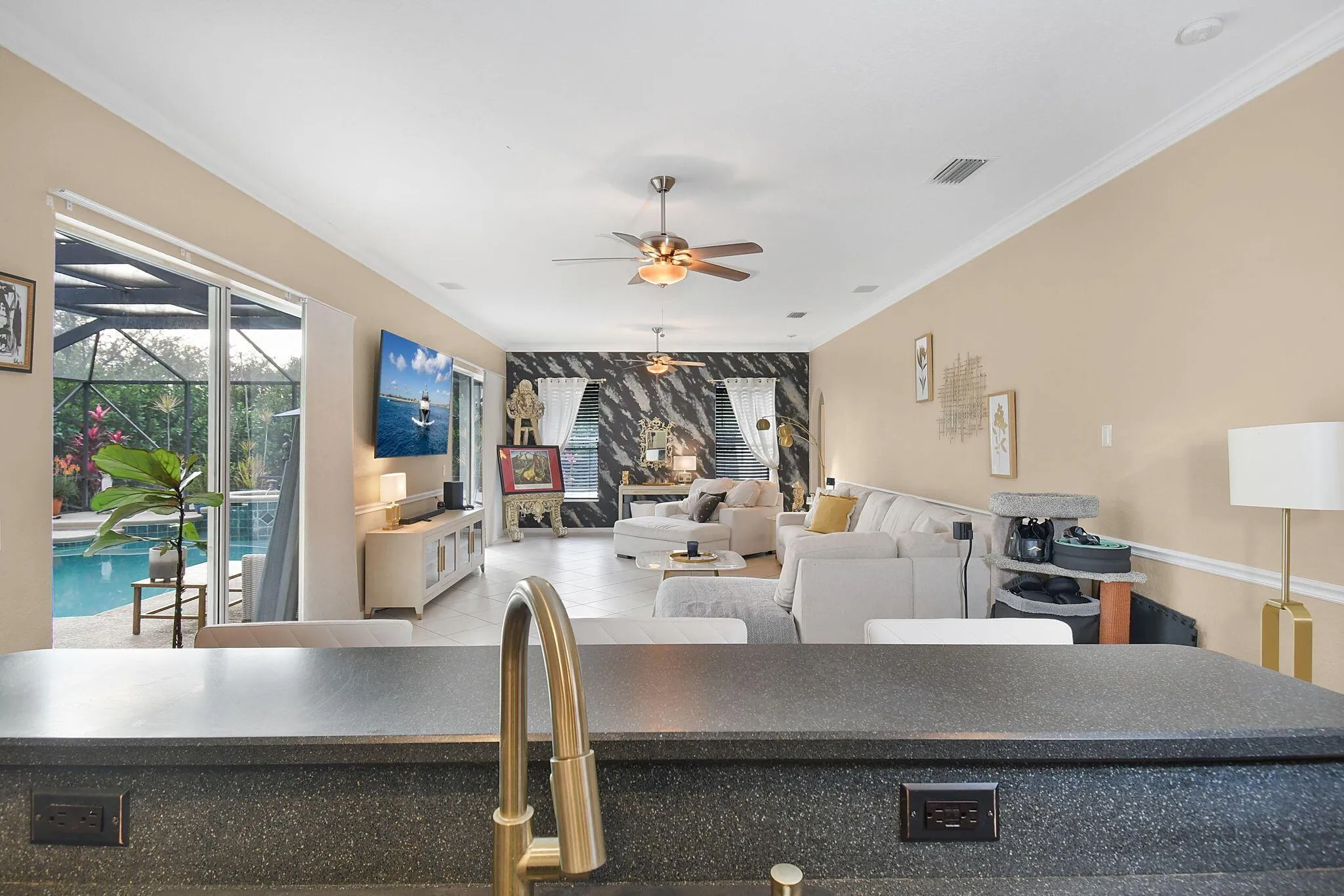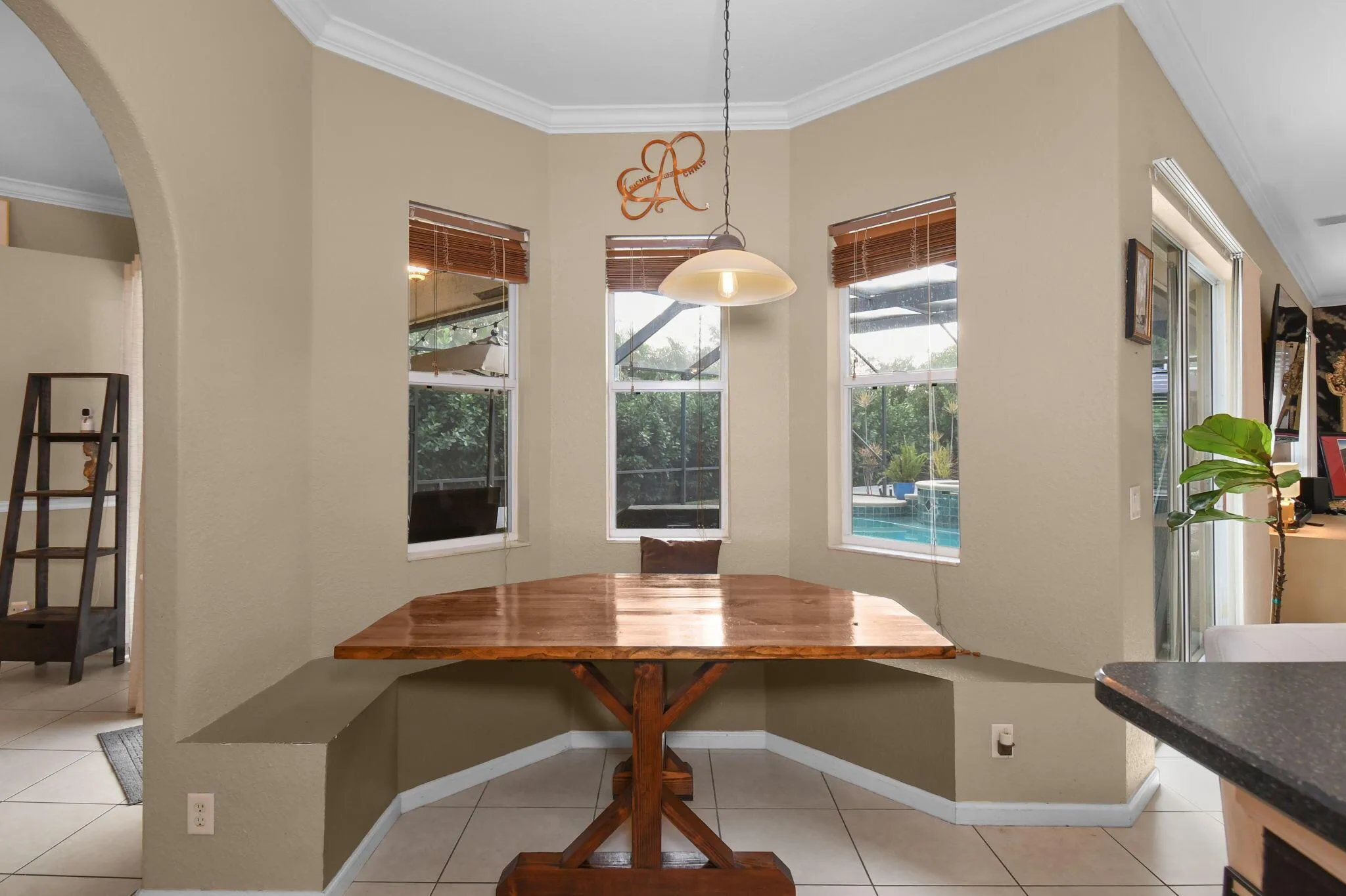 Location, Location, Location! As you drive down Dunn Road from Midway, take notice of the neighboring estate homes on acreage…a huge benefit to property value! This is the type of neighborhood that makes you feel like you’re in the country, yet you’re close to all you need! Pull into the extended driveway and you’ll immediately feel at home. This spacious 5-bedroom, 3-bathroom pool home was thoughtfully designed for effortless entertaining with room for everyone. With the triple-split floor plan, each wing has its own bathroom, making it a great fit for multi-generational living or roommate situations. The kitchen opens seamlessly to the formal living and dining areas, ideal for gatherings of any size. Enjoy informal dining at the breakfast nook with built-in bench seating.
