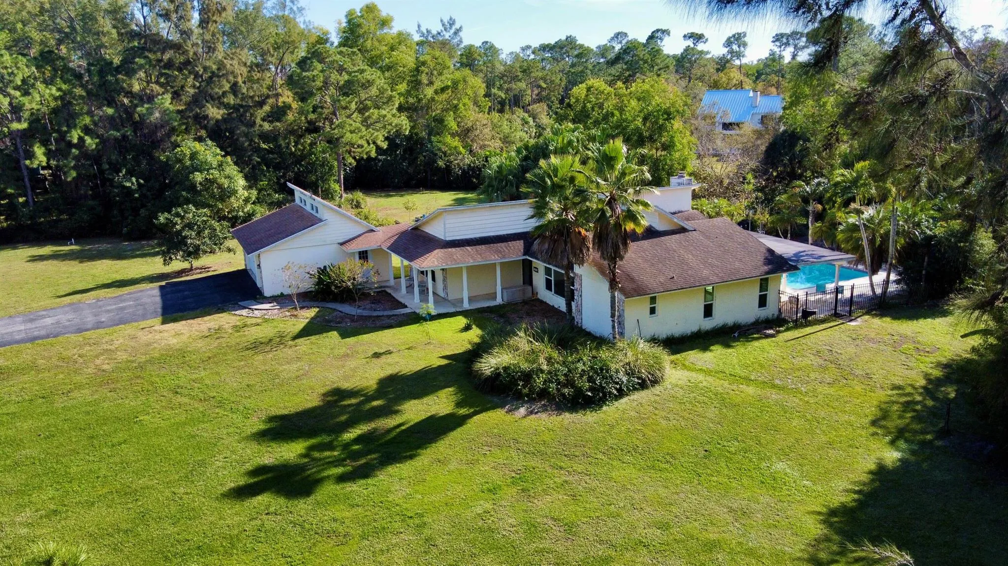 CBS POOL home on 2.5 ACRES in Jupiter Farms with IMPACT GLASS windows & doors. This charming & unique 4 bedroom plus Den/Office, 2 bathroom, 3 car garage home with high vaulted ceilings & transom windows provides bright and natural light throughout the home. Cozy front porches, festive back patios, large 36’x18′ Pool, fruit trees, completely fenced with asphalt concrete driveway located on a paved road. Neighborhood has no thru streets so if you are looking for privacy and tranquility this is it. A+ schools and minutes from shopping, restaurants, beaches, parks and more.