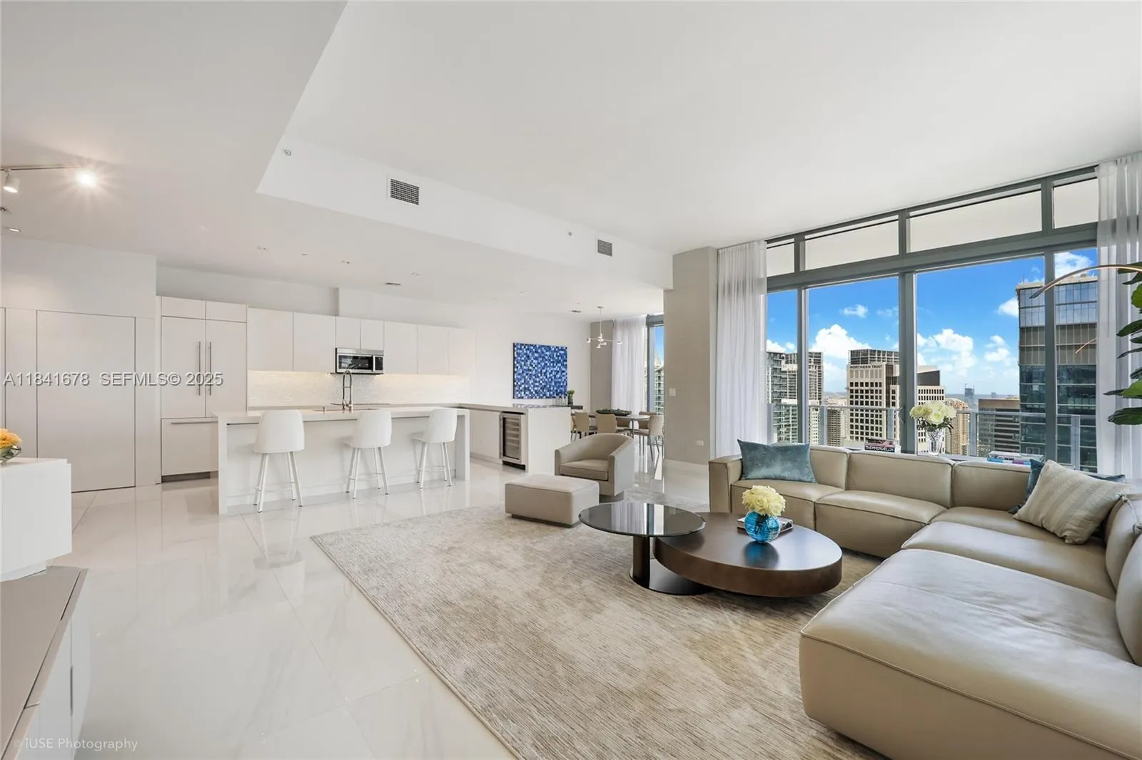 Stunning 4BR/4.5BA lower penthouse at Rise, Brickell City Centre. Featuring 12 ft ceilings, 48″x48″ Italian porcelain floors, custom Italian cabinetry, quartz waterfall island, floating vanities, and electric shades. Spacious walk-in closets in all bedrooms, large laundry room, and maid’s room with bath. Enjoy panoramic sunrise-to-sunset water and skyline views from 9-ft deep wraparound balconies. Includes 2 parking spaces and complimentary valet for guests.