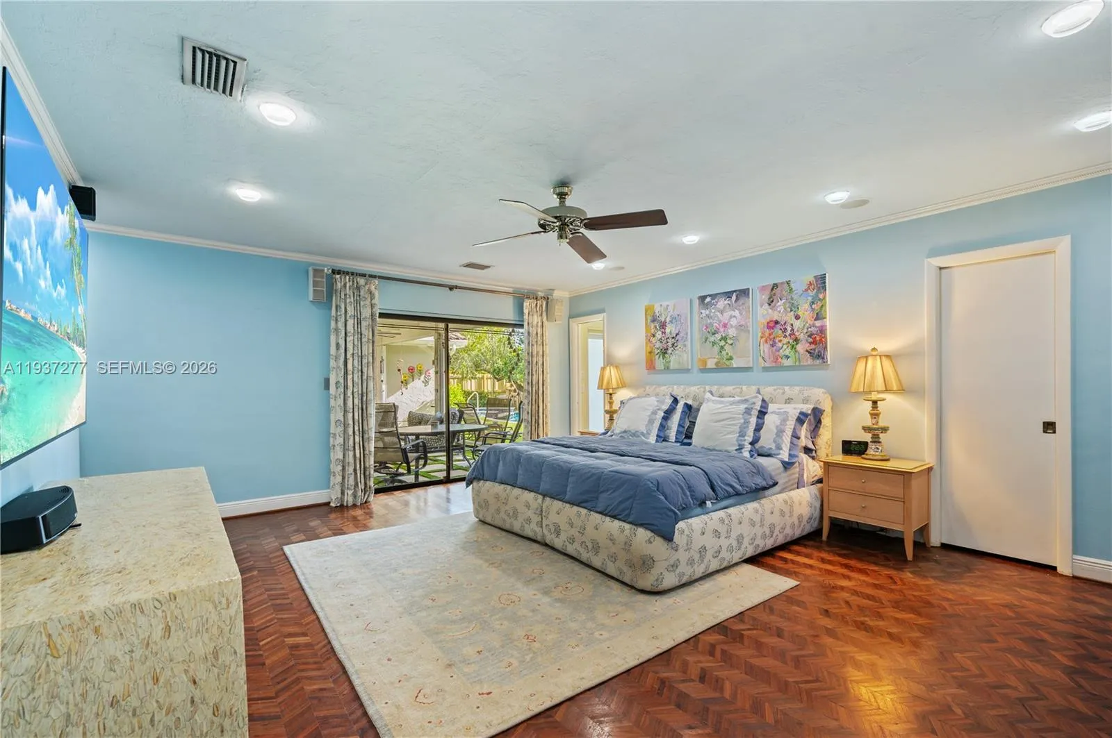 Beautifully updated 4-bedroom, 2-bath home 2700+SQFT home designed for comfortable family living and effortless entertaining. Marble floors highlight the main living areas, with warm wood floors in all bedrooms. The gourmet kitchen features rich wood cabinetry, mosaic backsplash, granite countertops, a wine cooler, center island, and premium stainless-steel appliances including an oversized refrigerator, grill, and double oven. The primary suite offers a walk-in closet, remote shades, and a spa-inspired bathroom with steam shower, bidet, and Culligan system. Step outside to your private backyard oasis with a heated saltwater pool and spa, putting green, covered patio with TV, and 25 mature palm trees—perfect for gatherings and everyday enjoyment. Additional features include hurricane-rated doors, impact windows and shutters, tankless water heater, 5-ton A/C (2022), and Nest system. A wonderful place to call home with motivated sellers—this one is truly special.