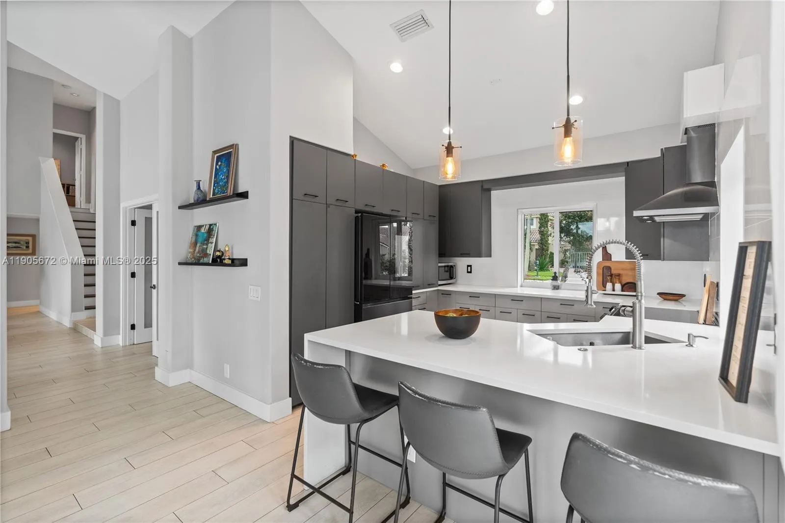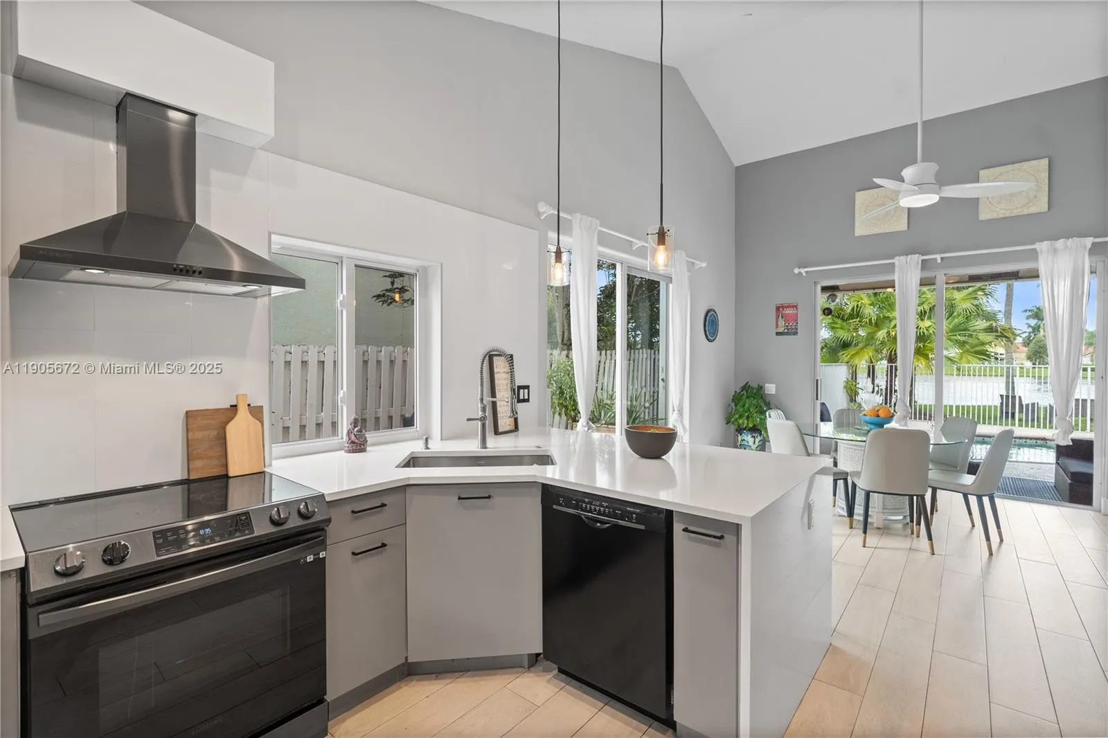 Breathtaking lakefront views anchor this renovated Estancia model on an oversized 10,000+ sq. ft. lot. The 4BR + den, 3BA layout features vaulted ceilings and extensive storm protection: impact windows and doors, and accordion shutters. (Note: two small master-bedroom windows are non-impact and protected by accordion shutters.) The two-car garage includes an EV charger, and fiber-optic internet keeps everything fast. Interior upgrades include brand-new appliances dishwasher, microwave, refrigerator, washer & dryer with gas range installation included. Outside. Enjoy the renewed saltwater pool and spa with updated equipment overlooking the tranquil lake. Top-rated schools nearby and an easy walk to the town center complete the lifestyle package.