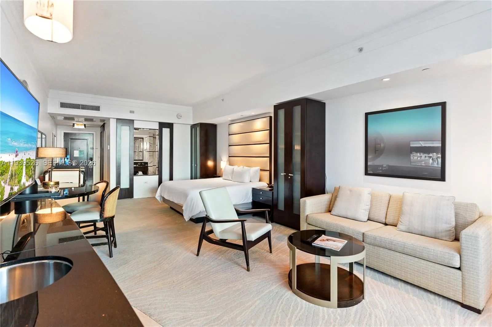 Beautiful Junior Suite at The Fontainebleau III. Enjoy full service, vacation-style living in a furnished turnkey unit with king bed, sleeper sofa & more. Option to enroll in hotel rental program & receive income while away! The Fontainebleau resort offers luxury amenities on 22 oceanfront acres including award-winning restaurants, bakery, shops, LIV night club, Lapis spa & state-of-the-art fitness center. Maintenance fees includes: AC, electricity, valet + daily free breakfast in the owner’s lounge. Click the virtual tour link to see video of property.