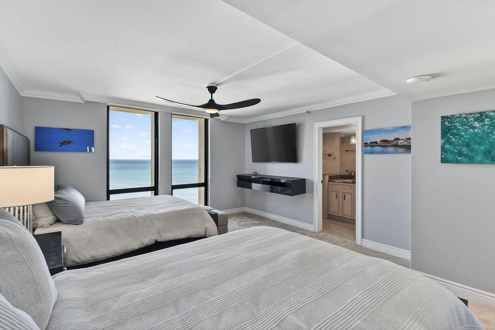 Set along the coveted north end of Singer Island, this luxury oceanfront condominium offers sweeping, uninterrupted water views that evoke the sensation of life aboard a private yacht. Floor-to-ceiling impact glass sliding doors open to three expansive balconies, creating a seamless connection to the ocean and ensuring breathtaking vistas from nearly every room. Privacy is paramount, with only three residences per floor, each occupying its own stack with no shared walls. The elegant two bedroom plus den, three-bath layout features 24×24 porcelain tile throughout the main living spaces, complemented by new plush Stark carpeting in two of the bedrooms Serena & Lilly wallpaper & Ralph Lauren lighting fixtures. Additional highlights include impact-rated windows and doors, garage parking, and two secure storage areas. New HVAC and new front loading washer & dryer The building is surrounded by impeccably maintained grounds and offers resort-style amenities including a brand new fully renovated lounge area, 24-hour gated and front desk security, a state-of-the-art fitness center, a 60-foot lap pool, tennis and pickleball courts, and inviting social and game rooms complete with ping-pong and billiards. The building has a brand new seawall, pipelining and concrete restoration has been completed. The well-appointed kitchen is equipped with premium appliances, including a KitchenAid cooktop, double oven, refrigerator/freezer, and dishwasher, along with a GE Profile oven. A stylish bar area features a wine cooler and beverage refrigerator, while marble finishes add a timeless touch. This is coastal luxury at its finest, where elegance, privacy, and panoramic ocean views come together. Paradise awaits.