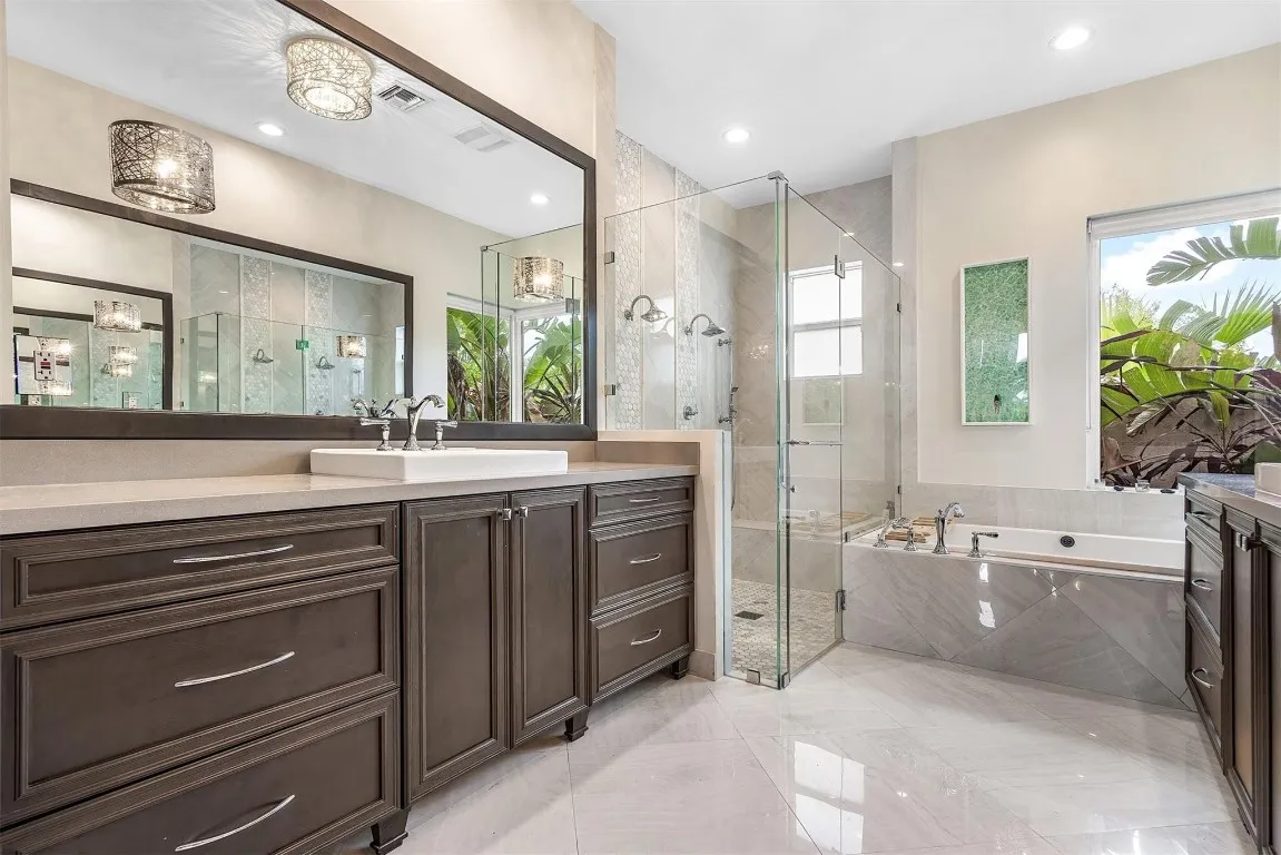 This one of a kind two story designer home was completely remodeled in 2018. The home lies on a cul-de-sac street in the community of “Seasons”. This most desirable, private, 12,000 plus square foot lot boasts a new freeform pool with sun shelf, outdoor kitchen, and sports court. The lot is fully fenced and lushly landscaped. Interior includes 5 full bedrooms, 4 full and one half bath plus an office/gym. This desirable layout with the Master bedroom, office and additional bedroom on the first floor lends itself to many living situations. The roof was replaced in 2018. No expense was spared in the whole home renovation. Fabulous kitchen opening to family room with huge island – includes Sub-zero and Thermador appliances surrounded by custom cabinets and Geo luxe countertops.