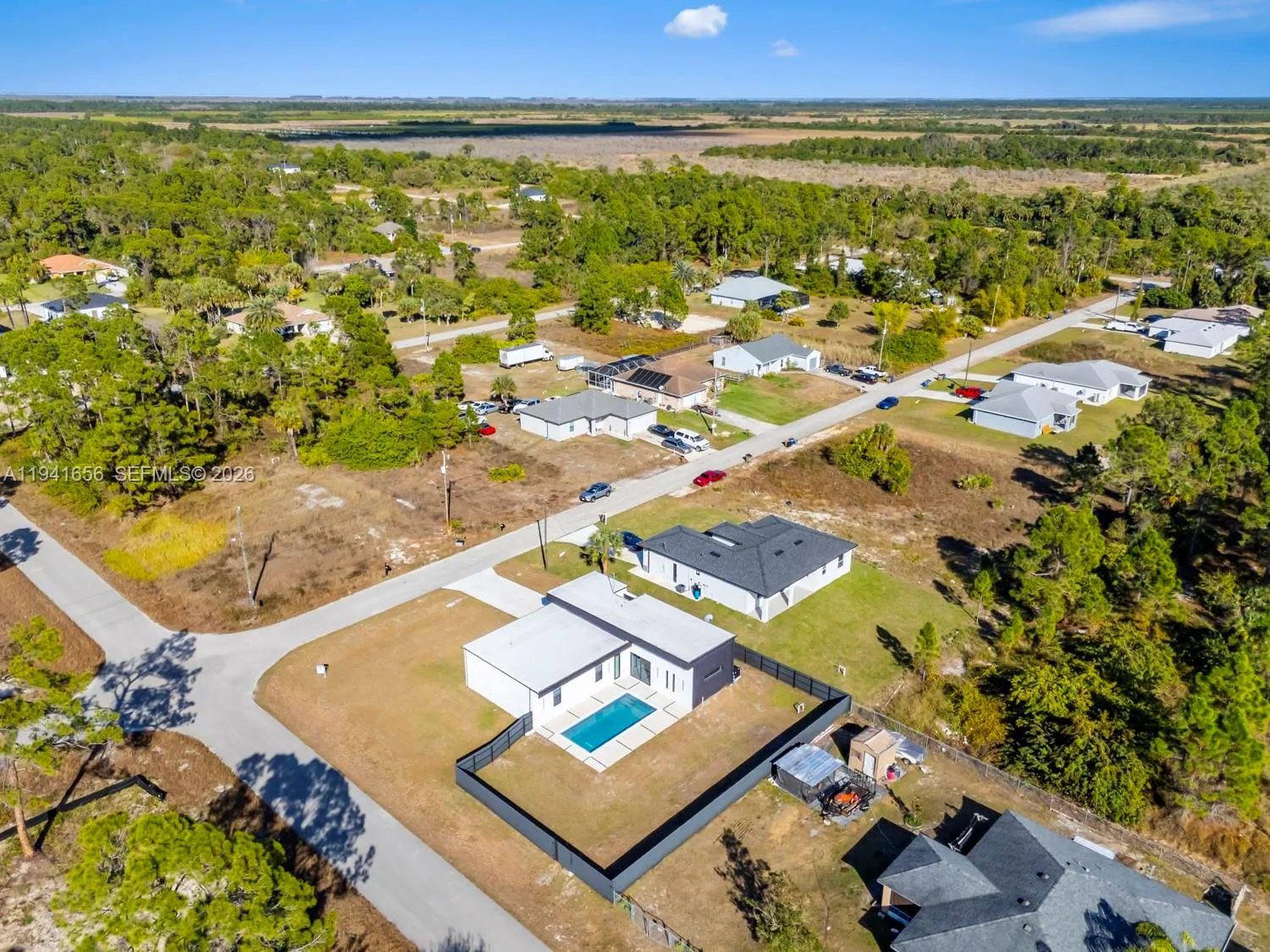 Love at first sight begins with bold modern architecture and continues with smart design choices that matter long after move-in. This brand-new 4 bedroom, 3 bath pool home sits on an oversized corner lot in a highly sought after area known for tranquility and natural beauty. The sleek flat roof isn’t just visually appealing, it’s engineered with modern materials that insures favor for durability, wind resistance, and longevity. Inside, the primary suite offers dual closets and a beautiful bath with a two-entry walk-in showier featuring four shower heads. The kitchen is equipped with stainless steel appliances and flows seamlessly into open living spaces. Outdoors, enjoy a private pool, fenced yard, and beautiful landscaping, designed for relaxaion, entertaining, and peace of mind.