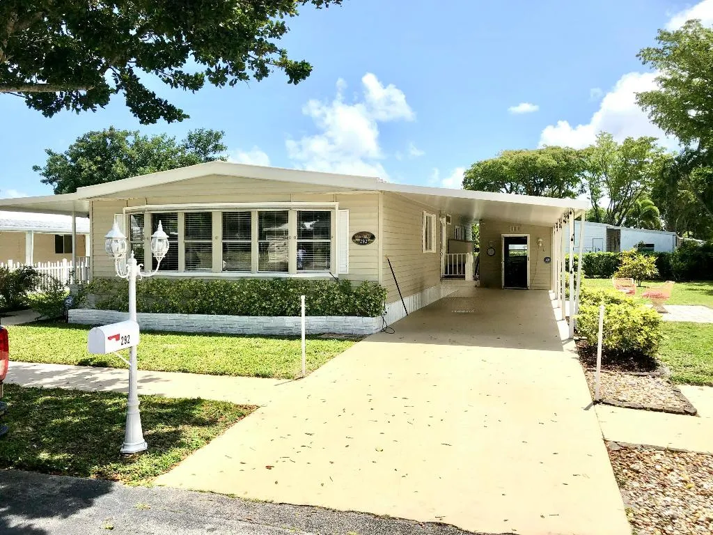 Impressive Corner-Lot Residence in Highland Meadows Estates WestrnLocated on one of the largest lots in the community, this home offers stunning sunset views. Situated in a 55+ gated community, this 24′ x 56′ home features 2 bedrooms and 2 bathrooms. The air conditioning unit was replaced in 2023. The driveway accommodates two vehicles. Monthly fees are just $130. A kitchen that stands out for both its size and beauty.rnSpacious living room with plenty of windows, offering an abundance of natural light. in-unit washer and dryer. Land ownership comes with the property.