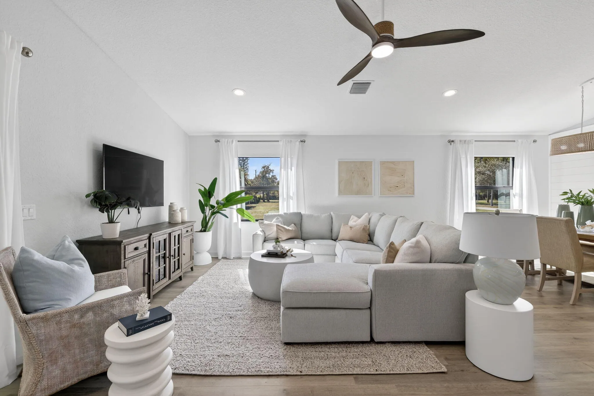 Discover true Florida living in the 2-bedroom, 2-bath Sterling model featuring a spacious layout, soaring vaulted ceilings, a covered front porch, and attached garage. Built with solid concrete block, this home boasts quartz counters, stainless steel appliances, and elegant finishes. The split-bedroom design ensures privacy while the open living area flows perfectly for entertaining. This move-in-ready home was built with 3/16th true plywood roof sheathing, hurricane tie straps, R-30 insulation, and hip roof designs ensuring big insurance premium discounts. Our homes also come equipped with energy efficient appliances, keypad door locks, and a continuous quartz kitchen backsplash. Guaranteed Fixed long term land lease: $499/month for 99 years.