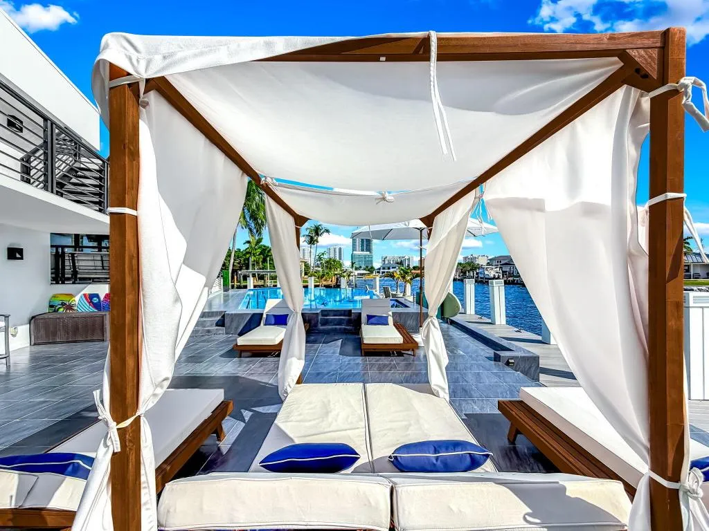 2-4 month seasonal lease. Nestled on a quiet cul-de-sac with every neighbor on the water, this stunning luxury waterfront home offers unparalleled views of the water and intracoastal. With a contemporary design, the open-concept style features modern finishes, expansive windows, and artistic touches throughout. The gourmet kitchen boasts cutting-edge Thermador appliances and an eclectic island, perfect for entertaining. Including a private balcony and roof top terrace, the primary suite showcases an elegant statement shower, blurring the boundaries for traditional bathrooms. Enjoy seamless indoor-outdoor living with a spacious covered patio, infinity pool, and an oversized dock. Bring your yacht or park your fishing boat on the 24,000 lb lift. This is waterfront living at its fines