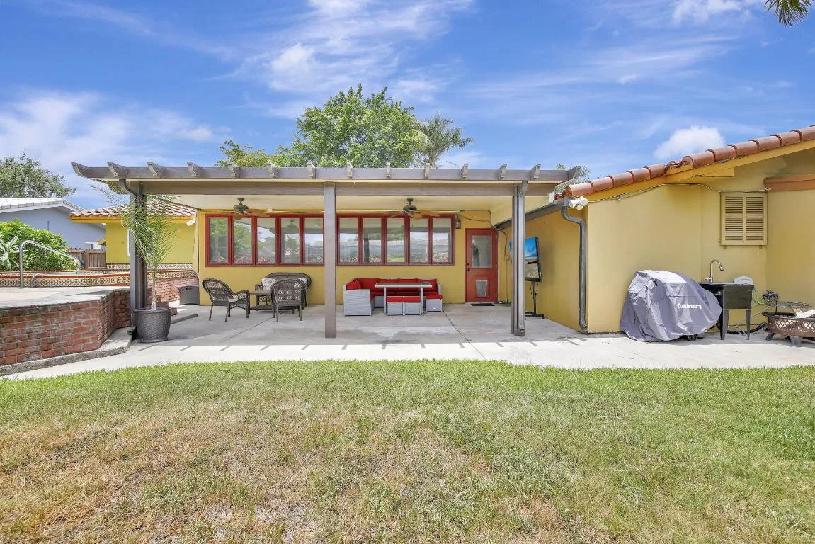 This well-kept four-bedroom, two-bathroom home offers fantastic savings with no HOA fees. It features plenty of storage space for boats and RVs, a securely fenced yard, and 10-foot metal gates. Inside, you’ll find a spacious layout with coffered ceilings, a formal dining area, and a kitchen showcasing beautiful Indian granite countertops. Designed for comfort and peace of mind, the home includes high-impact windows, full storm protection, a sturdy barrel tile roof, and a transferable termite warranty. The enclosed flex space is great for a home office, gym, or game room. Outside, relax under a covered pergola with fans and lighting, take a dip in the sparkling pool, or enjoy the peaceful pond with a soothing fountain.