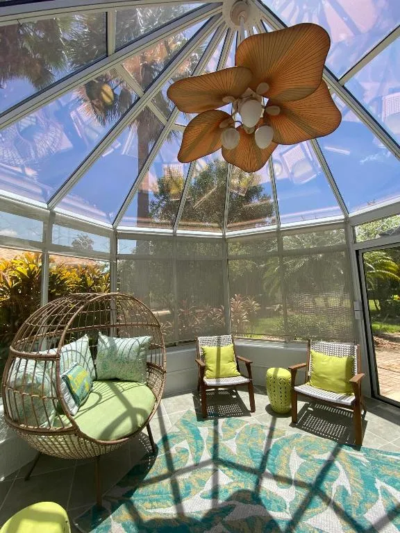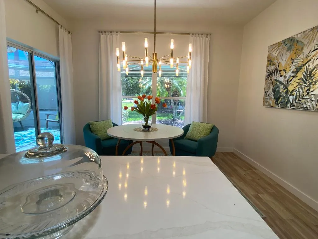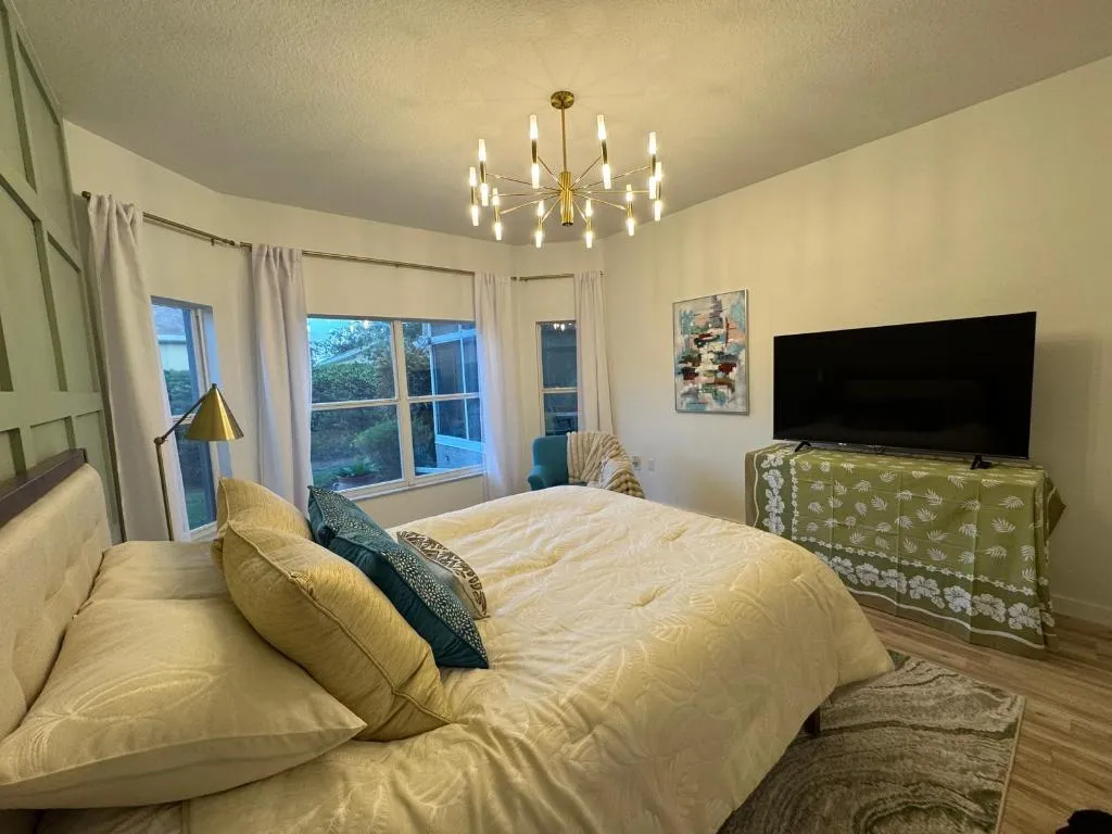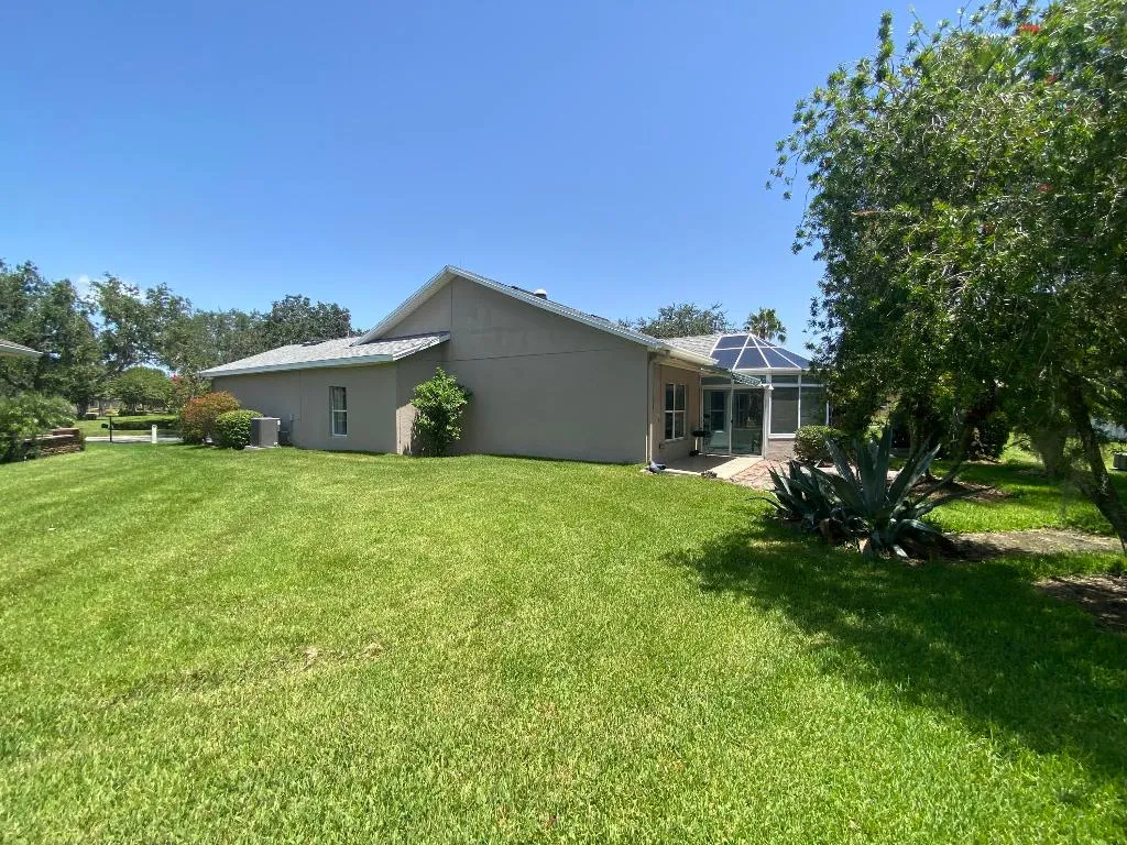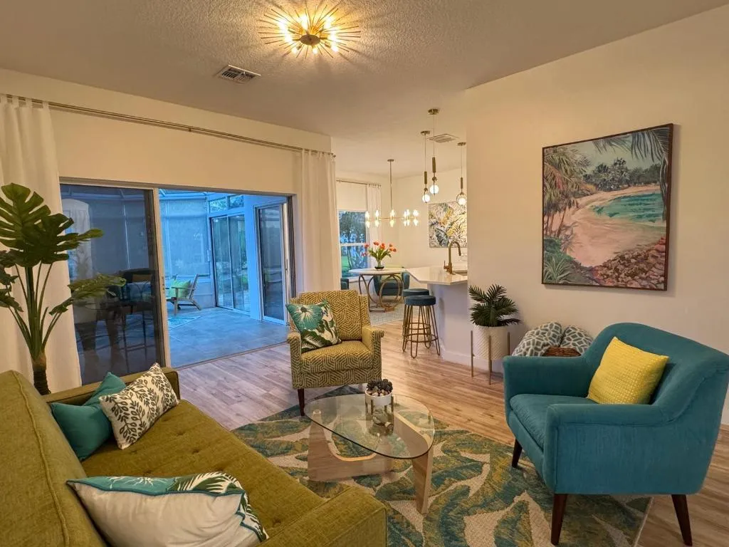 100% Designer Remodel! New flooring, cabinets, lighting, tile, paint, trim, kitchen & baths! HUGE corner lot with the nicest neighbors.Water views & moon views from the glass conservatory overlooking a 122′ garden. Designer kitchen has new floating shelves & cabinets with quartz countertops & NEW appliances. The 6 person seating peninsula will be the center of this entertainer’s dream home. Custom tile work. Feature walls in the den, living room and master bedroom. New garage epoxy floor.Butcher block laundry folding counter. Phantom screen on the stain glass front door & retractable canopy over the back patio. Enjoy the restaurants, gym, active life style in the golf course & nature community of gated Solivita!