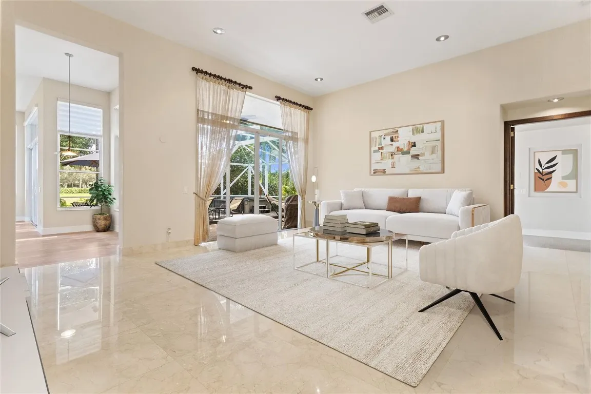 THE ONLY SINGLE STORY HOME CURRENTLY FOR SALE IN COVE III – This beautifully maintained 4-bed, 3-bath SINGLE- STORY home with a 3-car garage sits on a premium lakefront lot. The backyard faces SOUTH with serene lake views from your permitted screened enclosure (2019). Hot tub included (2019). Handmade antique primary bedroom door from South America. Custom glass work, marble and bamboo flooring throughout. All three bathrooms were updated in 2019. The kitchen features granite counters, wood cabinets and a center island. A/C from 2019. Accordion shutters, sprinkler system runs from the lake. Triple split-bedroom floor plan for privacy. Resort-style community with lots of amenities and A+ schools. Don’t miss this chance to live in one of Weston’s most desirable neighborhoods