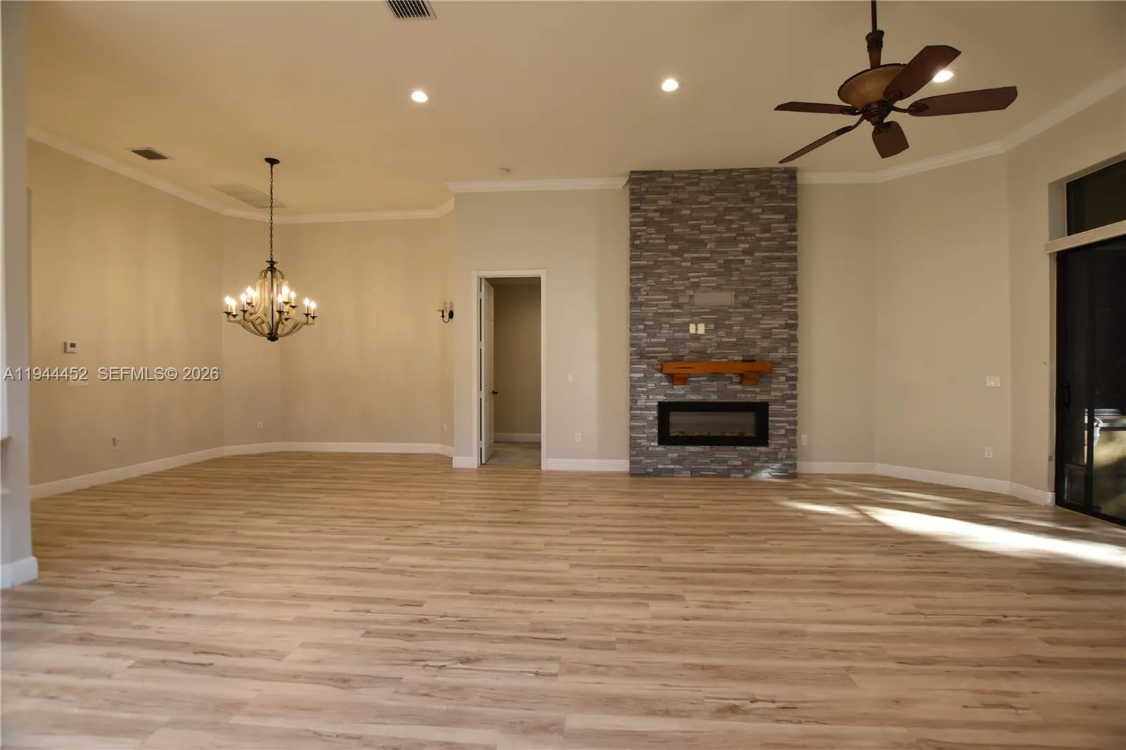 This beautifully updated 3-bedroom home in Tivoli Lakes greets you with a spacious open floor plan, a charming foyer, and lush landscaping surrounding the front, sides, and back. The counter-height, eat-in kitchen includes a built-in desk, while 11-foot ceilings with crown molding run throughout the home, complemented by a stunning tray ceiling in the master bedroom. The kitchen and second bathroom have been stylishly renovated, and the electric fireplace features stonework extending to the ceiling. Fixtures, window treatments, and chandeliers have all been thoughtfully updated. The garage offers an epoxied floor and added stylish cabinets for organized storage. The master bath boasts two fully built-out walk-in closets. Out back, enjoy a screened-in patio surrounded by tropical greenery. Tivoli Lakes is fully fenced with a 24-hour manned security gate and offers amenities including a theater, grand ballroom, fully equipped gym, pickleball and clay tennis courts, billiards and card rooms, a heated pool, jacuzzi, shuffleboard, and more. Conveniently close to beaches, the Turnpike, and I-95.rnFlooring updated in 2021 along with new baseboards and crown molding. Kitchen full remodel 2023 with Quartzite countertops. Storage in built ins, MB Closets, Office reading nook, garage cabinets and epoxy flooring done in 2021. Custom window treatments and blinds done 2023.rnrnPlease be sure to click on 360Degree link for a virtual tour of the home online.