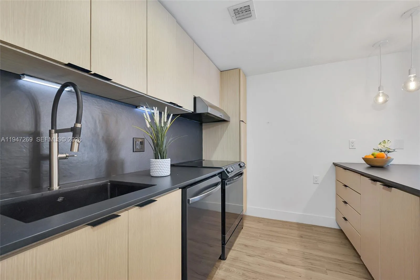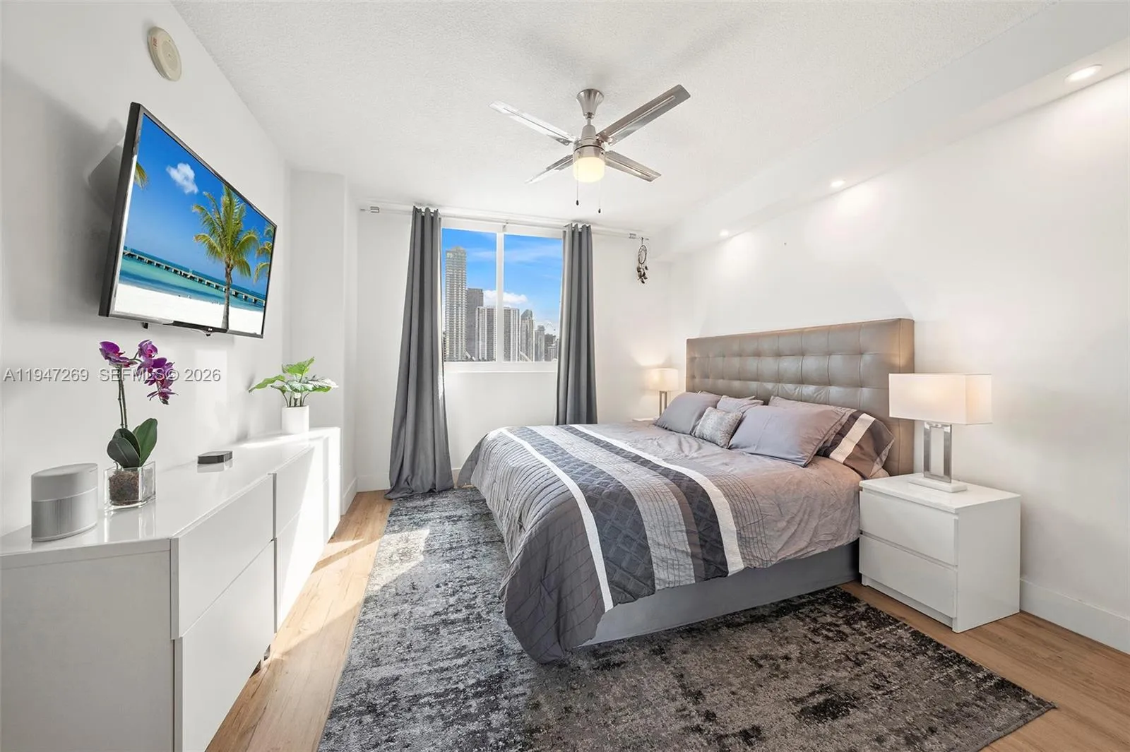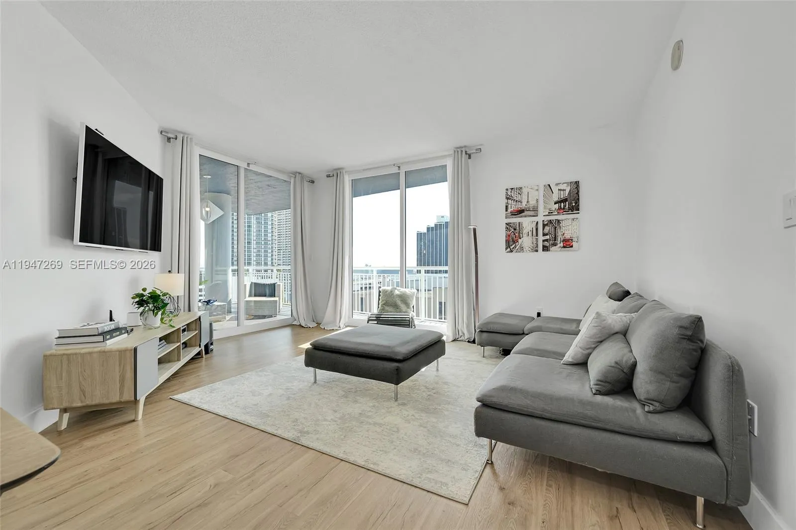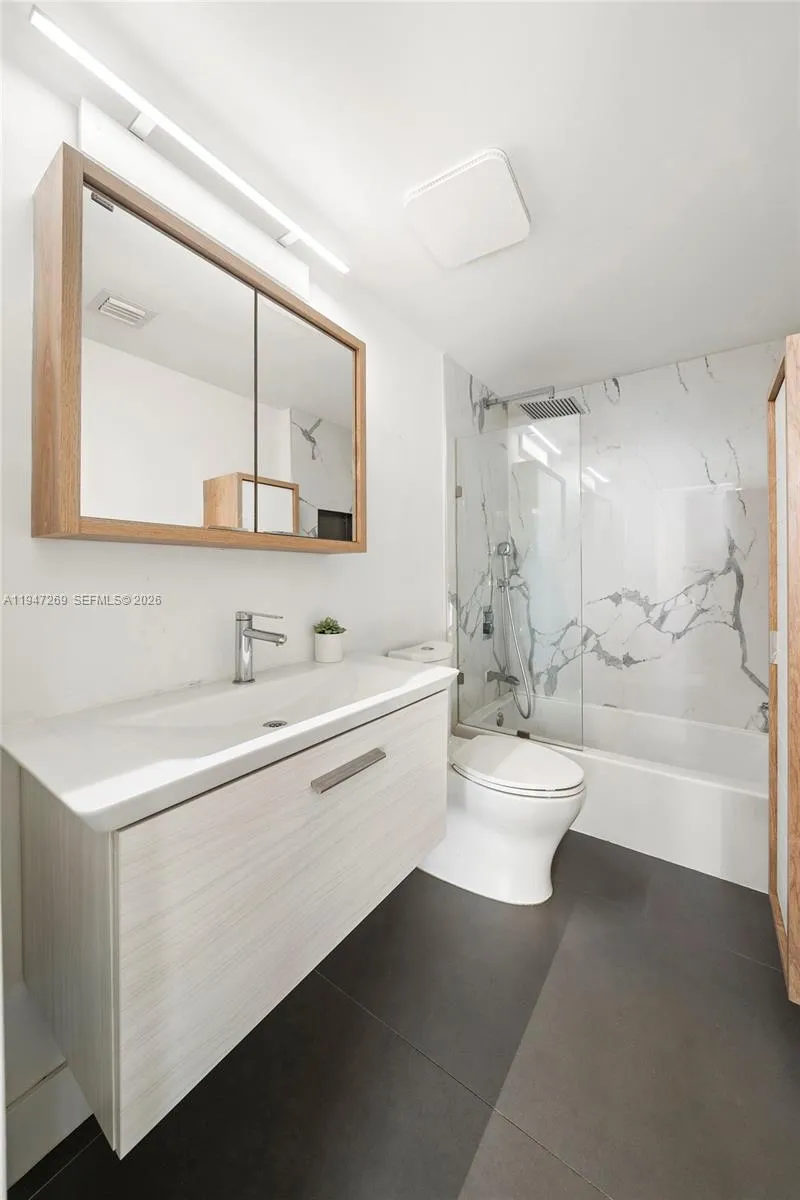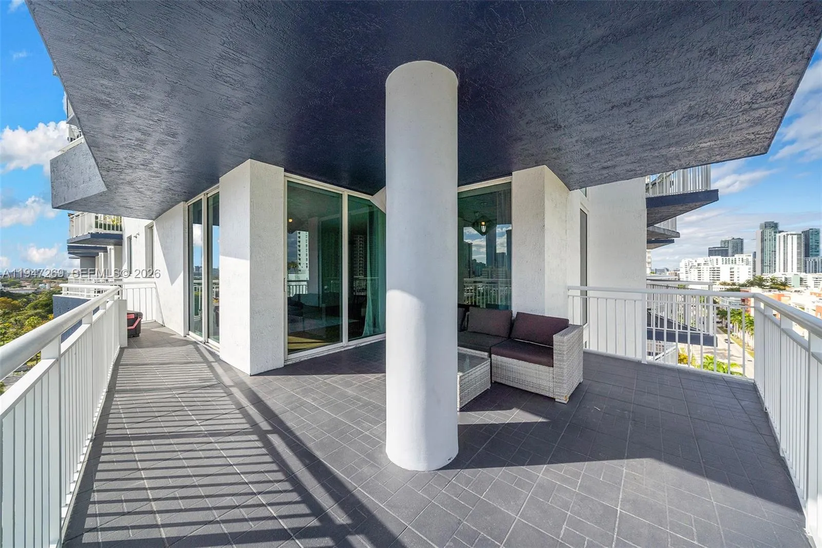 Fully renovated 3-bedroom, 2-bath corner residence with over 1,300 sq. ft. of thoughtfully designed living space. Enjoy two private balconies, including an expansive wraparound terrace—perfect for entertaining or unwinding. The home features a desirable split-bedroom layout, a spacious walk-in closet, and custom closet systems in the bedrooms.rnBoth bathrooms are finished with elegant European fixtures and vanities, complemented by large-format stone on the walls and floors. The modern kitchen is beautifully appointed with sleek stone countertops and matching backsplash, minimalist wood cabinetry, and a clean, functional layout. Additional highlights include impact windows, in-unit washer/dryer, and solid wood doors throughout.rnTwo assigned covered parking spaces complete this exceptional offering.