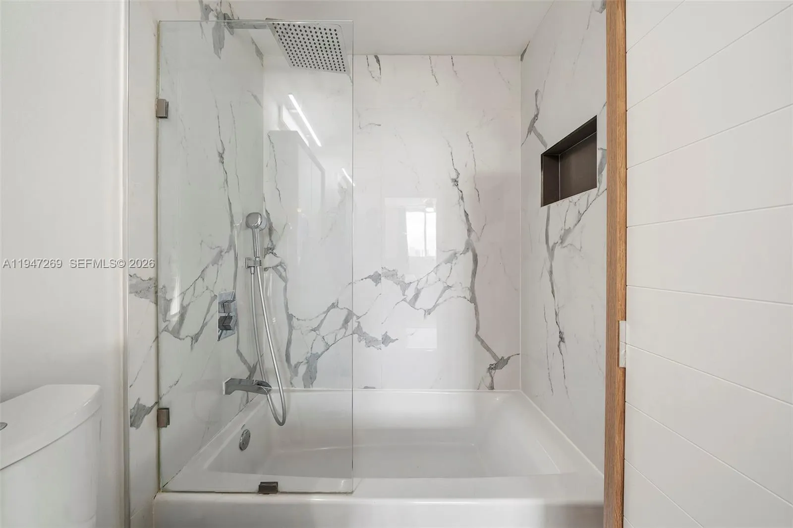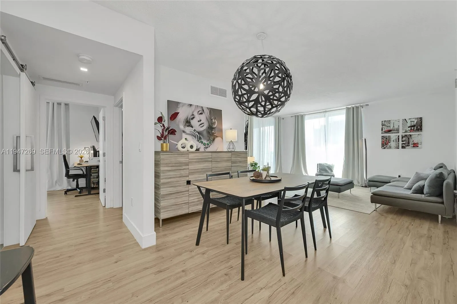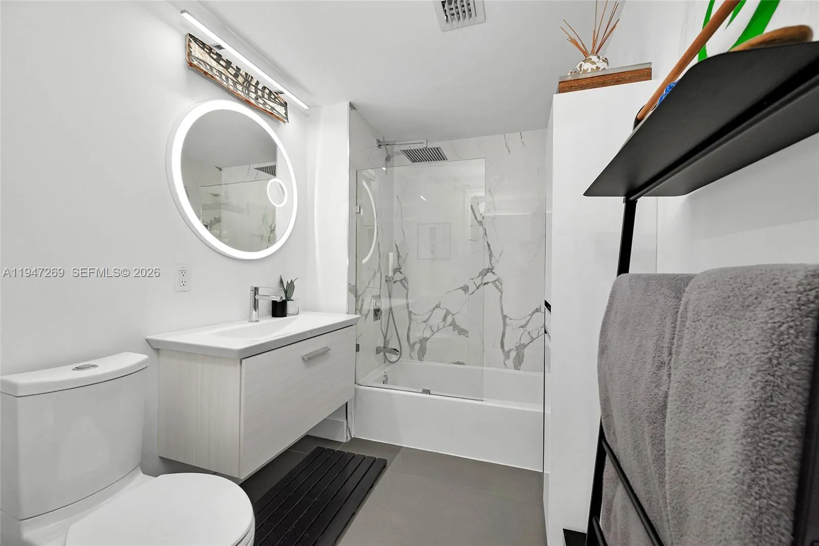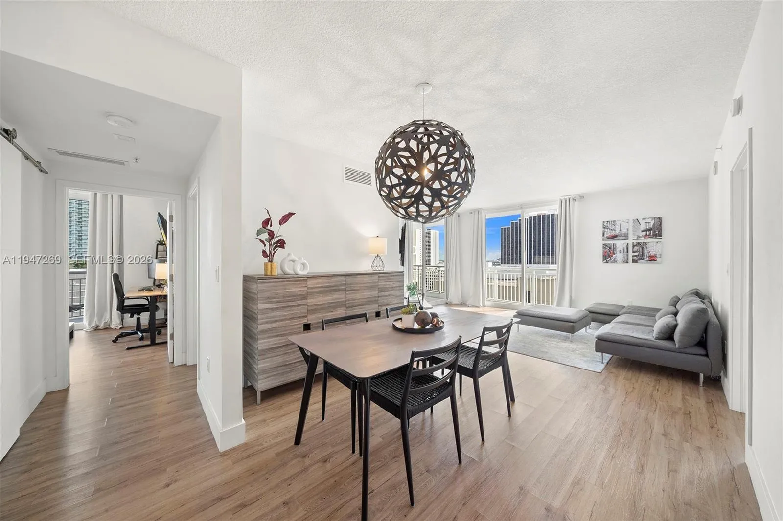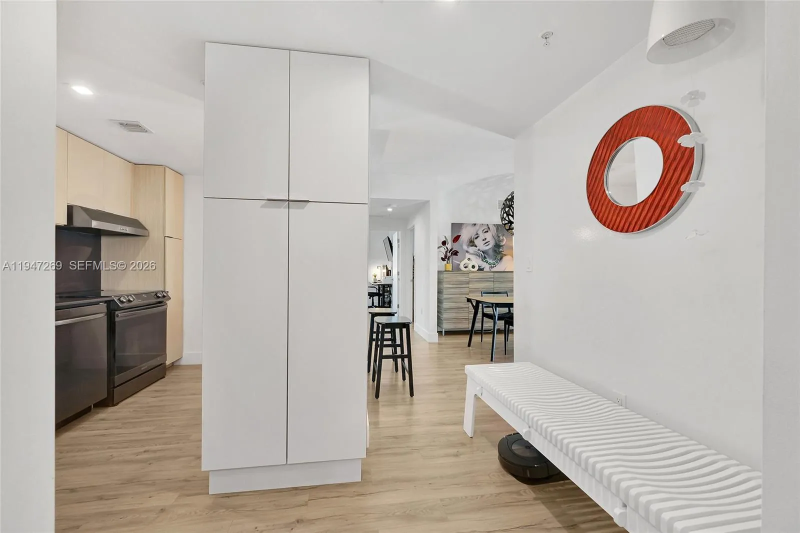 Fully renovated 3-bedroom, 2-bath corner residence with over 1,300 sq. ft. of thoughtfully designed living space. Enjoy two private balconies, including an expansive wraparound terrace—perfect for entertaining or unwinding. The home features a desirable split-bedroom layout, a spacious walk-in closet, and custom closet systems in the bedrooms.rnBoth bathrooms are finished with elegant European fixtures and vanities, complemented by large-format stone on the walls and floors. The modern kitchen is beautifully appointed with sleek stone countertops and matching backsplash, minimalist wood cabinetry, and a clean, functional layout. Additional highlights include impact windows, in-unit washer/dryer, and solid wood doors throughout.rnTwo assigned covered parking spaces complete this exceptional offering.