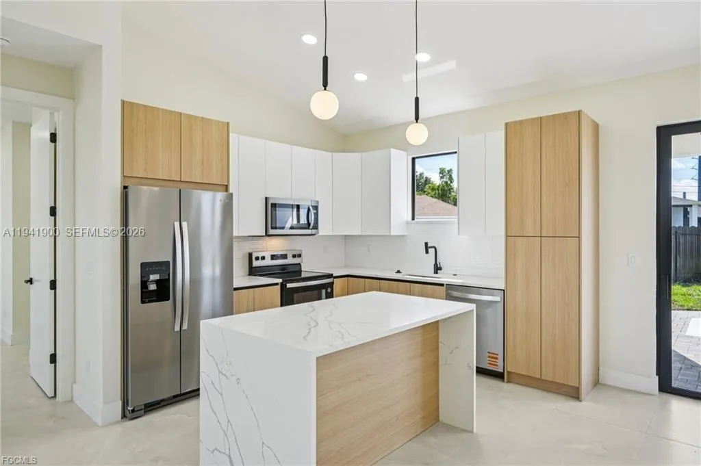 Move right into this stunning concrete block 3-bedroom, 2-bathroom pool home situated on a huge corner lot of over 12,800 sq. ft. Fully fenced with plenty of room for all your toys, this property offers privacy, space, and style. Curb Appeal: Beautiful brick paver circular driveway, two-car garage with epoxy floors, and inviting wood entryway. Interior Features: Gorgeous 24″ x 48″ porcelain tile flooring throughout. Hurricane impact windows & sliding doors. Electric fireplace. Modern lighting throughout. Inside laundry room. Kitchen: Quartz island with waterfall edge, stainless steel appliances, Tiled backsplash, and solid wood cabinetry. Bedrooms & Baths: Guest bath with LED-lit mirror, quartz counters, floating vanity, and walk-in shower with floor-to-ceiling tile. Master suite with his & her sinks, large LED-lit mirror, and luxurious walk-in shower with floor-to-ceiling tile. Bedrooms include remote-controlled lighted ceiling fans. Outdoor Oasis: Covered patio, sparkling saltwater pool with sun shelf, outdoor shower, and fully fenced backyard. Additional Highlights: Corner lot allows for secure parking of boats, trailers, or other toys inside the fenced area. City water & sewer. NOT IN A FLOOD ZONE Unique Opportunity: A second brand-new, larger home has just been completed right next door. If you’ve been searching for two new homes side by side, this is the perfect match. This modern home truly has it all—style, space, and peace of mind.