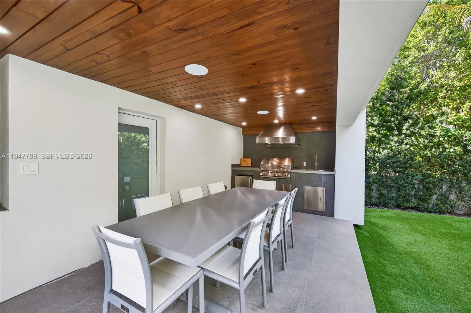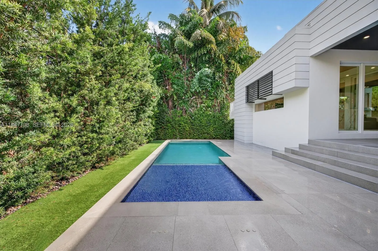 Elevated, 3,626sf adjusted area, fully rebuilt, renovated 5 beds/5 baths home in 2021. It was stripped to its core, leaving only select structural walls. All plumbing, electrical systems, roofing, flooring, ceilings, impact doors and windows, façade, and infrastructure were completely replaced—creating a virtually NEW HOME. This smart home features all-new 2021 appliances, dual Nest AC controls, a gas water heater, an electronic lock, Ring, 7 exterior cameras, interior motion sensors, and door/window alarms—all managed via mobile apps. A whole-house audio/video system. Italian ceramic flooring throughout. Italian kitchen with Miele appliances, gas cooktop, an oversized refrigerator and freezer, custom cabinetry, and pantry storage. Enclosed TV room with 5.1 home theater, adjacent full bath; separate office; guest bedroom with full bath; and laundry room with XXL LG gas washer/dryer. The second floor offers three bedrooms with independent A/C control, a spacious primary suite with multiple custom closets, a primary bath with European finishes and a Toto electric toilet, plus a second full bath. Exterior features include a new saltwater pool, a covered terrace with a BBQ, artificial turf, solar lighting, an irrigation system, enclosed 2-car garage, service quarters with a full bath, side pool access, a perimeter wall, a gas tank, storage, and a Wi-Fi repeater. A rare, fully modernized Key Biscayne home combining privacy, technology, hurricane protection and European finishes.
