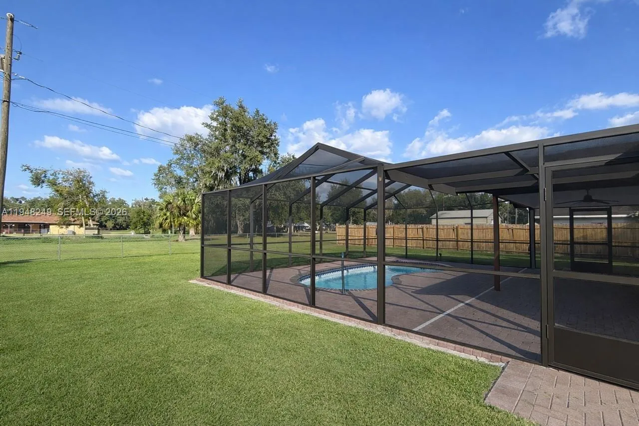 Beautifully renovated 3 Bed/2 Bath home in a highly desirable neighborhood conveniently located close to town. Featuring an open-concept layout with a split bedroom floor plan for added privacy. The primary bedroom also features a walk in closet. The updated kitchen over looks the pool and flows seamlessly in to living areas, perfect for entertaining. Enjoy a huge screened in pool area and a large fenced yard ideal for gardening or outdoor activities. Generator included. Move in ready and designed for comfortable modern living. *Staged with AI*