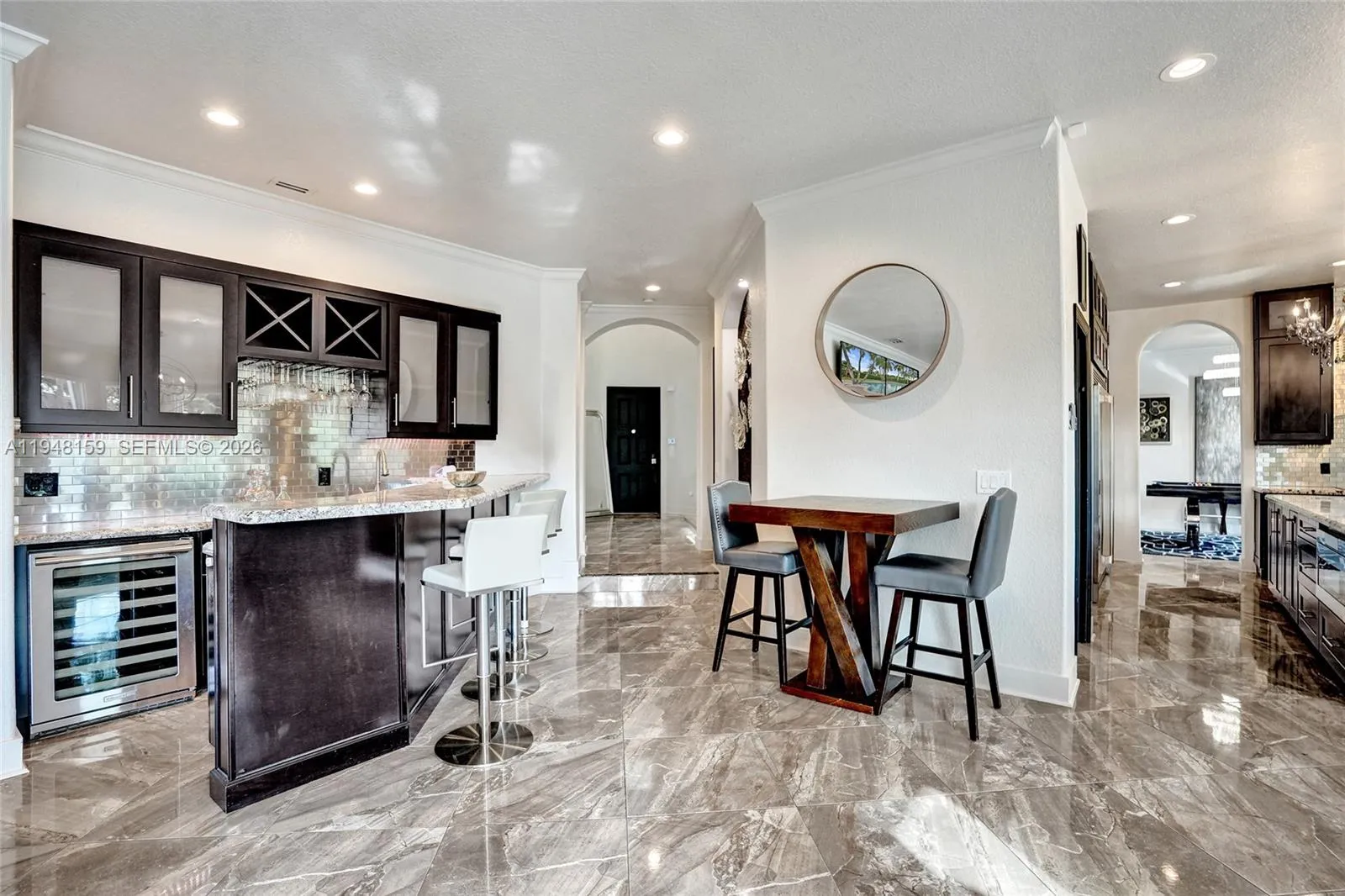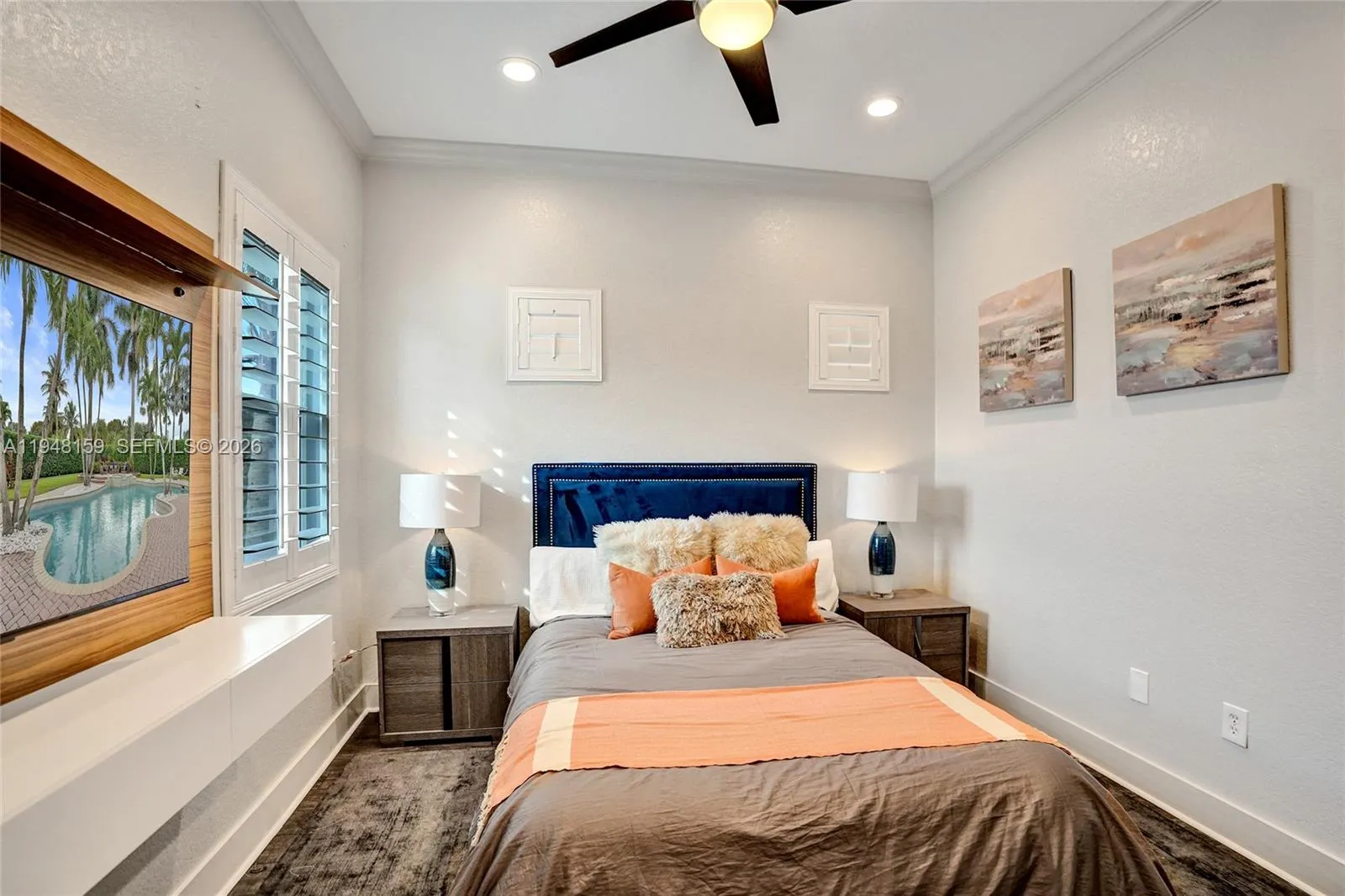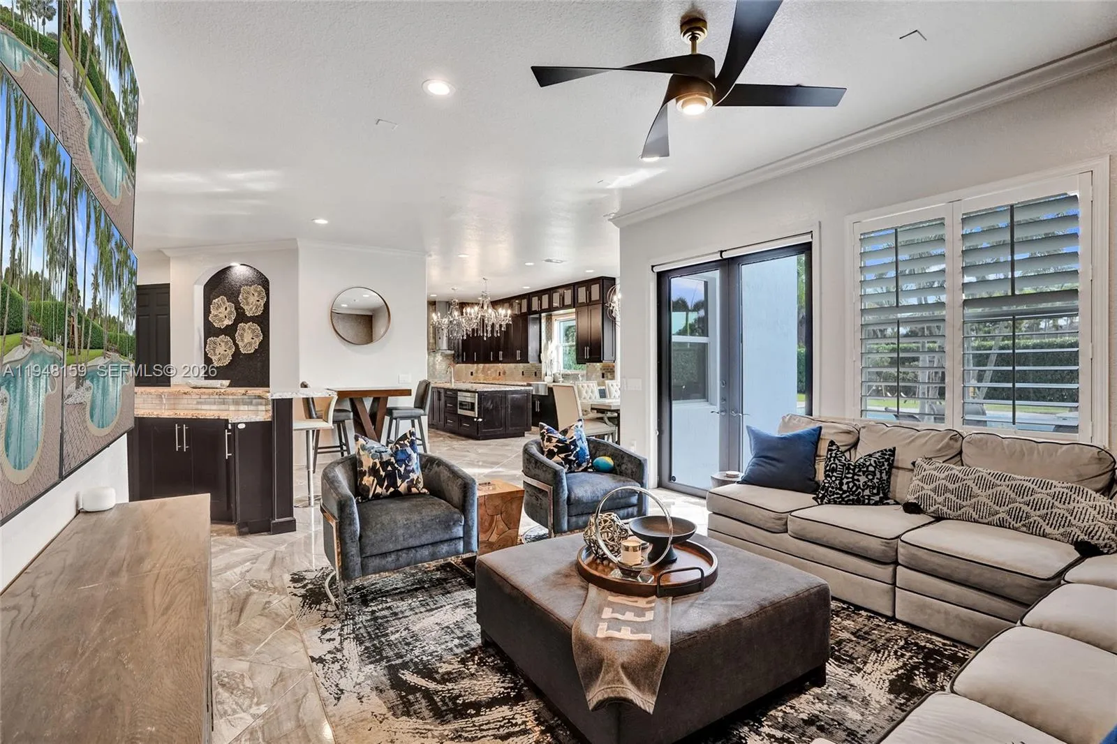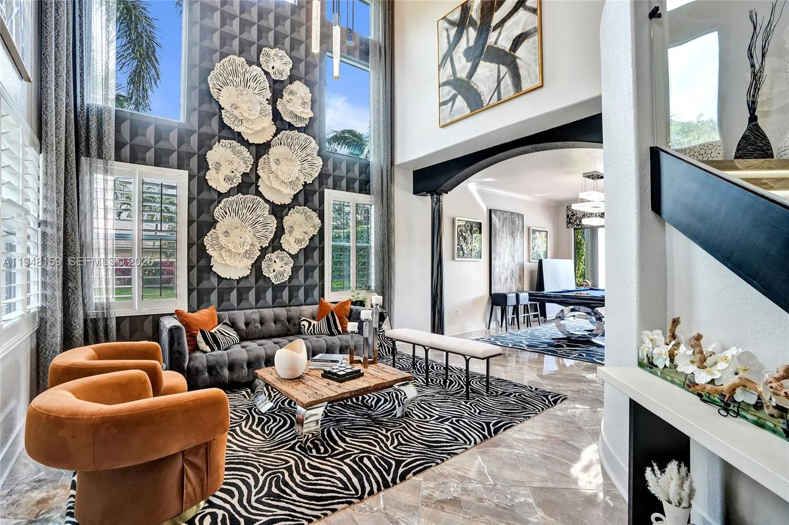 Located within the private, gated enclave of Highland Ranch Estates, this elegant Italian Villa–style residence offers a refined, light-filled floor plan designed for upscale living. A charming courtyard with a tranquil fountain welcomes you into an interior showcasing soaring ceilings adorned with designer chandeliers, expansive open living spaces, two formal dining areas, and a striking staircase with modern glass-style railings and LED smart motion-activated lighting. This impressive home offers 5 bedrooms and 4 bathrooms, encompassing 4,732 square feet under air and situated on an expansive lot exceeding 35,000 square feet. The oversized second-floor primary suite features a private sitting area with minibar, dual walk-in closets, and a spa-inspired bath. Chandeliers add elegance to the primary suite, kitchen, dining room, and billiards area.rnrnThe gourmet eat-in kitchen is appointed with top-of-the-line appliances and a butler’s pantry, while the spacious laundry room includes two washers, two dryers, and a utility sink. Four wall-mounted screens create a true theater-style experience, and the family/media room overlooks the resort-style pool and jacuzzi, enhanced by upgraded exterior and pool lighting—perfect for entertaining. rnAdditional highlights include impact windows and doors, a tankless water heater, roof (2021), HVAC (2023), and access to a community basketball court.