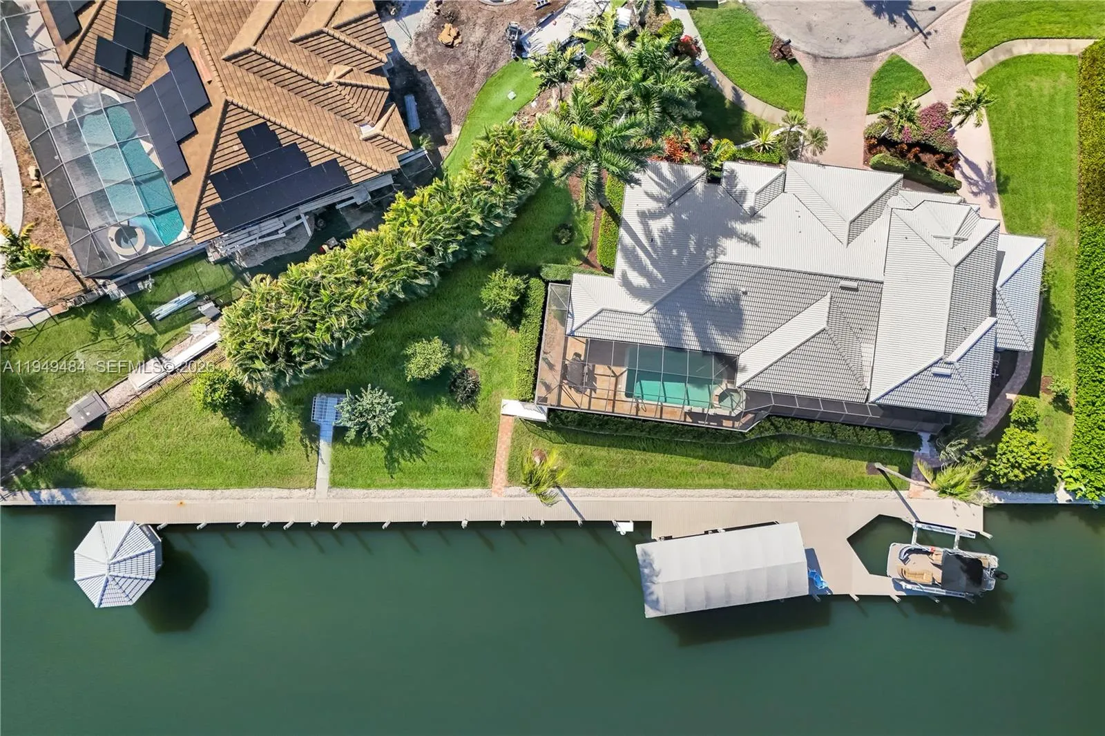 Experience premier waterfront living with this distinguished 5-bedroom, 4-bath residence, strategically situated on nearly half an acre with direct Gulf of Mexico access. This home is a boater’s dream, featuring two advanced boat lifts—a 20,000 lb and a 27,000 lb lift, the latter protected by a canopy to preserve your vessel’s condition. The property boasts an impressive 276 feet of seawall, complete with a private gazebo for enjoying stunning sunsets and bay views. The recent remodel has transformed this luxurious abode, seamlessly blending contemporary elegance with comfort. High-end finishes and thoughtful design elements are showcased throughout, including new plank flooring and a beautifully remodeled kitchen, equipped with a large wine cooler. The expansive backyard offers numerous opportunities for relaxation, from the glider swing to dining while surrounded by nature’s beauty and fruit trees. The home has an added wheelchair lift in the third-car garage opening into the master bedroom. Venture outside to your private oasis, where a spectacular, heated pool with a spa offers the ultimate retreat for relaxation or entertaining. The meticulously landscaped grounds enhance the seamless connection between indoor and outdoor living spaces. There is so much potential on this property! Conveniently located near shopping centers, grocery stores, the beach, and easy island egress, this rare gem offers a harmonious blend of luxury, convenience, and natural beauty.