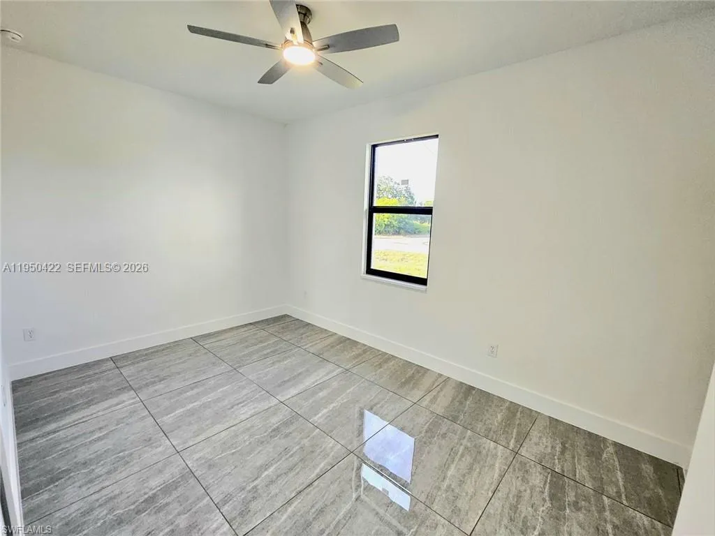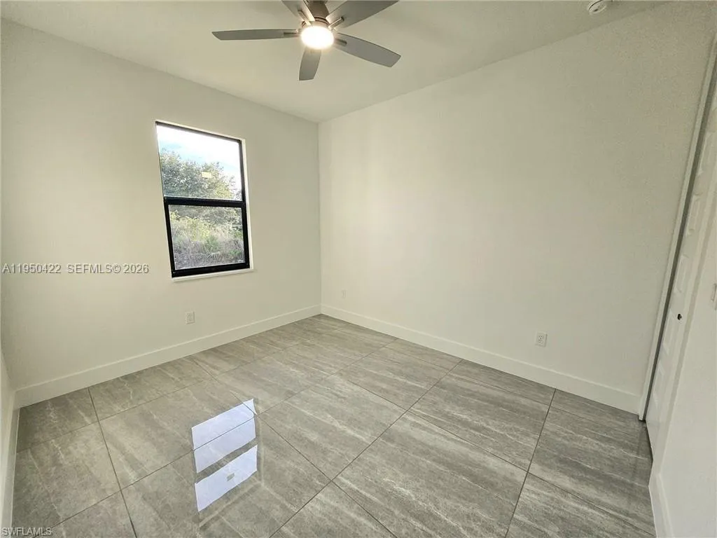 Beautiful new construction home located on a desirable corner lot in Lehigh Acres, conveniently near LaBelle and the Homestead area of Lehigh. This 3-bedroom, 2-bath residence offers 1,384 sq ft under air with a 2-car garage and a modern open layout enhanced by high vaulted (volume) ceilings, creating a bright and spacious feel throughout. The home features impact-resistant windows and doors and losa tile flooring throughout the entire home, including the garage, lanai, and front porch, providing a sleek, cohesive, and low-maintenance finish. The kitchen offers a functional L-shaped design with double entry access and flows seamlessly into the main living area—perfect for both everyday living and entertaining. The primary bathroom is thoughtfully designed with a walk-in shower featuring multiple shower heads, elegant finishes, and a modern LED mirror and dual sinks. The primary bedroom includes custom closet cabinetry, with additional built-in closet cabinets in one of the secondary bedrooms, offering excellent storage solutions. Additional highlights include a paved driveway with pavers, automatic irrigation system, tiled garage, open lanai, washer and dryer, and all appliances included. With its corner lot location, quality upgrades, and proximity to LaBelle, SR-80, and major connecting roads, this brand-new home offers modern comfort, durability, and convenience in a rapidly growing area of Lehigh Acres with no HOA.