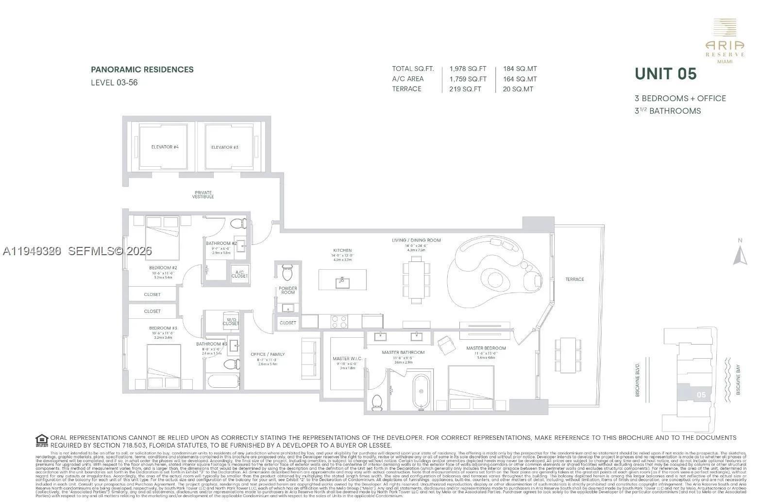 Ultra-luxury bayfront residence at Aria Reserve South Condo. Residence 505 offers 3 bedrooms, 3.5 baths plus den, featuring a refined flow-through design and private elevator entry with custom wood-paneled foyer. Floor-to-ceiling glass and a deep terrace capture direct, unobstructed Biscayne Bay views. High-level owner upgrades include architectural lighting throughout, custom window treatments, and fully built-out closets in all bedrooms. Contemporary kitchen with premium finishes; all bedrooms are en-suite. Resort-style amenities include spa and wellness center, indoor and outdoor fitness facilities, tennis and paddle courts, basketball court, pools, private theater, sky lobby, concierge and valet. Prime Edgewater location near the Design District, Wynwood, Brickell, Downtown Miami, and Miami Beach. Offered unfurnished; furniture negotiable. Second parking space available and negotiable.