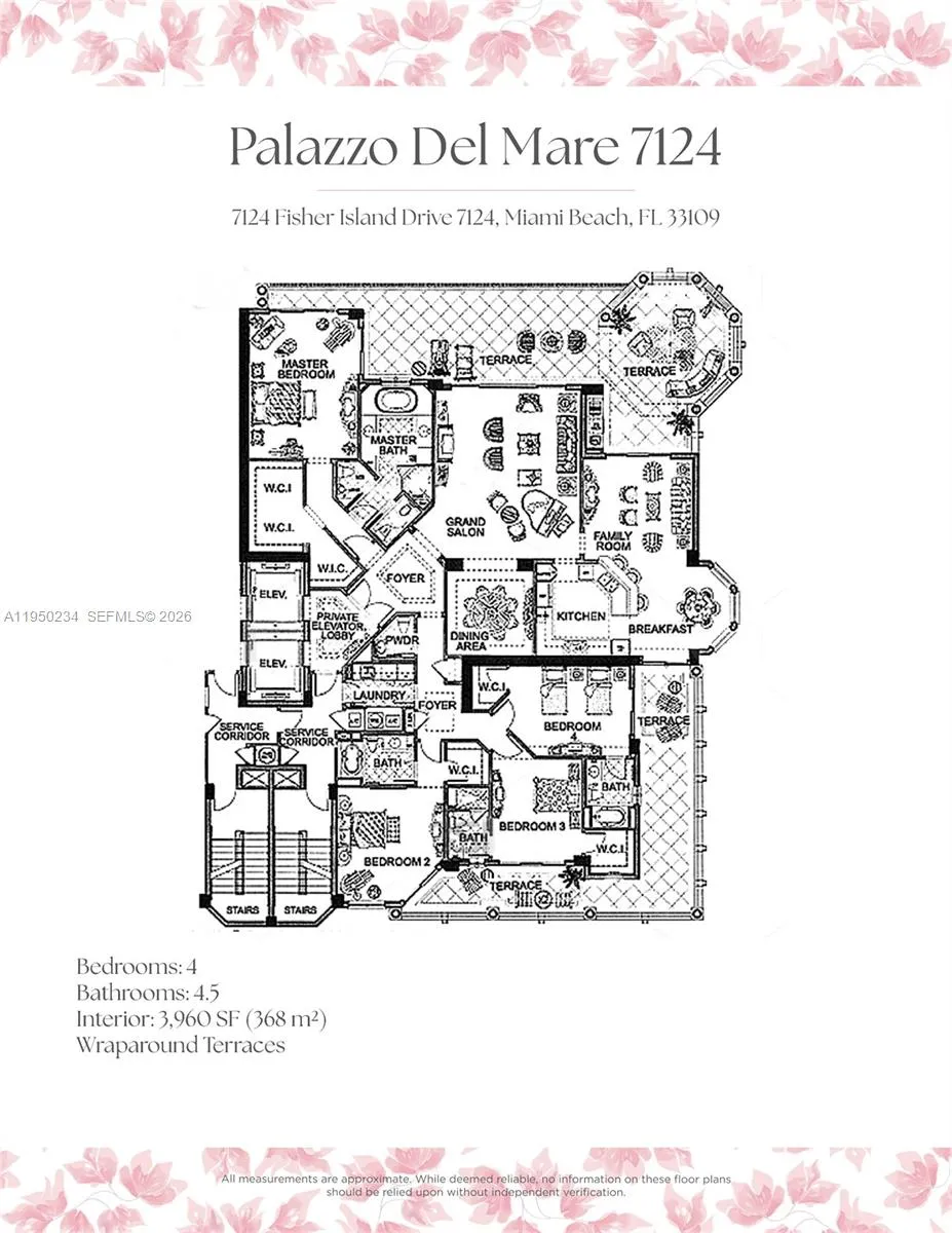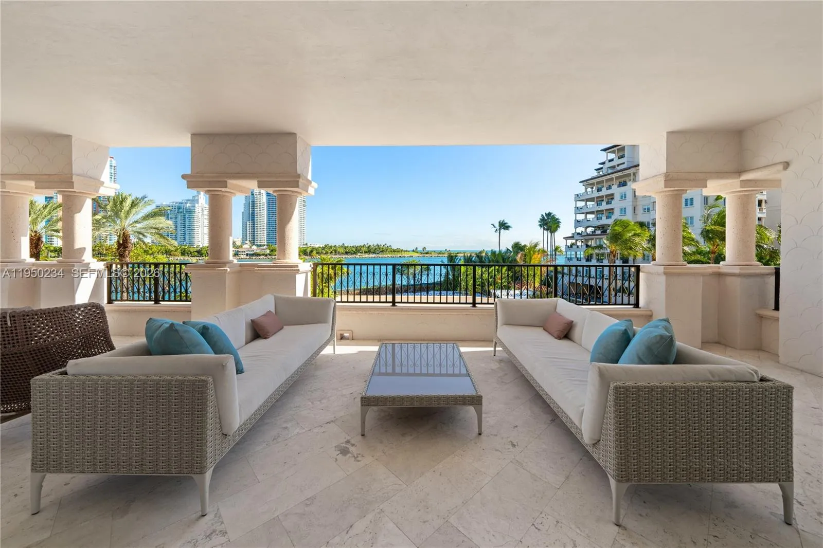 SOUTH-EAST CORNER RESIDENCE ON FISHER ISLAND WITH SWEEPING VIEWS OF MIAMI BEACH, GOVERNMENT CUT, AND THE OCEAN AT THE NEW FULL-SERVICE PALAZZO DEL MARE DESIGNED BY AGUSTO BUSNELLI! Private elevator foyer leads into this 4 bedroom + 4.5 bath residence spanning 3,960 SF of interior living space with elegant wood & white large glass porcelain floors & over 1,000 SF of wraparound terraces. Gourmet kitchen with breakfast area equipped with a Sub-Zero refrigerator & wine fridge, Miele dishwasher, Gaggenau 2 ovens, stovetop & coffee maker. Oversized LG Washer & Dryer. Primary Bedroom with sunrise & ocean views. Expansive marble master bath with Waterworks fixtures, double vanities, soaking jet tub, steam shower & 2 toilet rooms. Automated window treatments. 2 assigned parking spaces, golf cart + Valet. Situated within a Boutique 5 star service building with only 27 residences. Enjoy world-class brand new Italian designed amenities including a private heated swimming pool, aperitivo bar, state-of-the-art fitness center, spa, sauna, steam rooms & a media room. Live the Relaxed & Sophisticated Fisher Island Lifestyle on 216 Acres featuring World-Class 5-Star Amenities including The Fisher Island Club, Vanderbilt Mansion Clubhouse, Spa, Top-rated Private School, 8 Restaurants, Golf Course, Aviary, 2 Marinas, New Beach & Yacht Club, 1-Mile Long Private Beach, Racquet Club with 17 Grand Slam Courts, 4 Pickleball & Padel Courts, Town Center with an Island Gourmet Market.