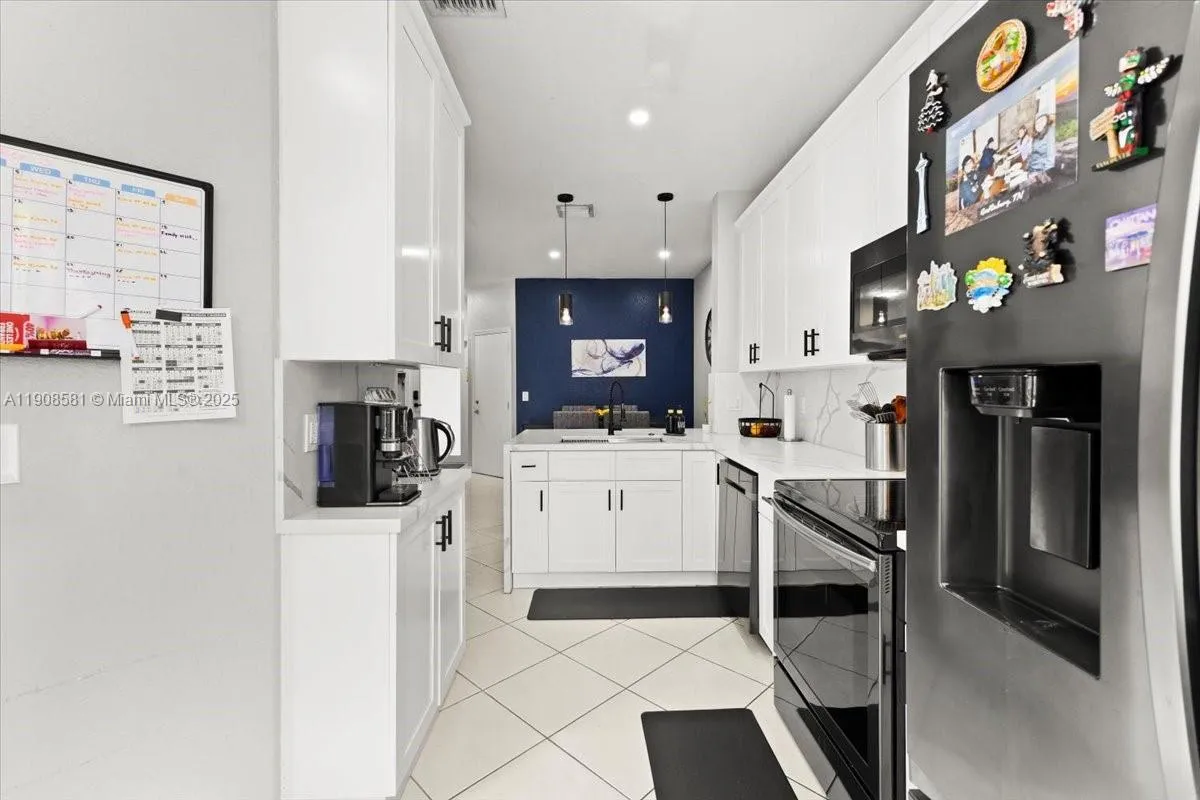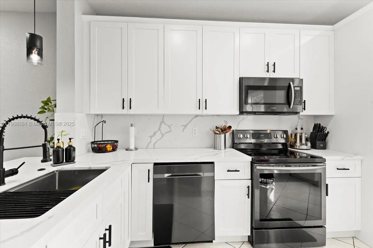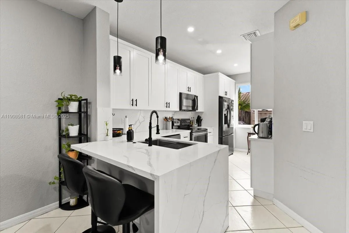 Gorgeous 3 Bed / 2.5 Bath townhouse offering over 1,400 sq. ft. of comfortable living space. This home features neutral tile flooring on the first floor and elegant wood floors upstairs. The bright, fully renovated kitchen boasts all-white cabinetry, matching Whirlpool appliances, and a modern design perfect for any home chef.rnEnjoy peace of mind with impact windows, a brand-new roof, and a private one-car garage with a driveway for 2 vehicles. The spacious master suite includes a large walk-in closet and a luxurious Roman tub. Full-size washer and dryer included.rnCommunity amenities feature gated entry with security cameras, two heated pools, and a playground. Pets are welcome. FHA/VA approved.