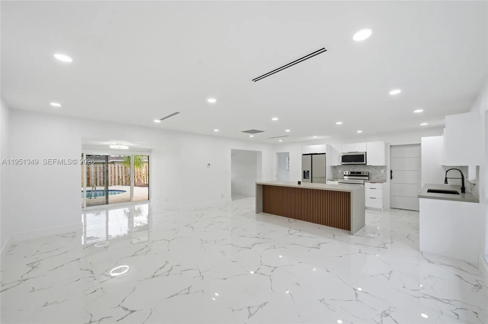 Stunning fully renovated 3-bedroom plus den, 2-bathroom residence designed with modern elegance and thoughtful upgrades throughout. This home features brand-new flooring, a new roof, impact-resistant windows, impact doors, and impact garage doors, offering both style and peace of mind.rnrnThe sleek kitchen is highlighted by quartz cement countertops and contemporary finishes, while modern linear A/C vents enhance the home’s clean architectural aesthetic. Built-in Bluetooth speakers in both bathrooms elevate everyday living.rnrnStep outside to your private backyard oasis complete with a pool and outdoor shower, perfect for entertaining or relaxing. Ideally located in a highly desirable area near top-rated schools, dining, shopping, and just 15 minutes from the beach.