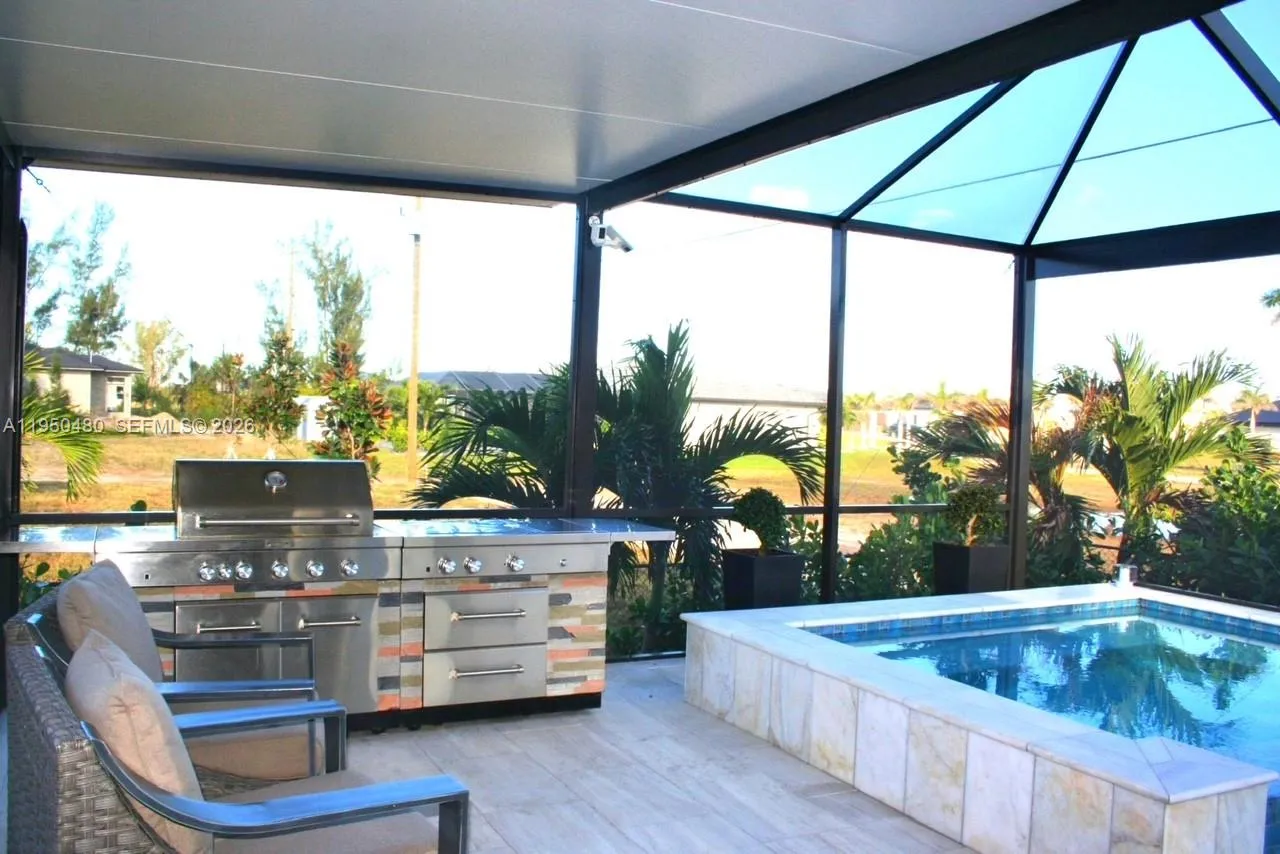 Experience comfort, style, and exceptional value in this 4-bedroom, 2-bath single-family home boasting an open-concept layout with high ceilings, elegant formal dining space, and a well-appointed kitchen featuring granite countertops, Whirlpool stainless steel appliances, Moen fixtures, and LED lighting. Ideal income-producing property with Airbnb zoning, turnkey and fully furnished. Perfect for investors or buyers seeking additional income opportunities. Additional upgrades include a reverse osmosis system, has solar panels and a battery backup system, smart-home controls (solar, pool, alarm, and cameras), and a Wi-Fi garage opener. The battery backup system provides peace of mind during storms. Enjoy a private fenced backyard with a heated saltwater pool and spa, screened lanai, and manicured landscaping perfect for relaxing and entertaining. Prime location in Cape Coral, approximately 5 miles from Burnt Store Marina and close to schools, dining, and entertainment.