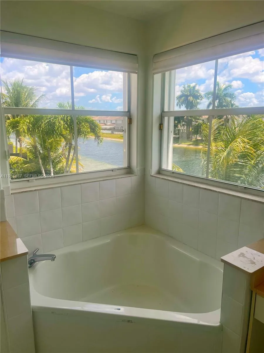 Doral waterfront beauty in Biarritz gated community Complex. Spacious 2,648 square foot, 2-story, 4 bedrooms and 3 1/2 baths partially furnished home. Water views from every room facing south. One bedroom on first floor for added convenience. Open floor plan in kitchen/family room. High ceiling in Living/dining room area. Features include full size washer/dryer, accordion hurricane shutters, two 4-ton central a/c systems, his/her walk in closets and bathroom vanities in master bedroom. Convenient seating area upon entering the large master bedroom. Minutes to expressways, Dolphin and International malls. Virtual tour available.
