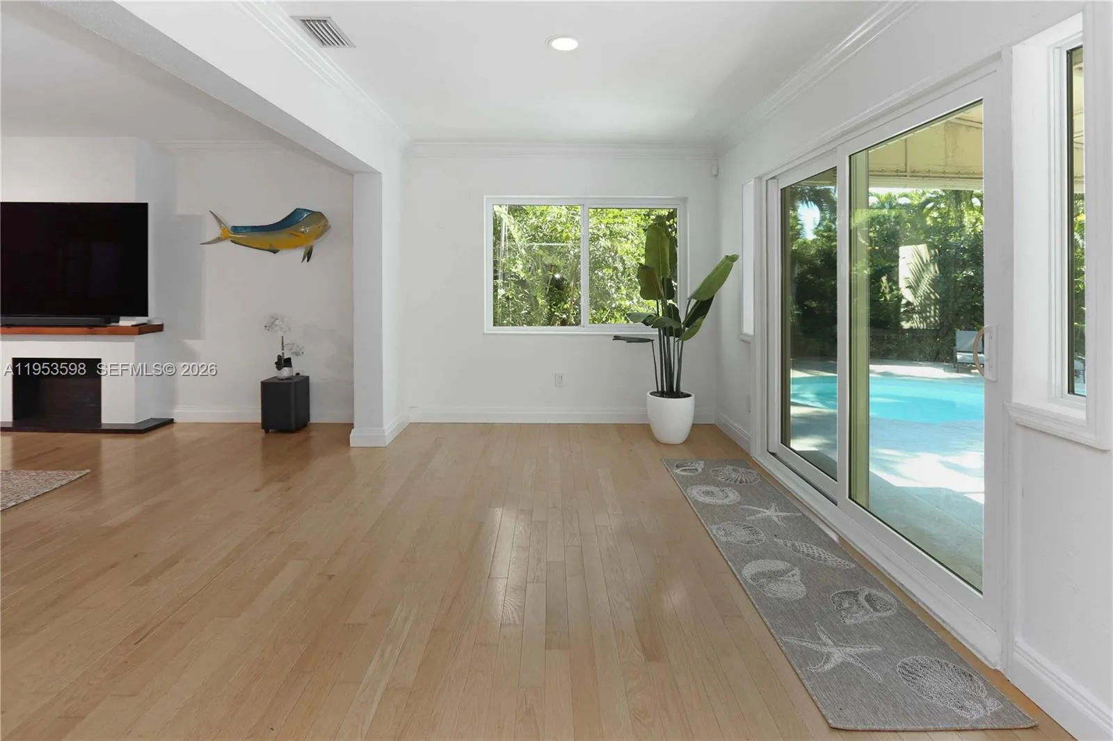 Located in the highly sought-after Hollywood Lakes neighborhood, this beautifully maintained 3-bedroom, 3-bath pool home sits on a rare double lot, offering an exceptional blend of space, comfort, and South Florida lifestyle. The home features a bright, open floor plan with wood flooring and crown molding throughout, creating a warm and inviting atmosphere. A separate den with French doors provides flexible living space ideal for a home office, media room, or guest area.rnrnThe kitchen is thoughtfully designed with stainless steel appliances, an oversized refrigerator, and seamless flow into the spacious family room. Expansive windows and double French doors frame tranquil views of the pool and open fully to the outdoor deck, allowing for effortless indoor-outdoor living and entertaining.rnA circular driveway provides ample parking, while the private backyard offers a true tropical retreat with a resort-style pool and expansive deck, ideal for entertaining or enjoying peaceful outdoor living.rnrnThis energy-efficient home includes all hurricane impact windows, a 3-year-old metal roof, solar panels, a new pool pump, and new pool deck and pavers completed in 2025. Ideally situated just blocks from Hollywood’s main shops, minutes from the beach, and only two blocks from the golf club, the location is truly unbeatable.