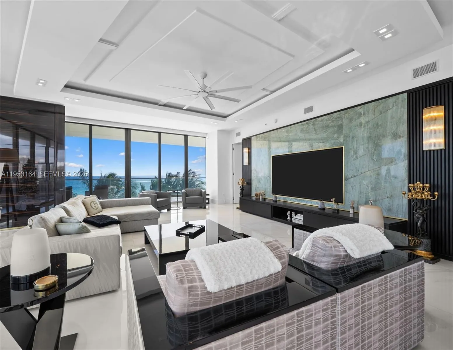 One-of-a-kind, turnkey direct oceanfront residence curated and furnished by the world-renowned Armani Design Team, following a $1.5M bespoke renovation. Located on the tower’s most desirable oceanfront line, this exceptional home offers 3,014 SF of interior living with 4 bedrooms, 5.5 bathrooms, plus service quarters.rnFeatures include elegant marble floors, custom Armani millwork, and a signature Armani Dada kitchen. The primary suite includes a luxury custom-built walk-in closet with premium cabinetry and finishes.rnA spacious wraparound terrace creates seamless indoor-outdoor living with unobstructed Atlantic Ocean views, ideal for entertaining and everyday enjoyment. The terrace is equipped with a summer kitchen, enhancing the outdoor living experience.rnA prestigious Beach Cabana #14 is available as a separate purchase , offering a private beachfront retreat.